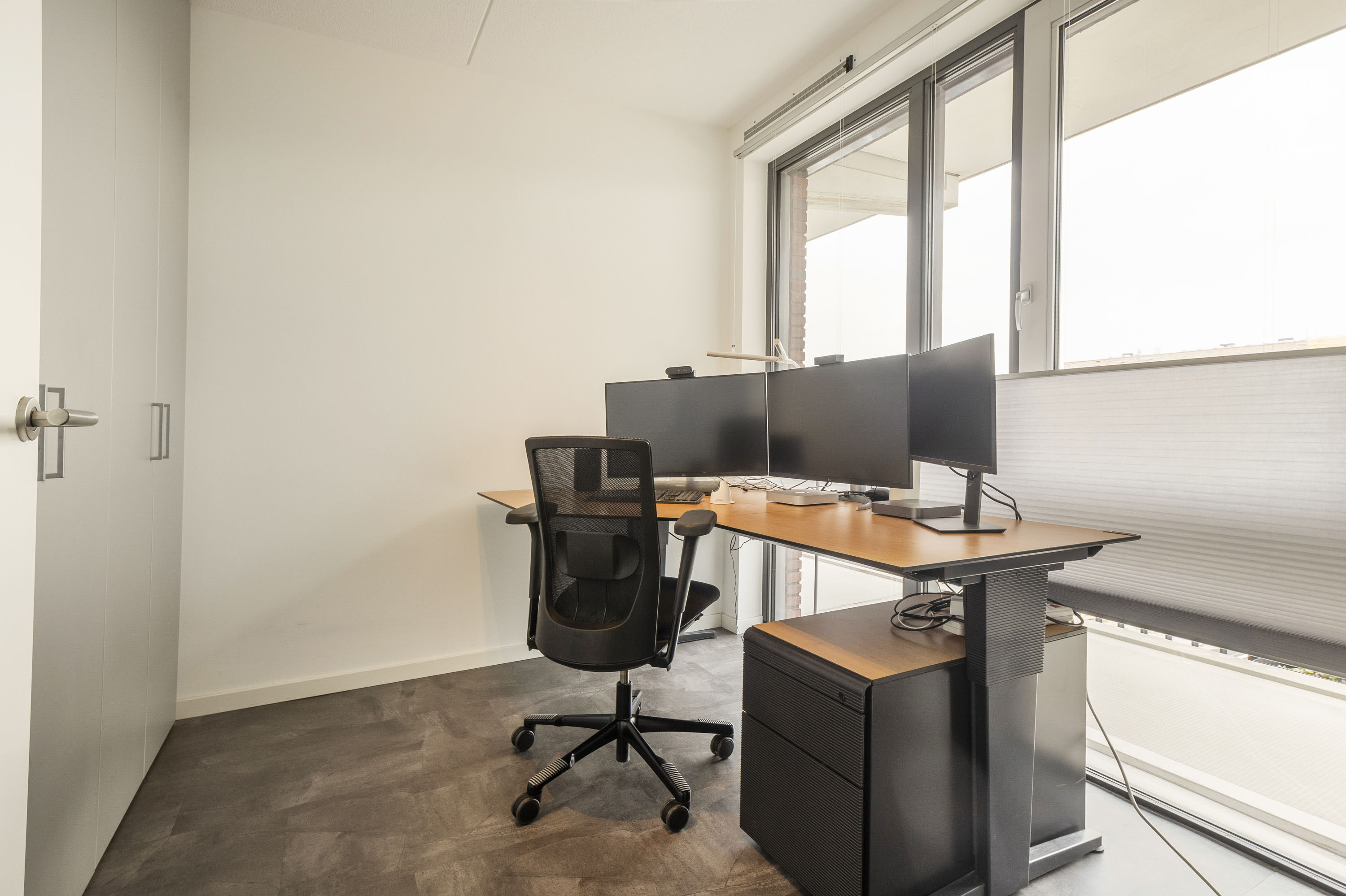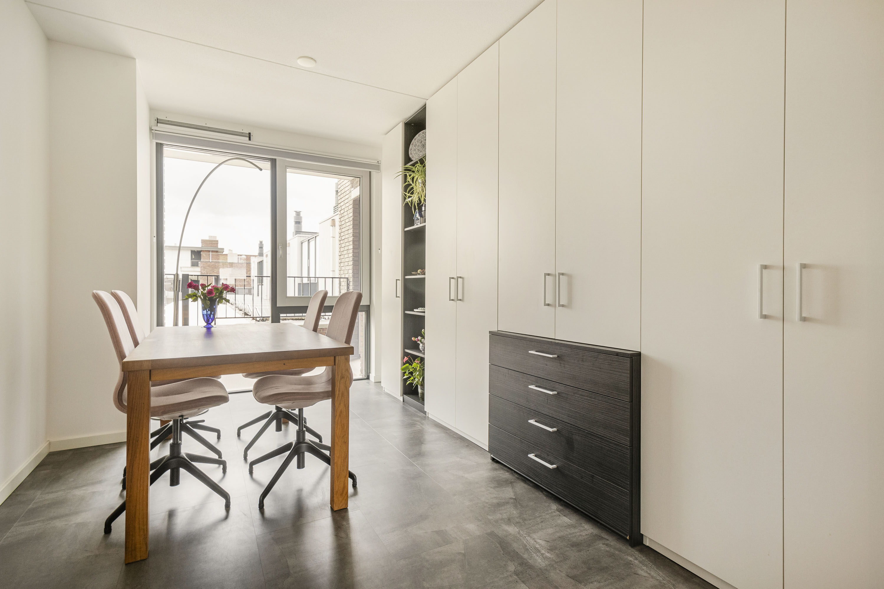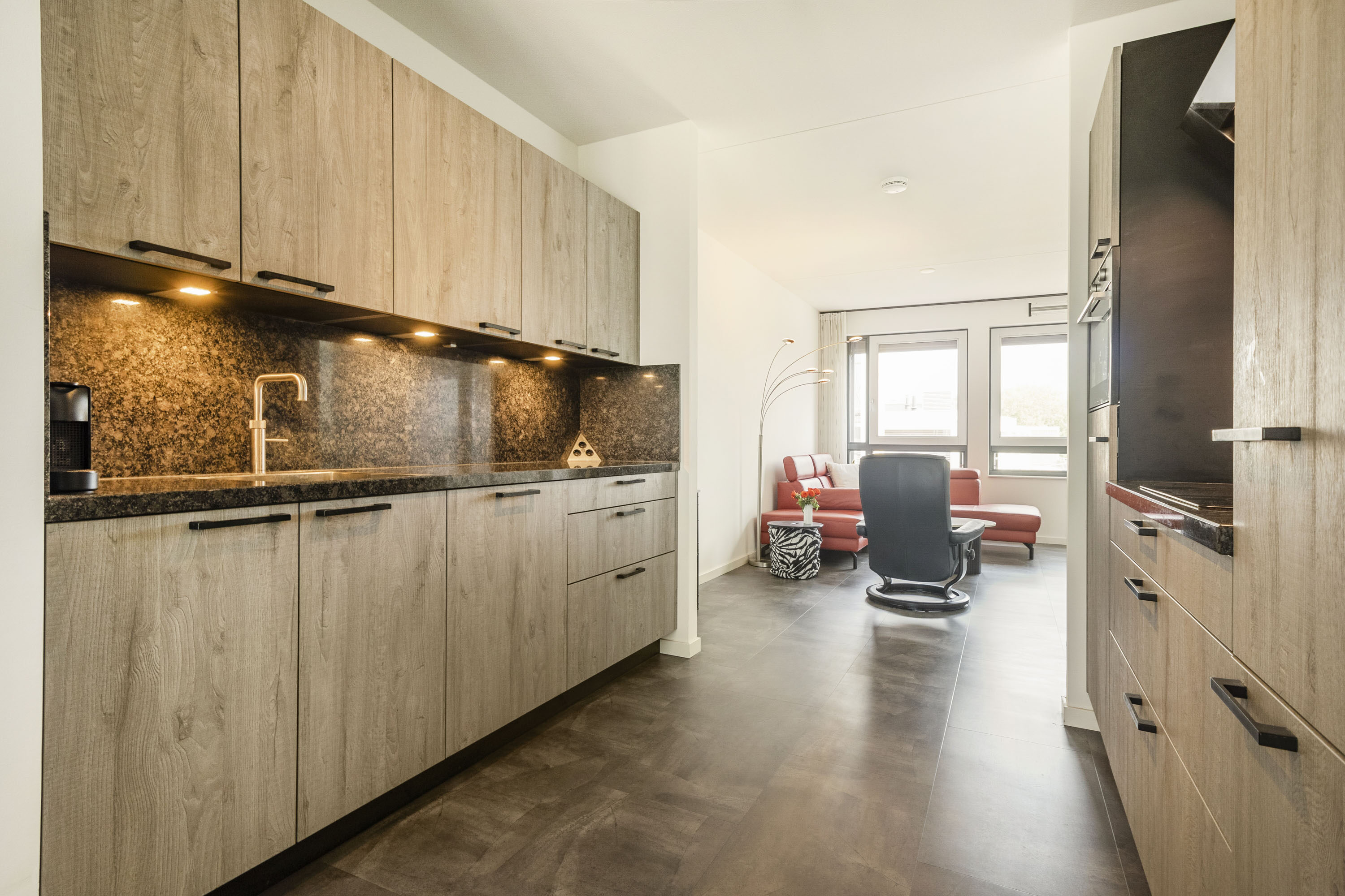 Het appartement is bereikbaar met zowel de lift als de trap. Je komt binnen in de lichte woonkamer waar het daglicht rijkelijk naar binnen valt. (Zie artist impressions om een idee te krijgen hoe de woon- / eetkamer eruit komt te zien, als de slaapkamer naar de galerijkant wordt verplaatst waar nu huidige eetkamer is gepositioneerd). Vanuit hier kijk je langs het gemeentehuis de straat uit. De keuken is centraal in de leefruimte geplaatst, waardoor je tijdens het koken altijd contact hebt met de eetkamer en woonkamer. De keuken is compleet uitgerust met inductiekookplaat, afzuigkap, combi-oven, koelkast, vriezer, vaatwasser, Quooker en veel opbergruimte. In de eetkamer bevindt zich een vaste kastenwand voor extra opslag. (Zie artist impressions voor de mogelijkheden om hier een slaapkamer van te maken).