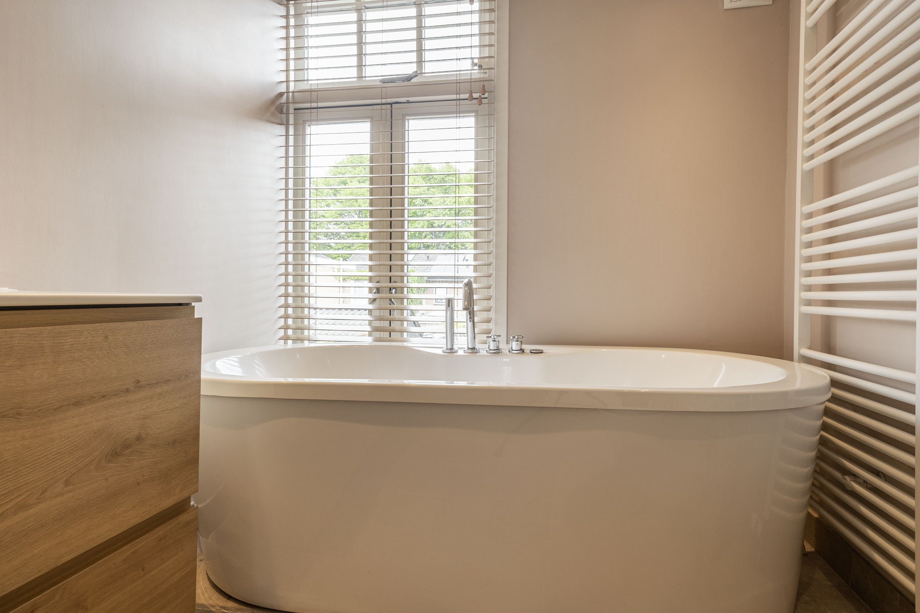 Een ruime overloop (ruim 9 m²) geeft je toegang tot 3 slaapkamers, de badkamer en trapopgang naar de 2e verdieping. De master bedroom is 16 m2 groot, gelegen aan de achterzijde van de woning en wordt door 2 raampartijen (achter- en zijkant) voorzien van veel daglicht. Tevens aan de achterzijde gelegen bevindt zich de in 2016 vernieuwde badkamer. De complete badkamer is ruim 6 m² groot, uitgevoerd met vloerverwarming, designradiator, ligbad, inloopdouche, wastafelmeubel met lades, 2e toilet en zowel mechanische als natuurlijke ventilatie. Ook in de badkamer zien we een strak plafond met inbouwspotjes.