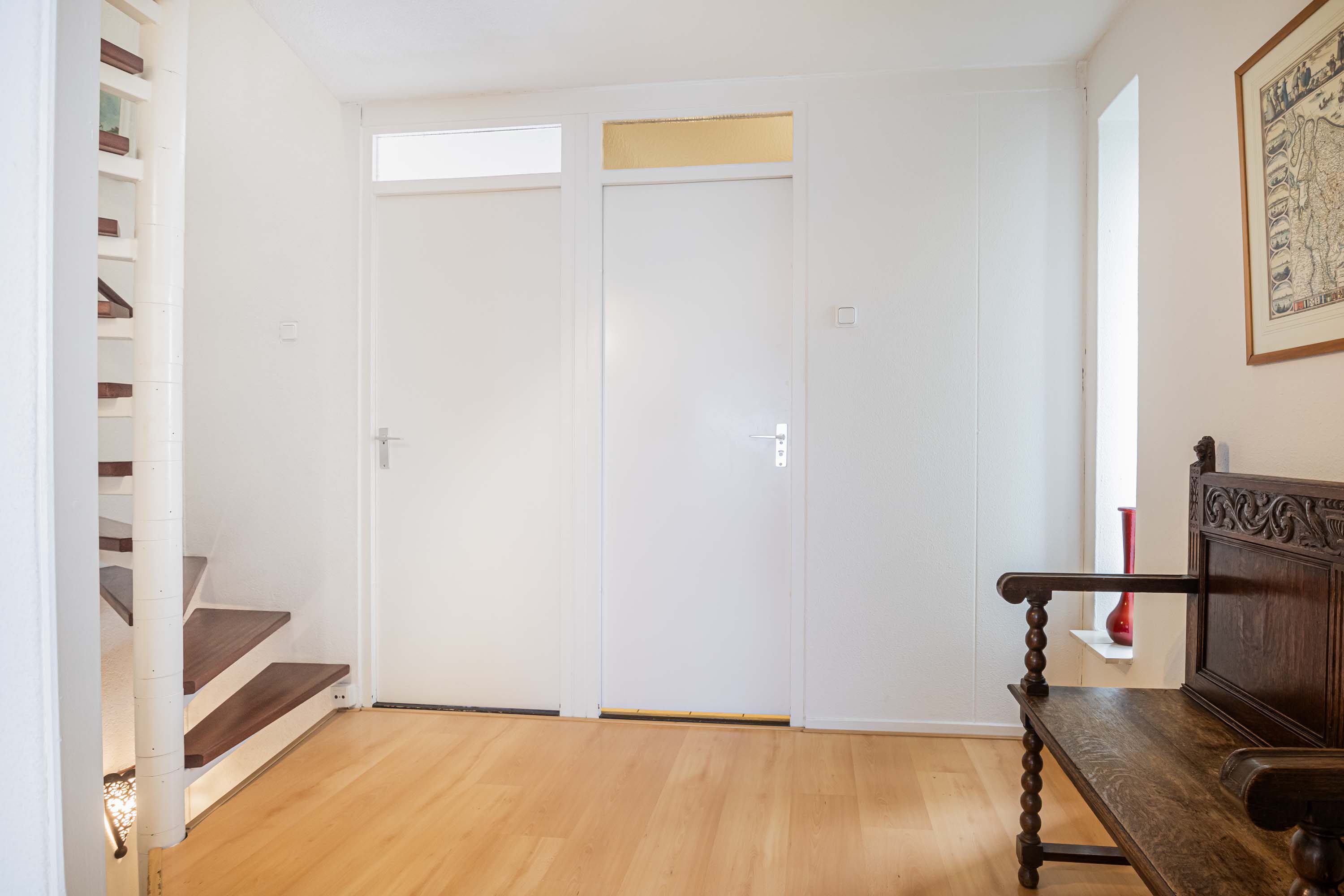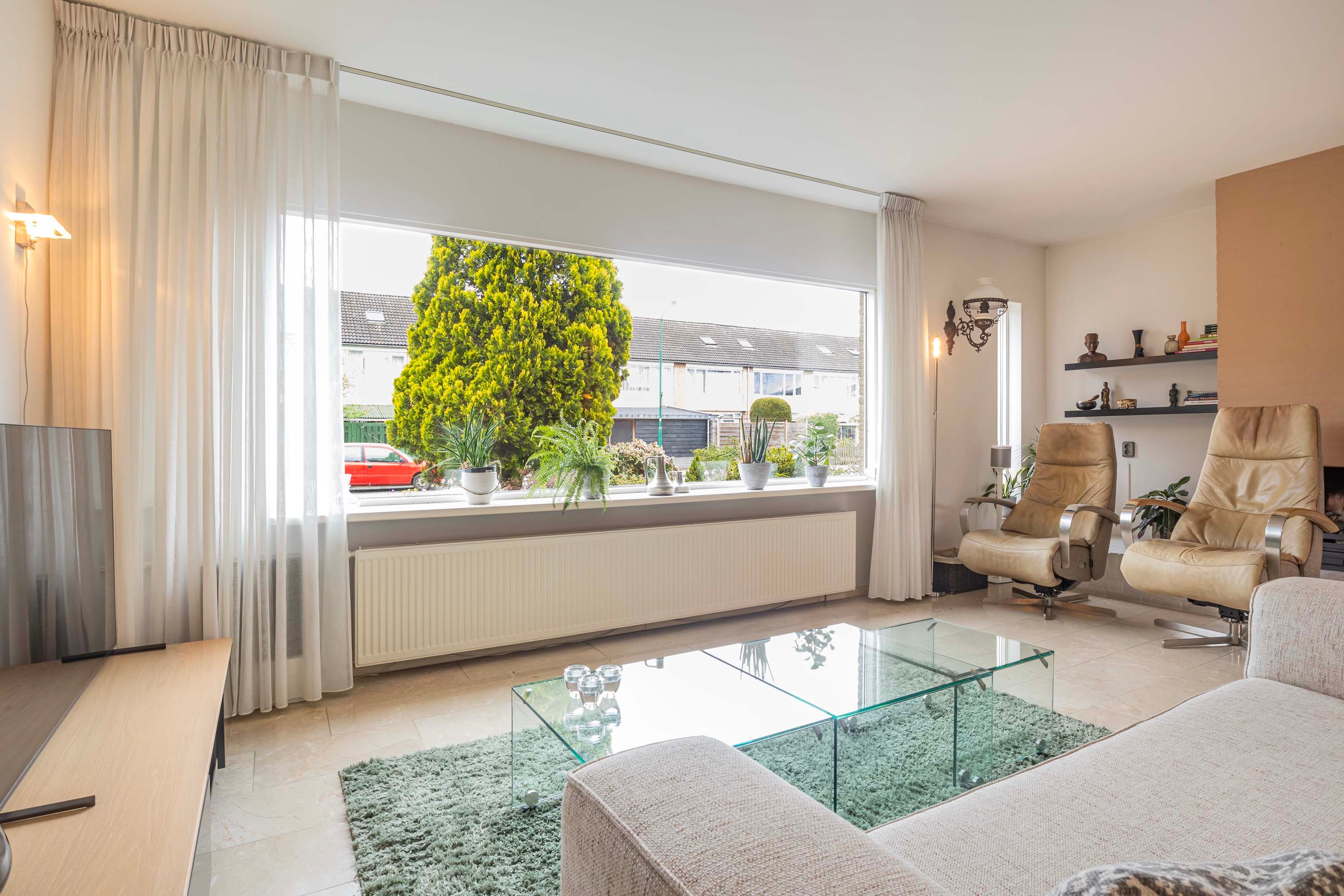 Hal entree, trapopgang naar de eerste verdieping, toiletruimte met zwevend toilet, garderobe en de meterkast. Straatgerichte woonkamer met open haardpartij, grote raampartijen voor veel daglichttoetreding en een tegenvloer. Vanuit de woonkamer heb je prettig uitzicht op de ruime voortuin met veel privacy aangezien de woonkamer niet direct grenst aan het voetpad.