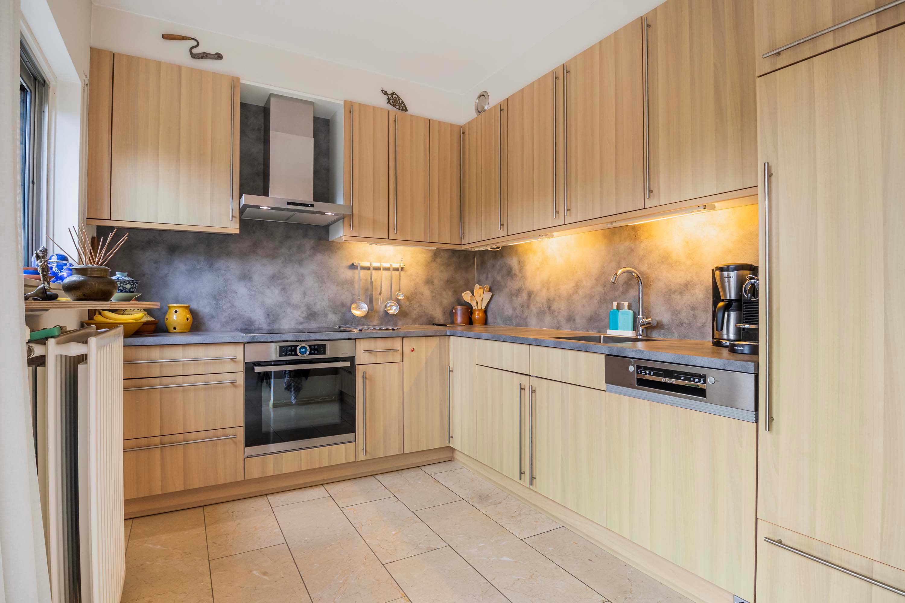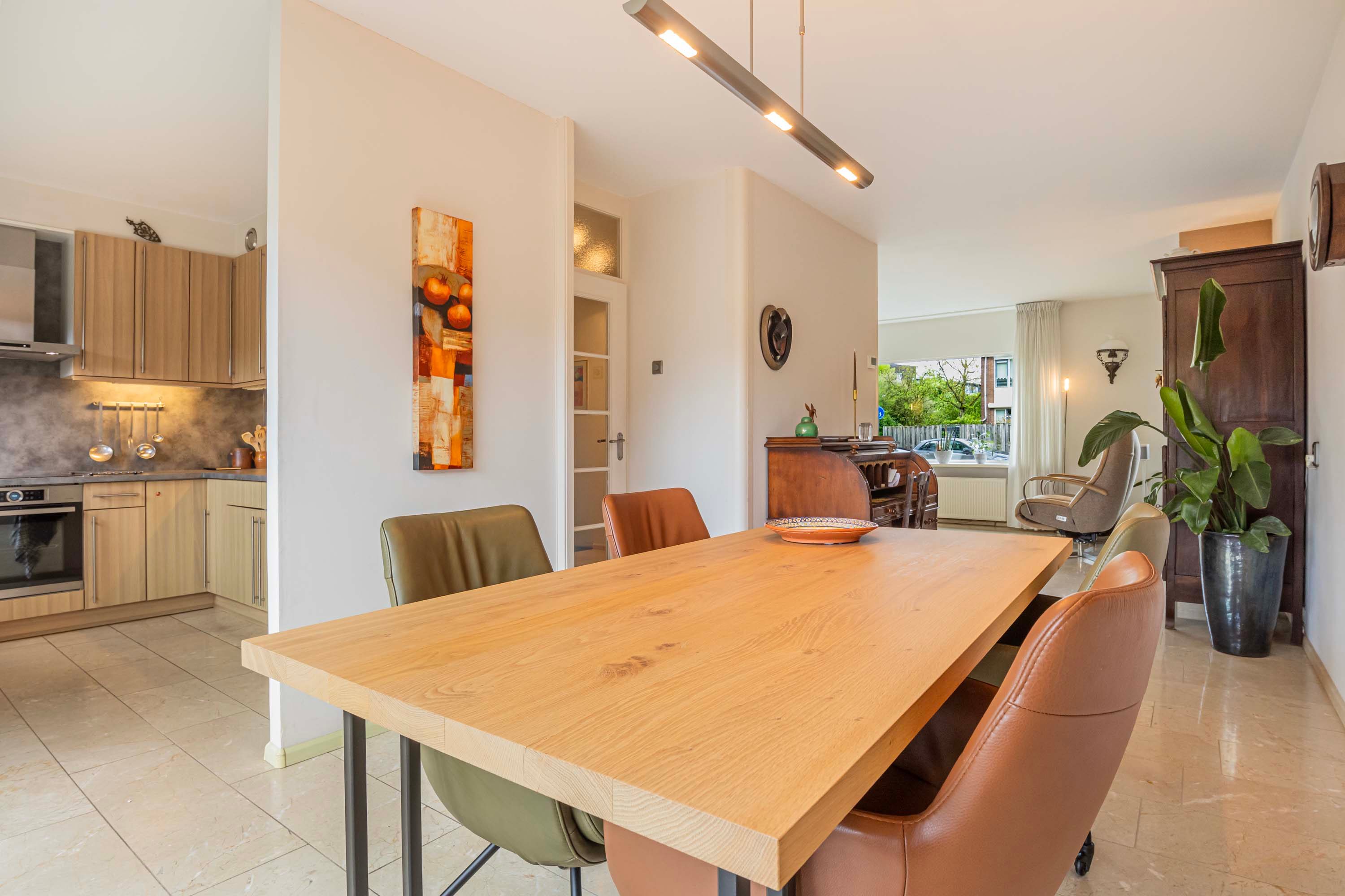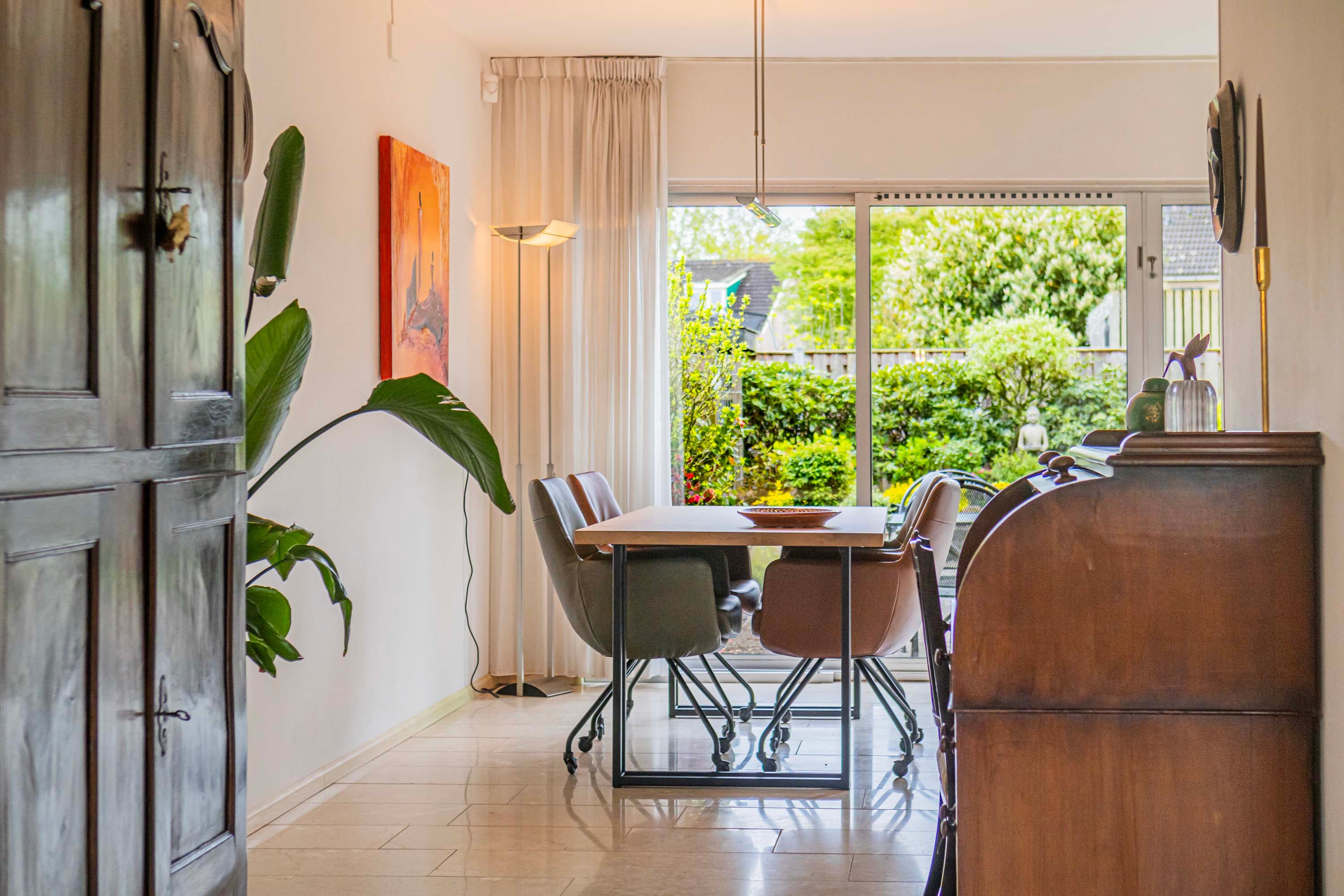 De half open keuken (2019) is samen met het eetgedeelte gelegen aan de achterzijde van de woning. Via een schuifpui is de ruime en zonnige achtertuin te bereiken. De half open keuken in een L-opstelling is uitgevoerd met het benodigde inbouwapparatuur zoals een combi-oven, inductiekookplaat met afzuigkap close-in boiler, vaatwasser (2022) en koelkast (2022). De huidige eigenaren hebben in de garage een separate vriezer neer gezet.