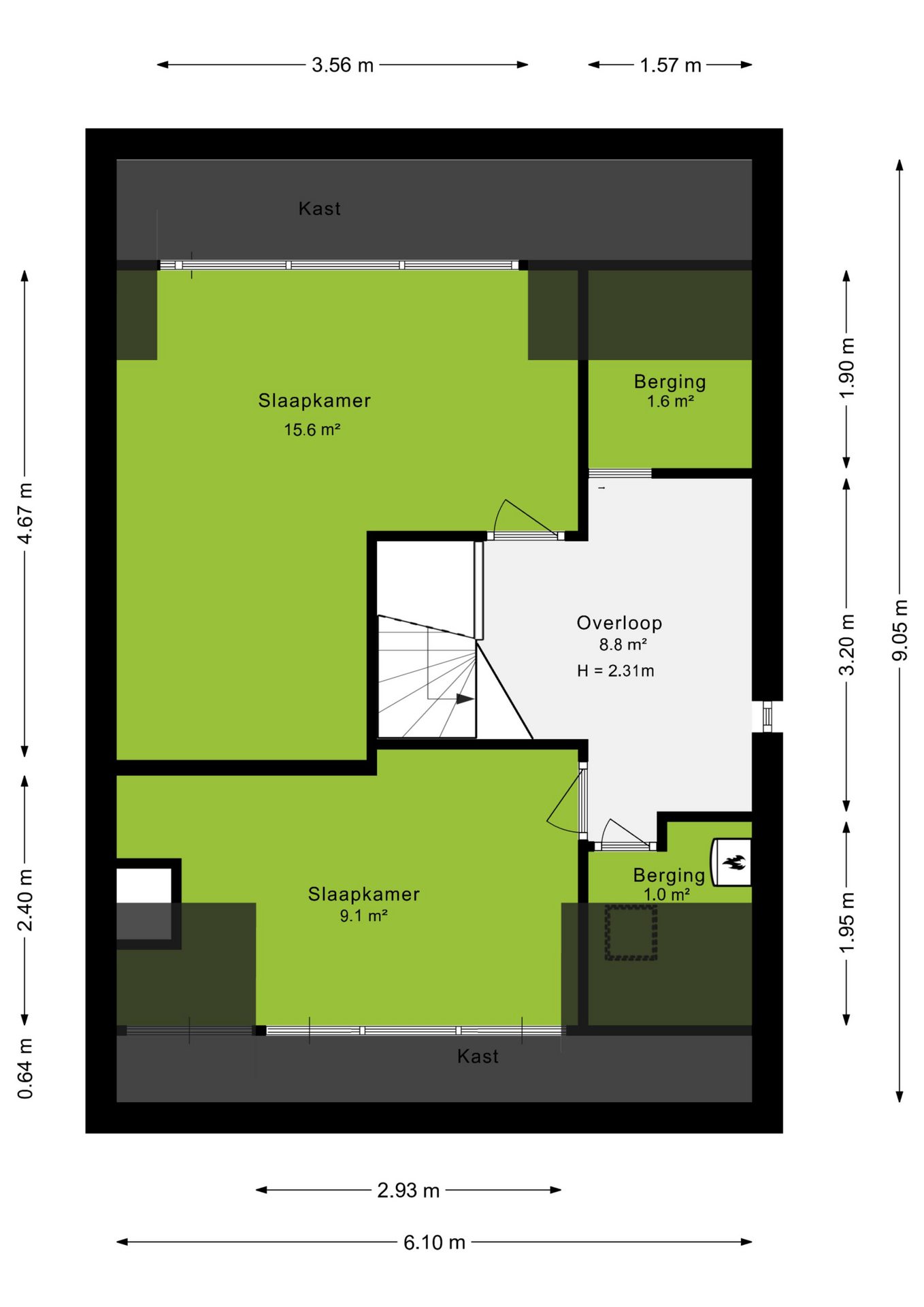 De 2e verdieping, wederom bereikbaar via een wenteltrap, is naast een kamerindeling ook al voorzien van 2 dakkapellen. Hierdoor beschik je op de 2e verdieping over een 4e en 5e slaapkamer, beide met 15,6 m² en 9,1 m² van een zeer prettig formaat. Vanuit de overloop zijn 2 bergingen te bereiken waarvan 1 met de Cv-installatie.
