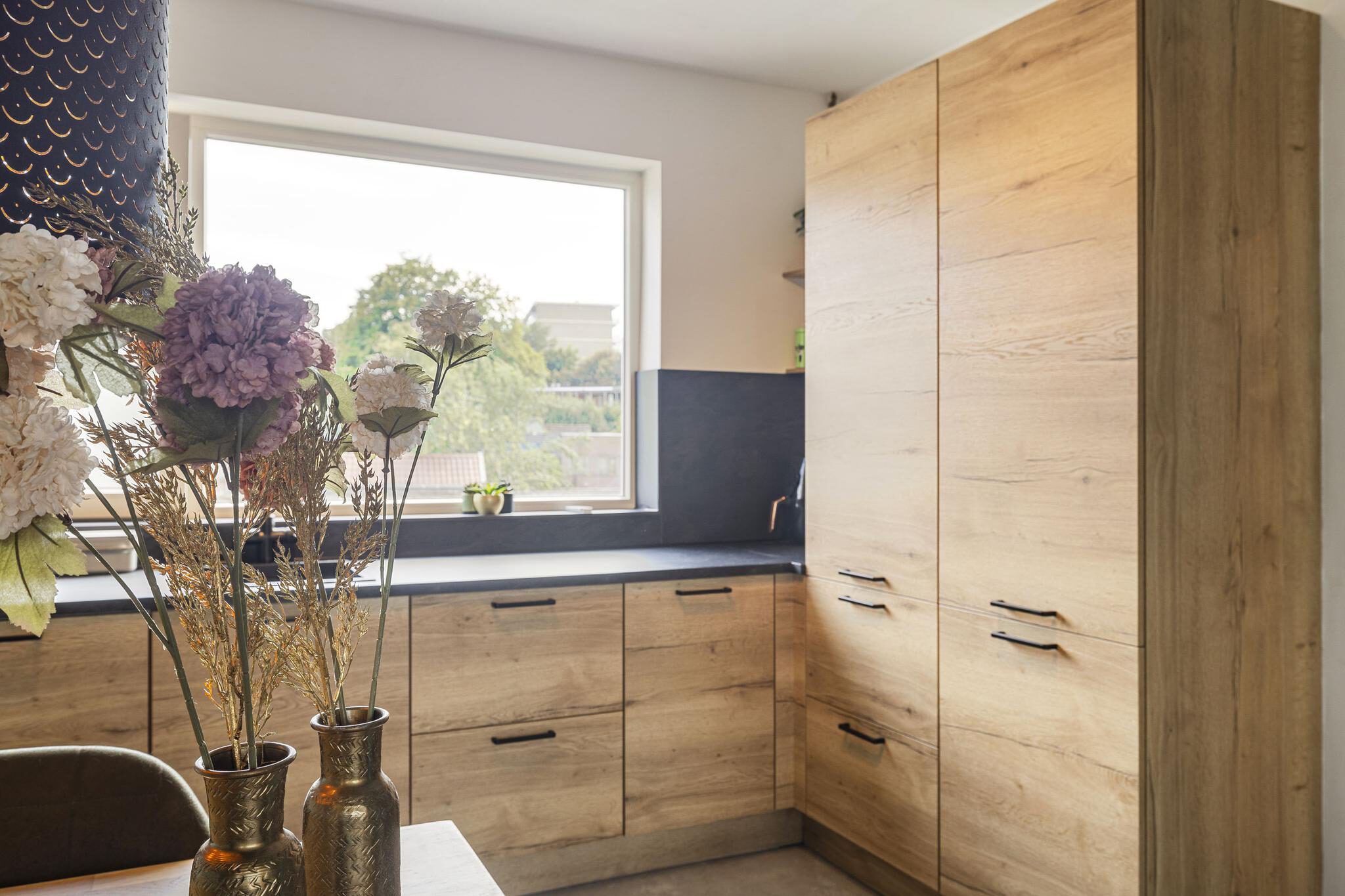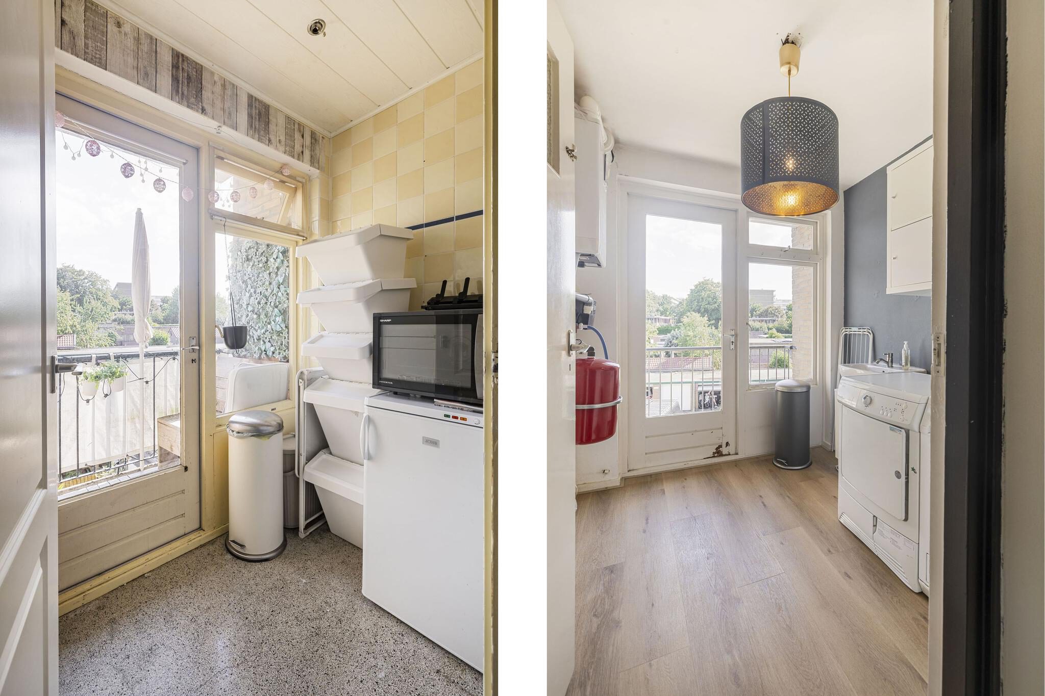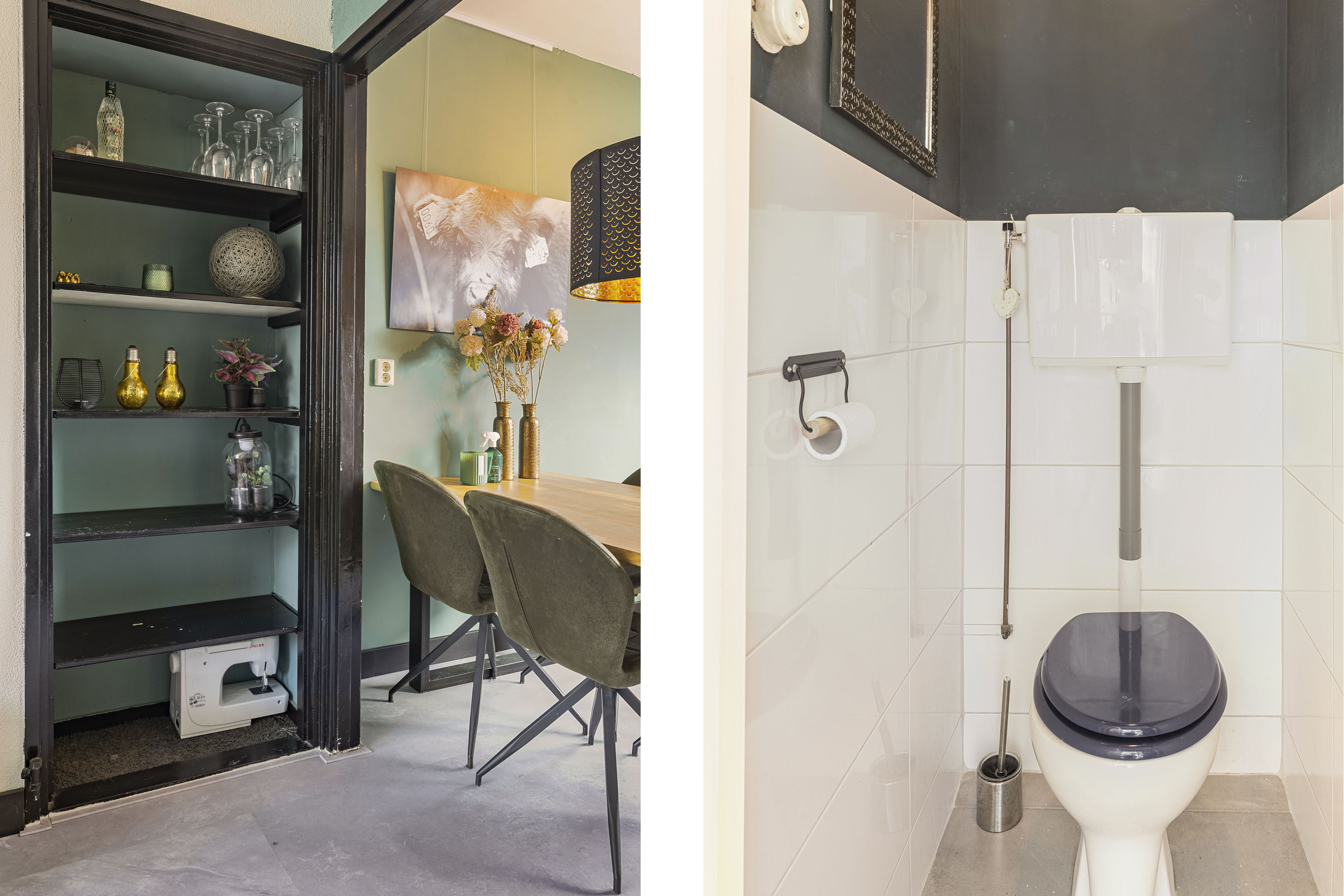 Via de eigen voordeur en trapopgang bereik je de woonverdieping. Hier tref je een nette hal met toegang tot het toilet, de vernieuwde badkamer (2023) en één van de zonnige balkons. De lichte woonkamer met extra zijgevelraam geeft een ruimtelijk gevoel. Aan de voorzijde ligt de moderne keuken met een inductiekookplaat, afzuigkap, vaatwasser en koelkast, afgewerkt met strakke lijnen. Het raam in de keuken is voorzien van een screen. De klik-PVC vloer op deze etage zorgt voor een rustige en moderne basis. De badkamer is vernieuwd in 2023 en is voorzien van een fraaie inloopdouche met een wastafelmeubel in houtlook.
