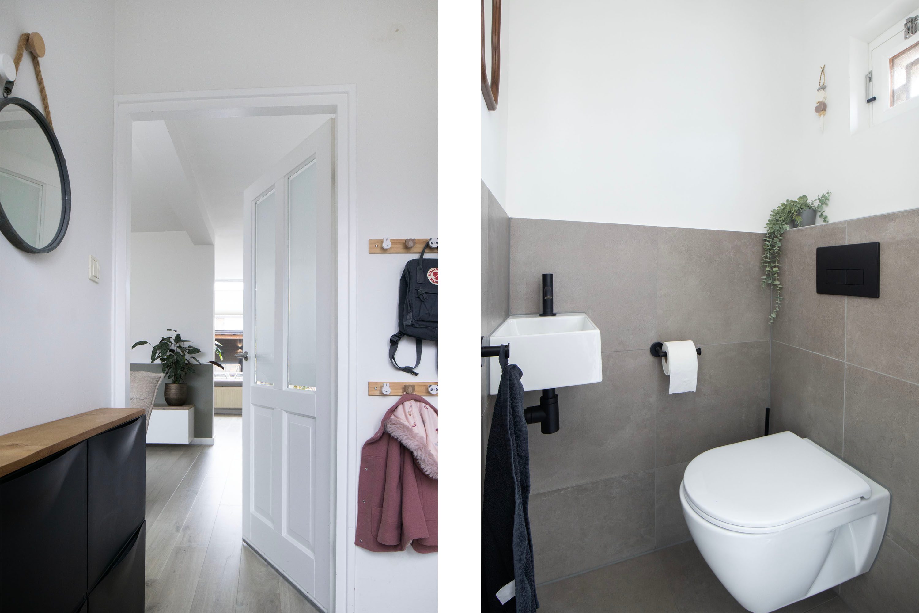 Via de ruime voortuin en het verhoogde entreeplateau kom je binnen in de hal met vernieuwde meterkast (3 fasen, 2025), modern toilet (2021) en toegang tot de woonkamer. Het toilet is strak uitgevoerd met een hangend closet en fonteintje.