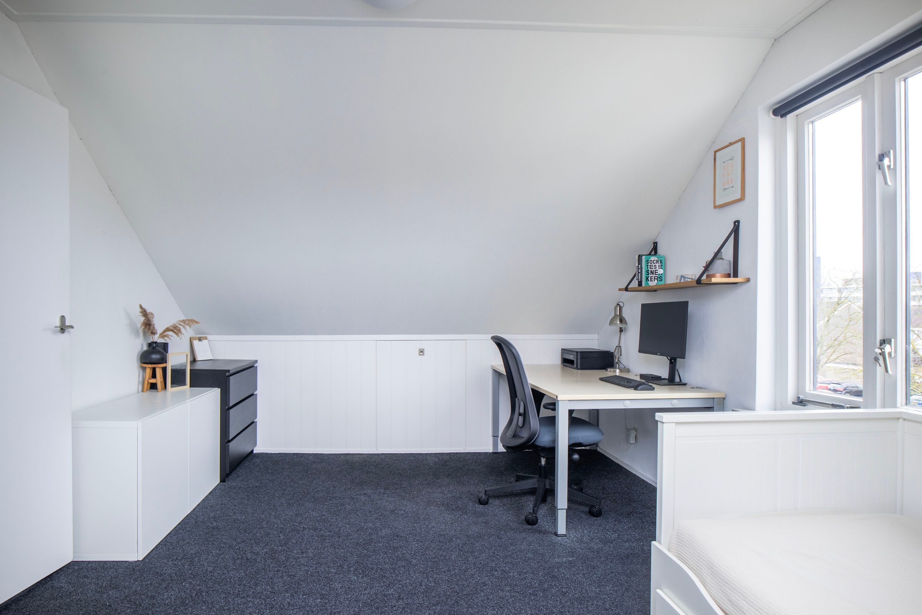 Via een vaste trap bereik je de ruime voorzolder met cv-opstelling (Nefit Proline NXT HRC 30, 2025), wasmachineaansluiting en dakraam. De vierde slaapkamer is verrassend ruim, beschikt over veel bergruimte achter knieschotten en is voorzien van een Velux dakraam. Deze verdieping is afgewerkt met vloerbedekking.