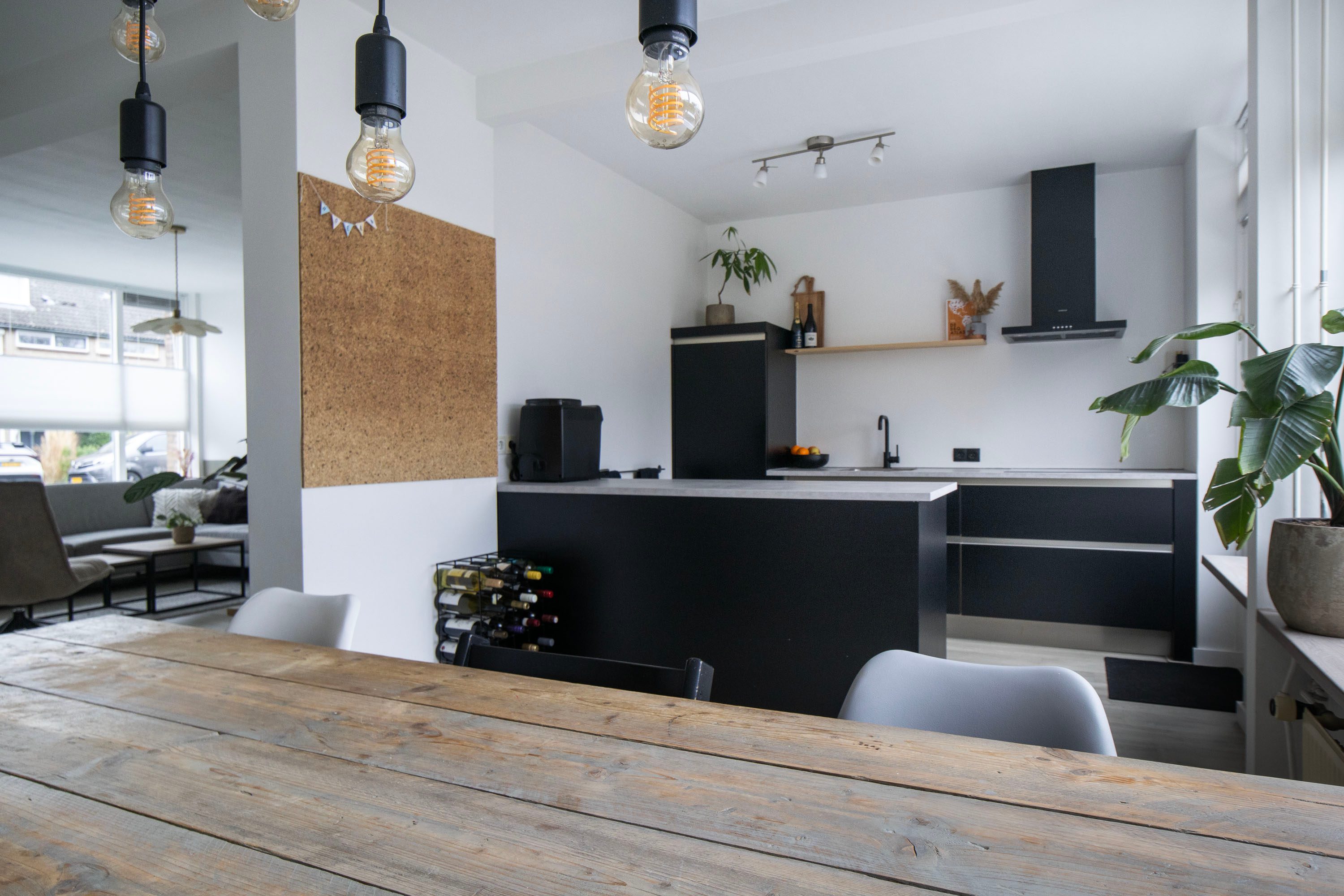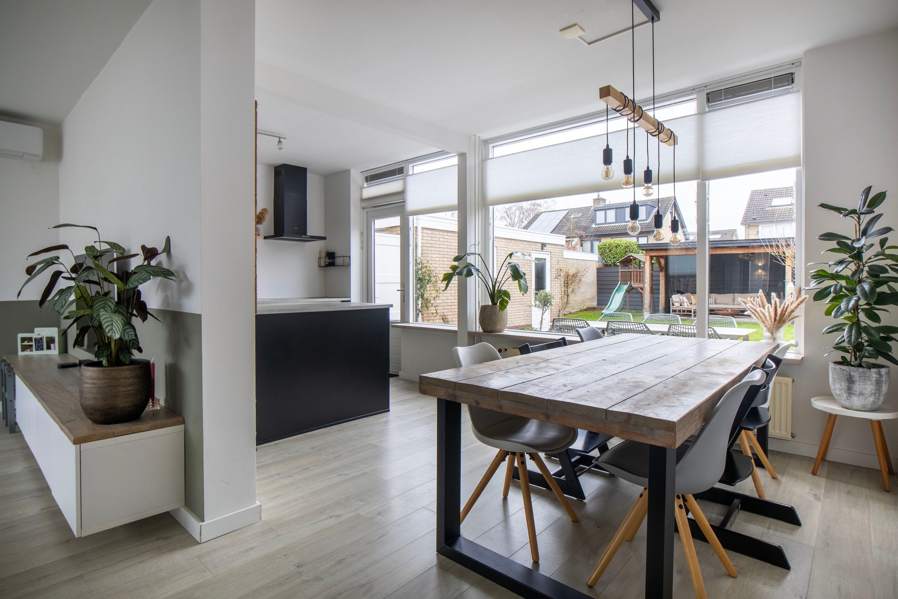 De sfeervolle Z-vormige woonkamer valt direct op door de grote raampartijen aan zowel de voor- als achterzijde, wat zorgt voor een prettige lichtinval gedurende de hele dag. De woonkamer is afgewerkt met een laminaat vloer en biedt volop ruimte voor een comfortabele zithoek aan de voorzijde en een royale eethoek aan de tuinzijde. Tussen beide zones is extra ruimte voor bijvoorbeeld een speelhoek of werkplek.