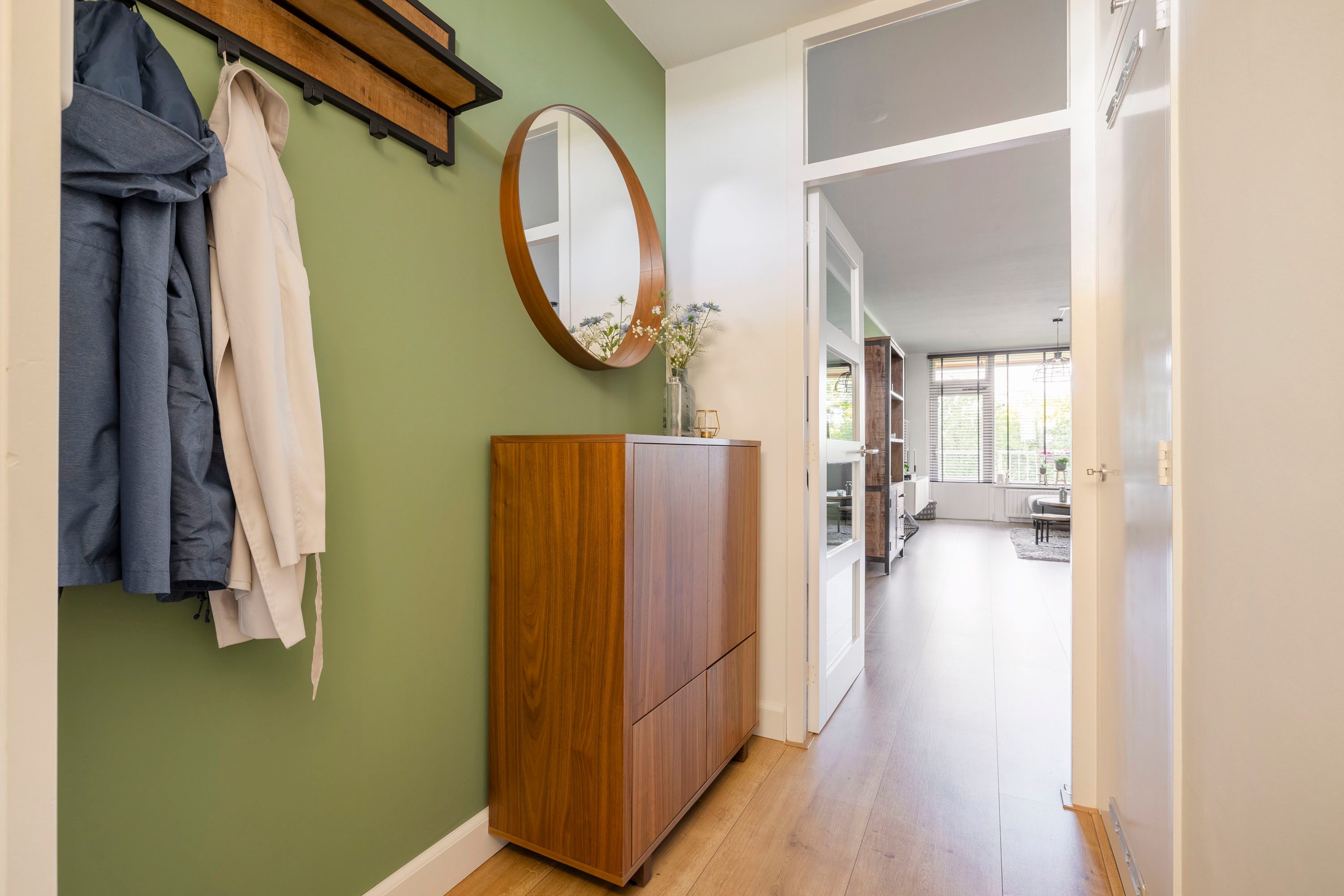 Een ruime entree met garderoberuimte en vernieuwde meterkast brengt je via een toegangsdeur naar de leefruimte. Wat gelijk opvalt is de speelse indeling van het appartement. Twee slaapkamers aan de achterzijde, een kleinere slaap-/werkkamer aan de voorkant (galerij), een ruime woon-/eetkamer als centraal punt (door de huidige eigenaren in gebruik als extra werkplek) en een open keuken aan de voorzijde. De badkamer ligt centraal tussen de drie slaapkamers.