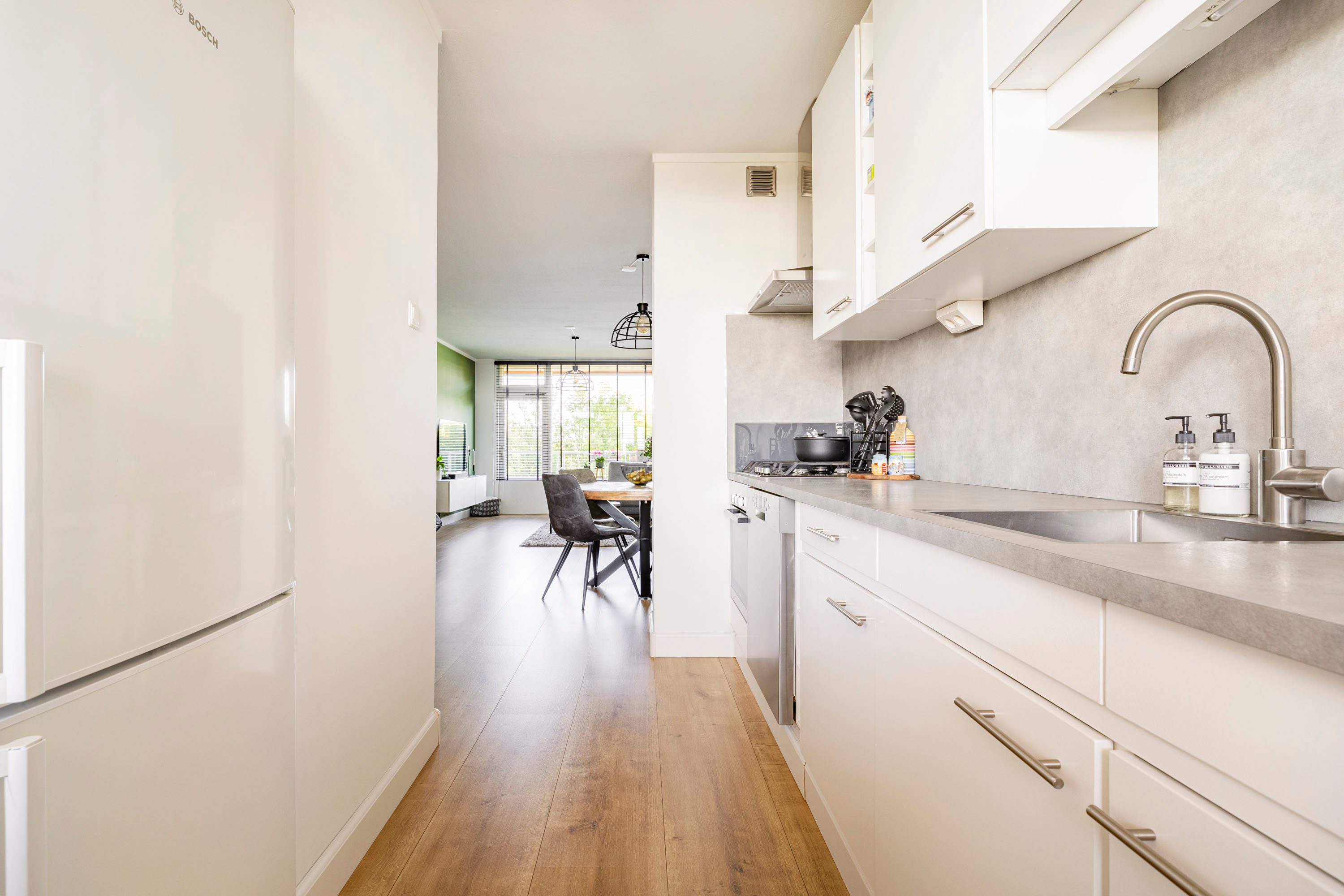 Eenmaal in de woon-/eetkamer vallen gelijk aan aantal dingen op: het is speels ingedeeld, grote raampartijen met veel daglichttoetreding (HR++), een breed en zonnig balkon, een ruime en verzorgde open keuken (2020) met witte fronten, betonlook aanrechtblad en het benodigde inbouwapparatuur en uiteraard het formaat van de woon-/eetkamer.