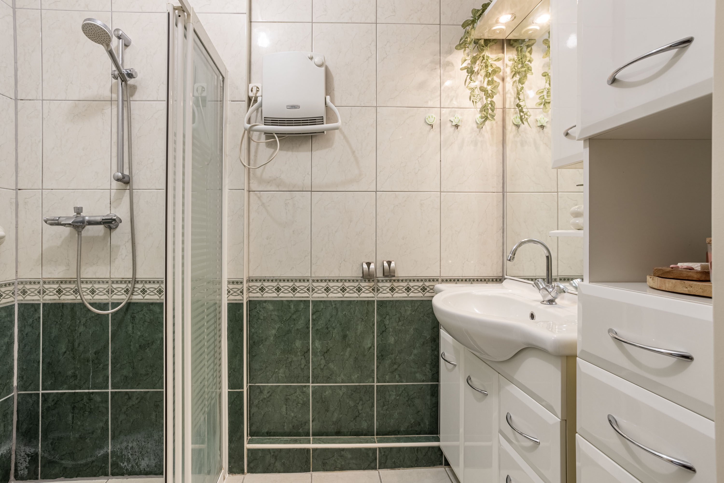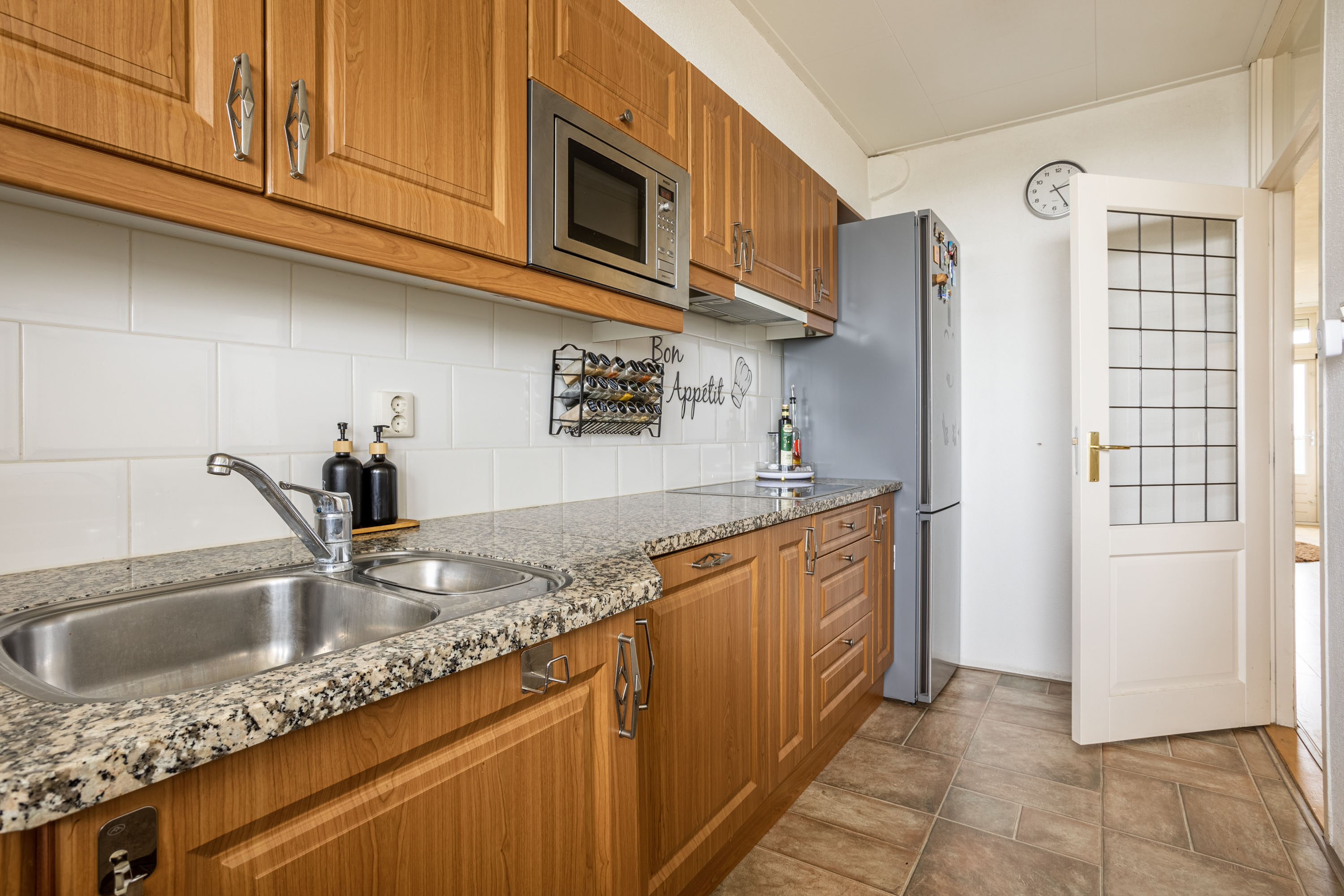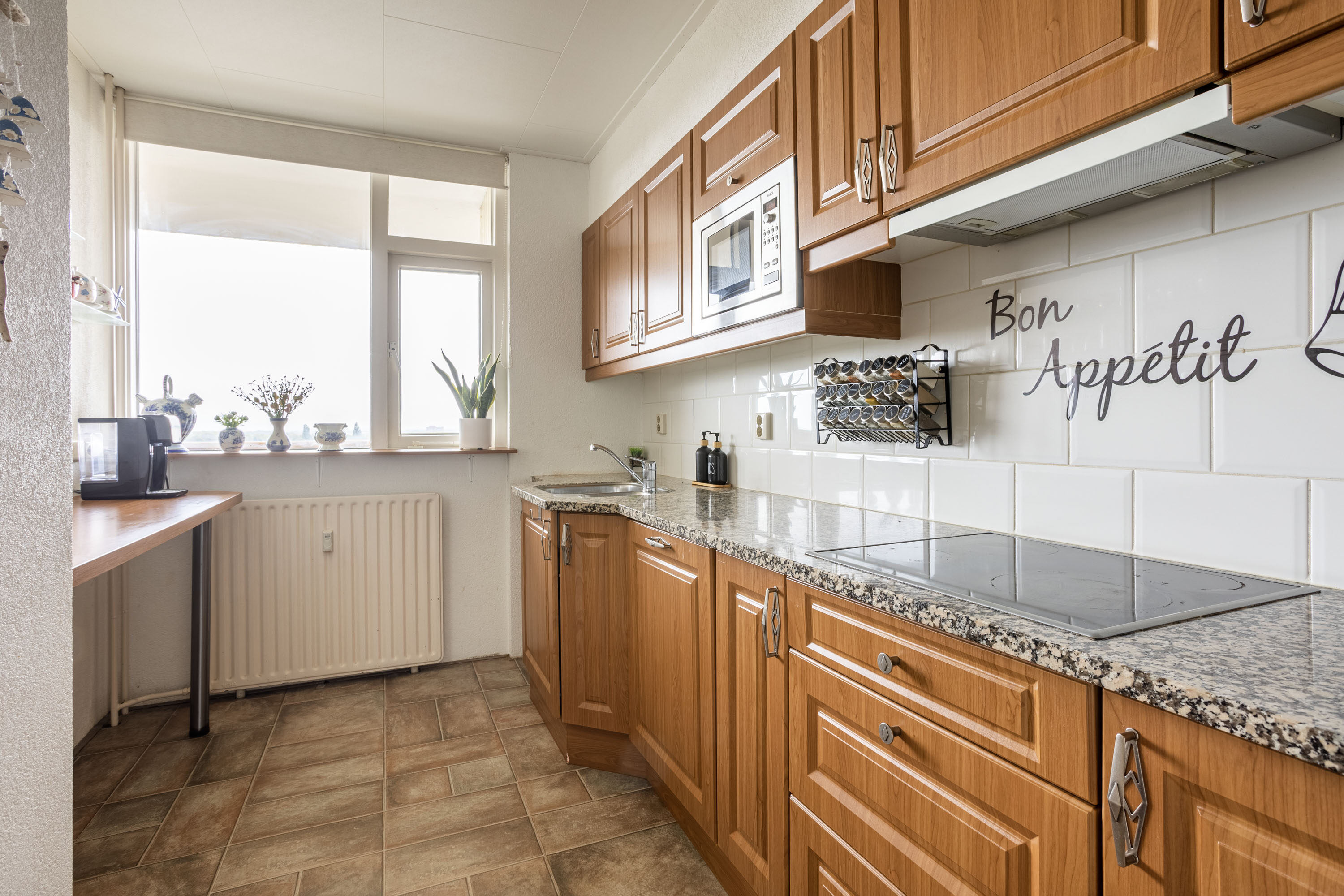 Via de woonkamer bereik je de keuken, die grenst aan de galerij. De keuken is voorzien van diverse inbouwapparatuur, waaronder een inductiekookplaat, combi-oven met magnetronfunctie, vaatwasser en een aparte koel- en vrieskast.