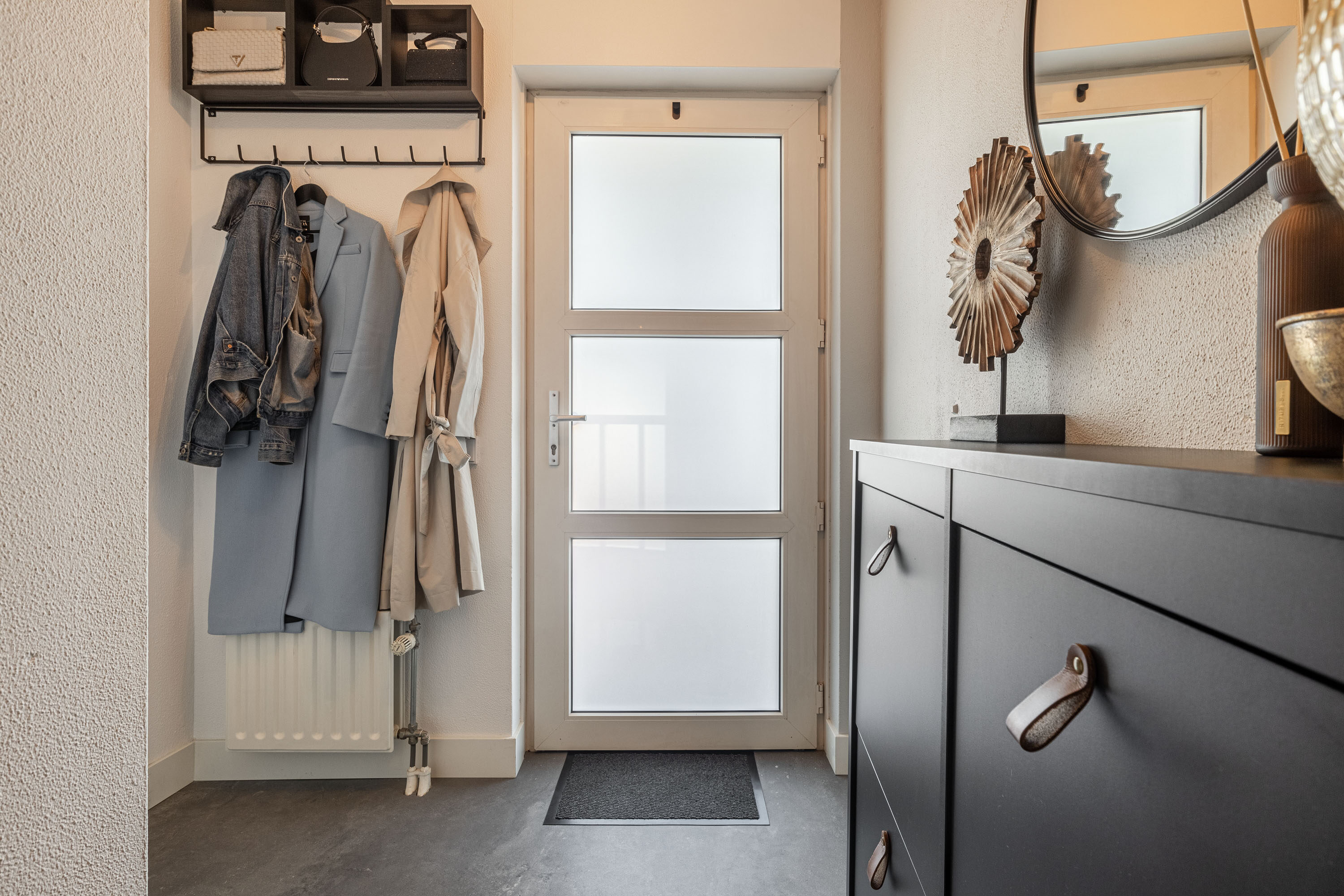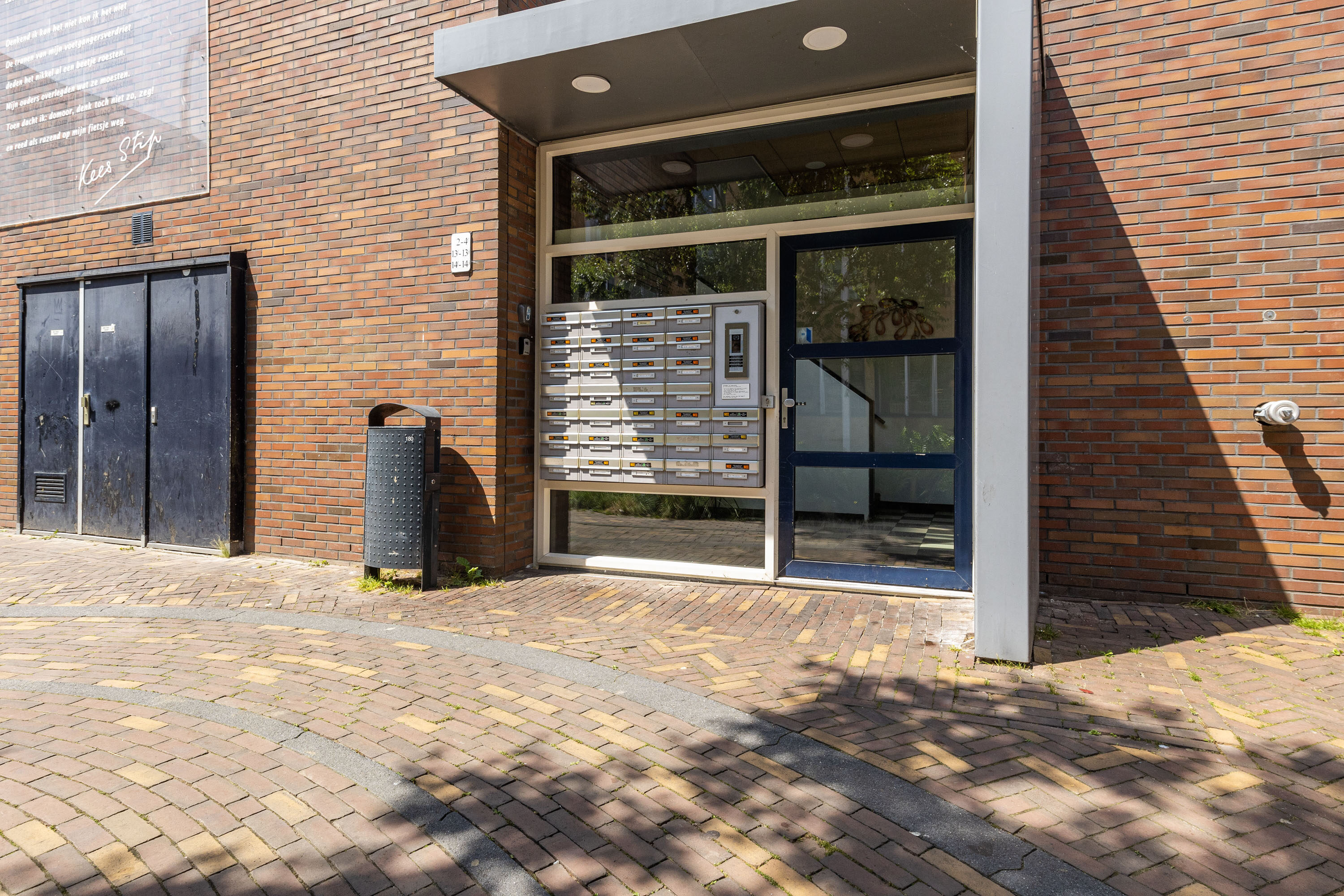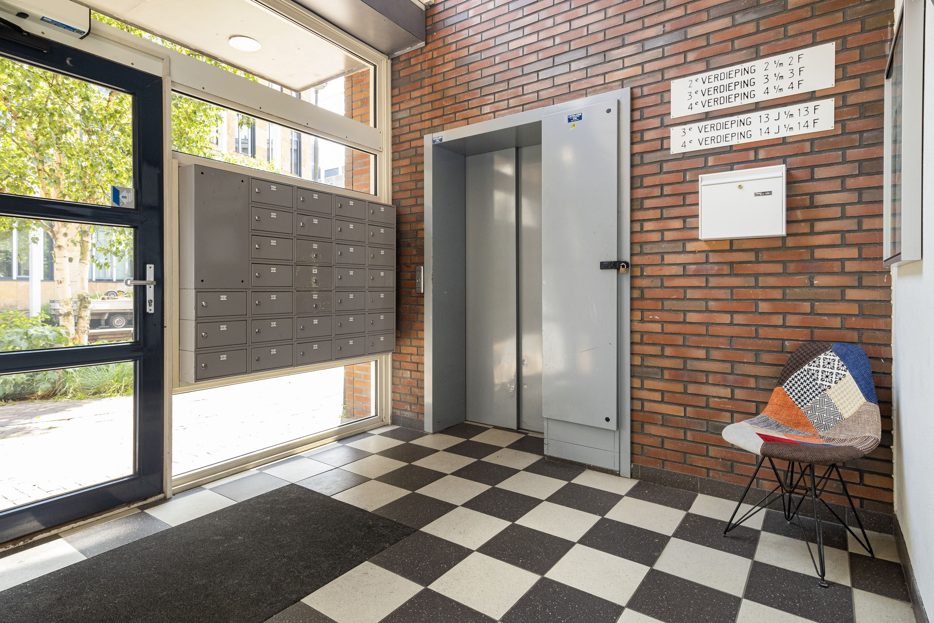 Via de gemeenschappelijke afgesloten entree, voorzien van brievenbussen, intercoms, een trappenhuis en een lift, kom je bij de ingang van het appartement, gelegen op de derde verdieping.