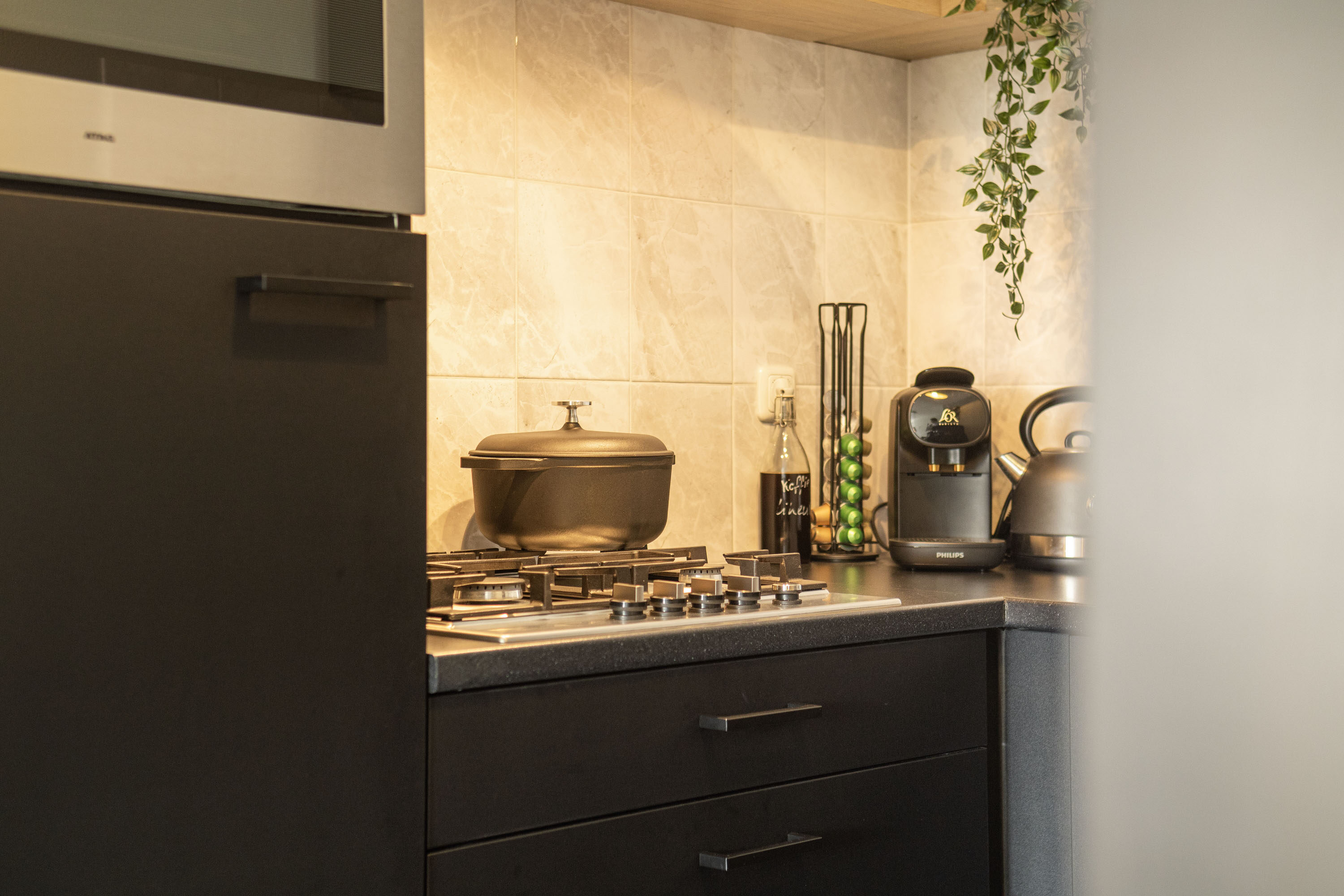 Bij binnenkomst in het appartement betreed je een ruime hal met plaats voor een garderobe, toegang tot de meterkast, een apart toilet en twee deuren die leiden naar de slaapkamer en de rest van de woning. De woon- en eetkamer heeft een royale oppervlakte van 21,8 m² en biedt veel lichtinval. Er is voldoende ruimte voor een grote bank, een ruime eettafel en zelfs een extra gezellige zithoek of thuiswerkplek, tevens vindt je hier ook de toegang naar het balkon. De moderne keuken, voorzien van stijlvol tegelwerk en diverse inbouwapparatuur, is praktisch en esthetisch ingericht.