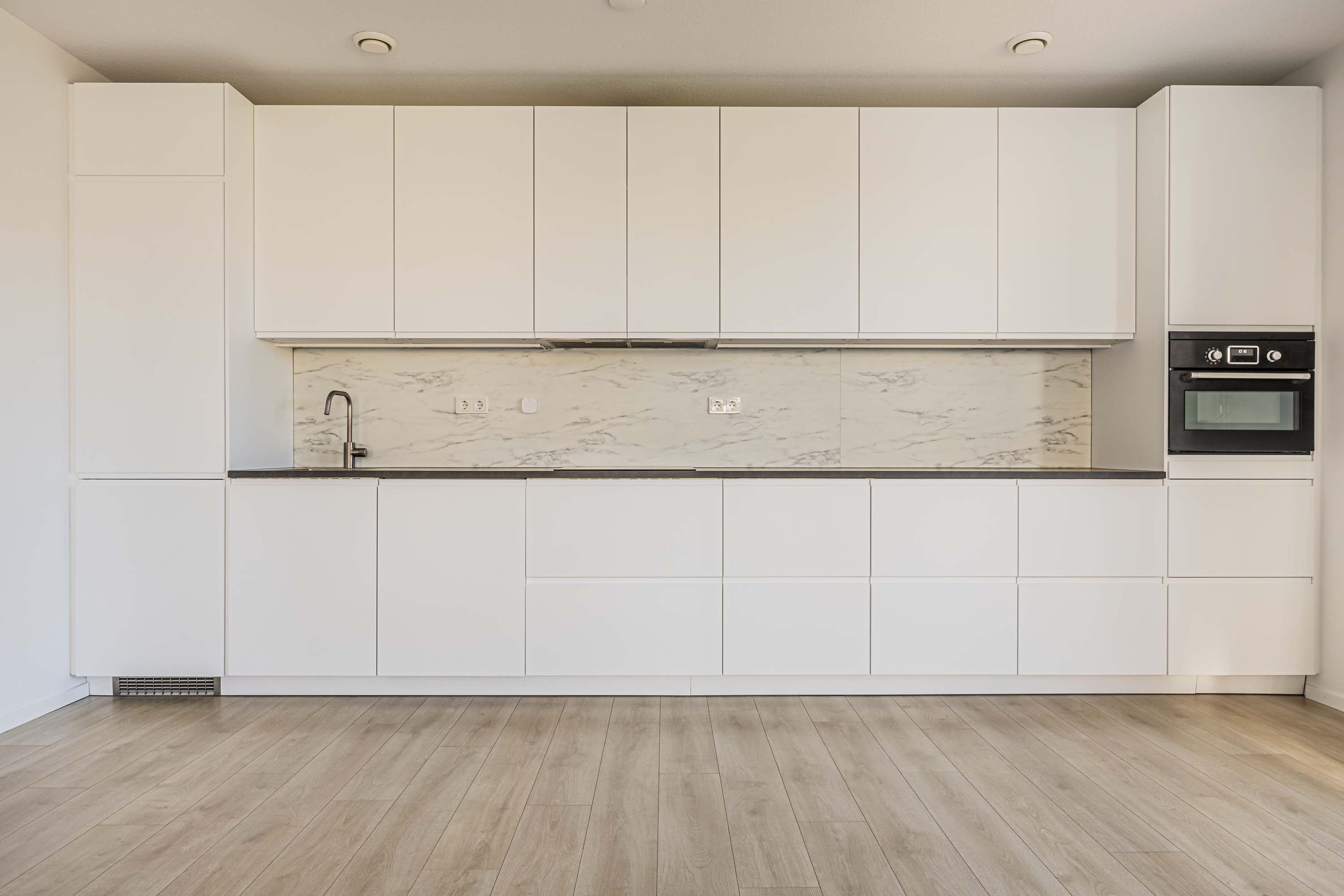 Het appartement is voorzien van een luxe inbouwkeuken. Uiteraard is de keuken uitgerust met luxe inbouwapparatuur, te weten; vaatwasser, inductie kookplaat, koelkast, vrieskast en combi-magnetron. De keuken beschikt over veel kastruimte.