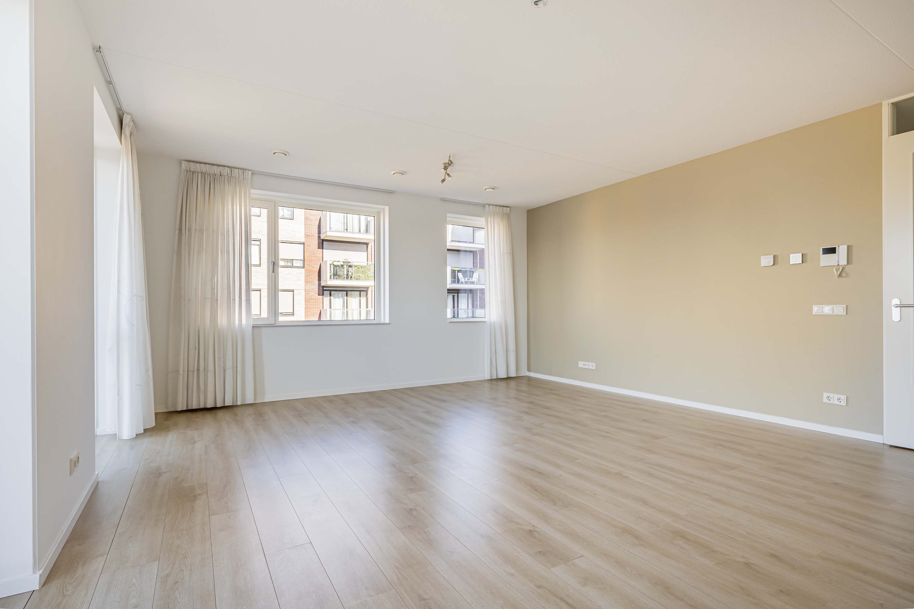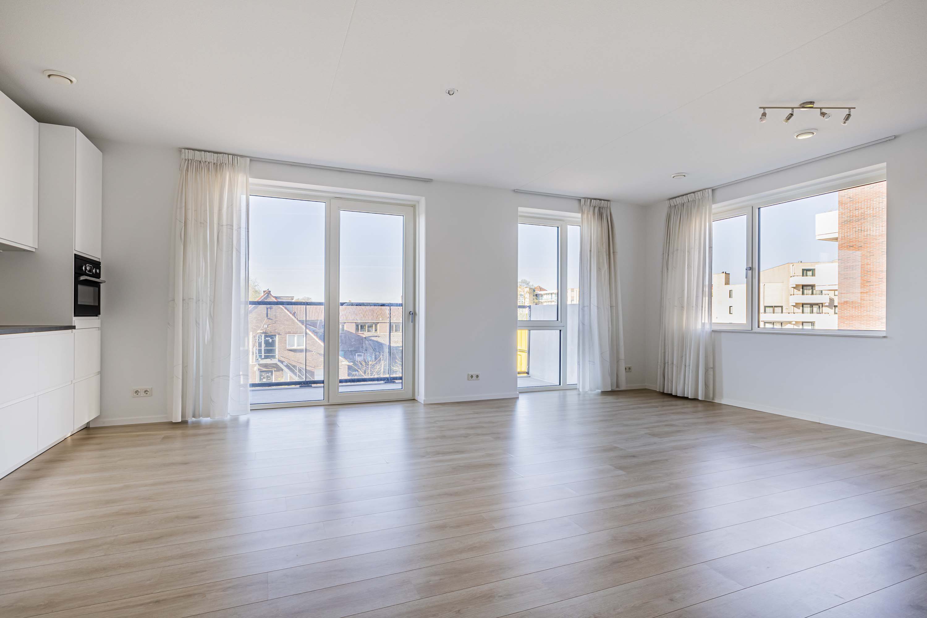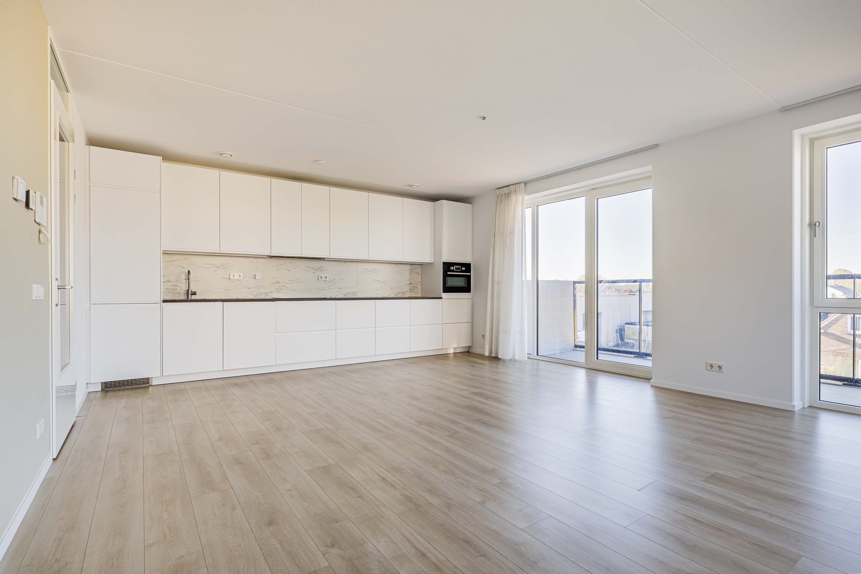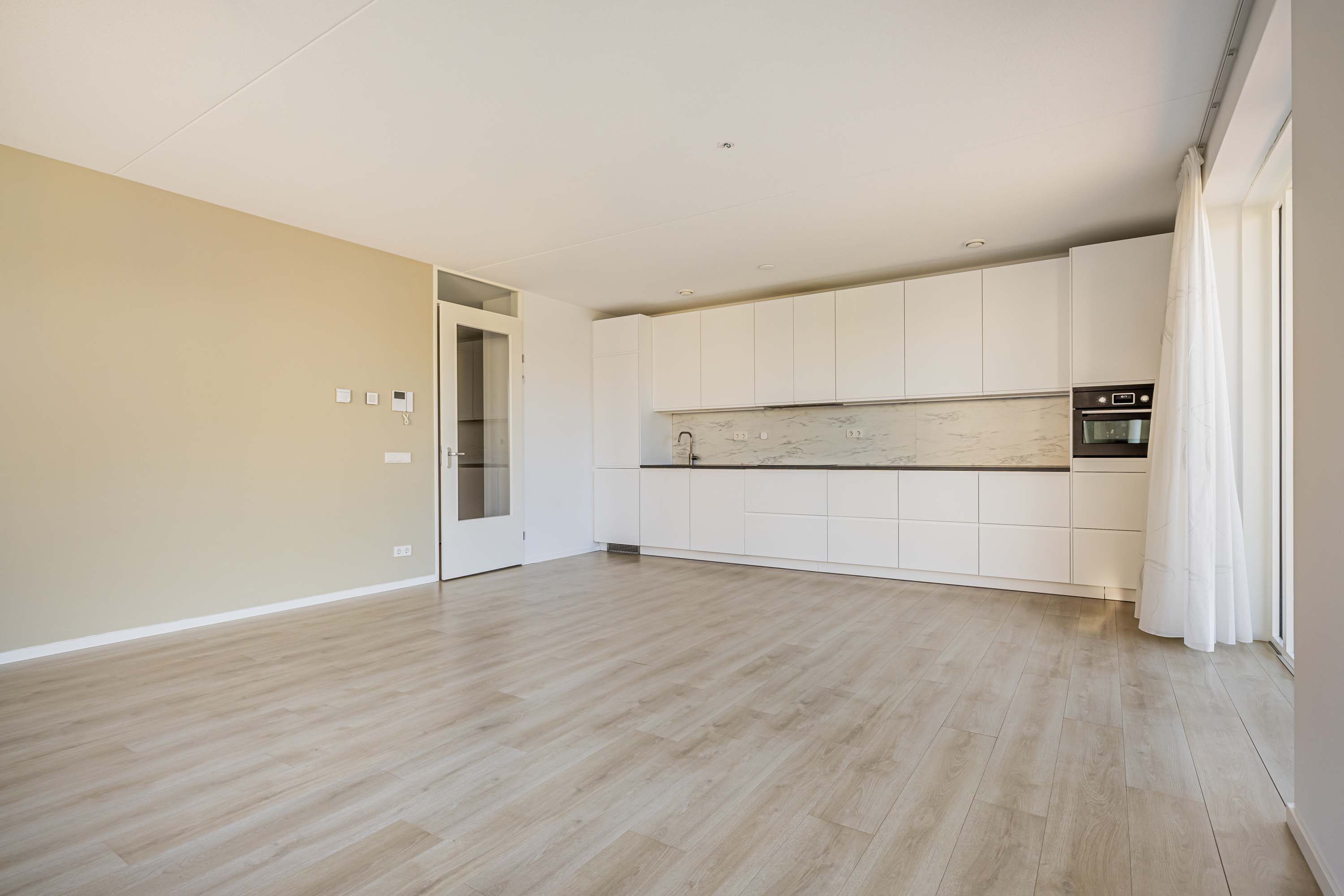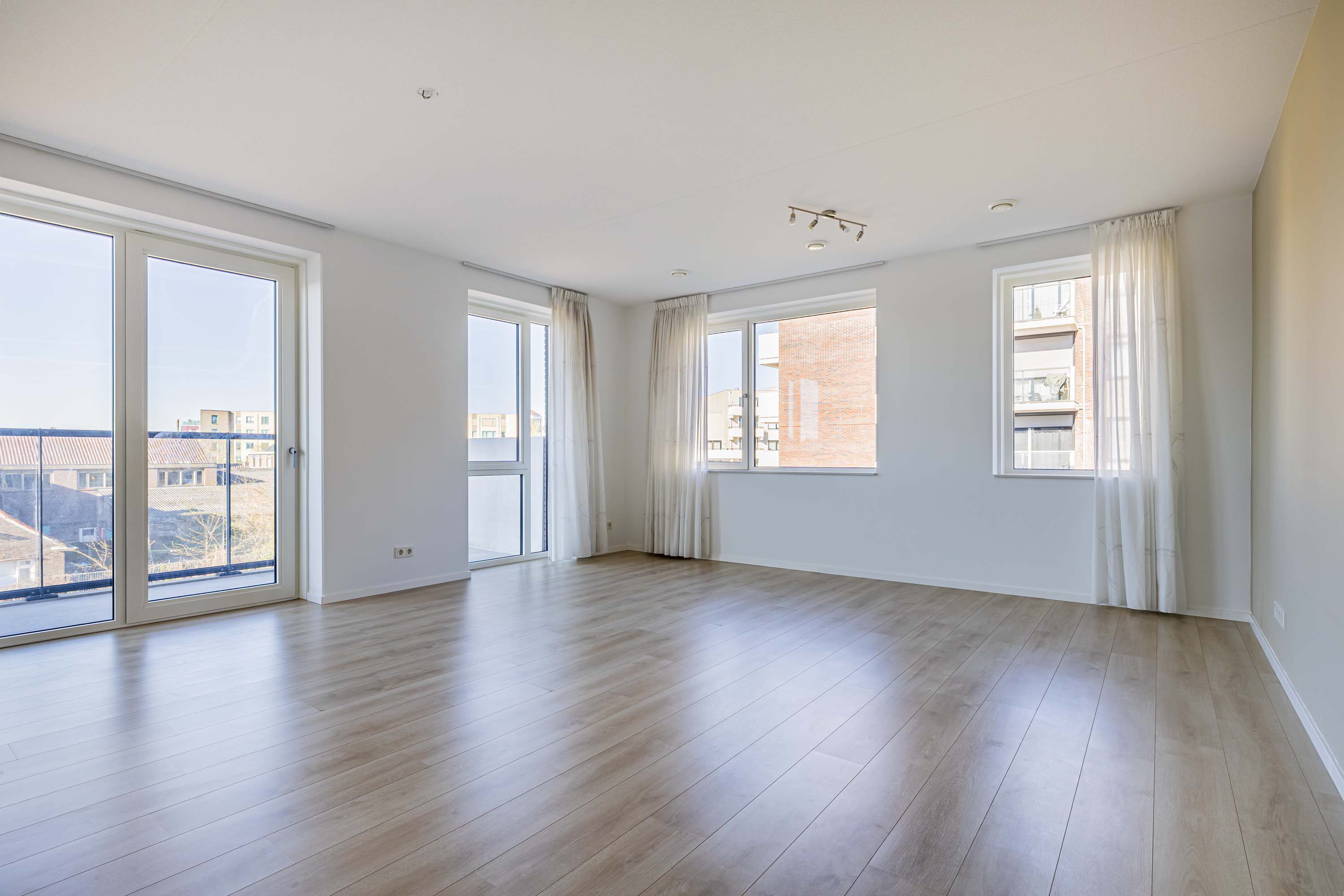 Het appartement is voorzien van vele gemakken van nu. De ruime woonkamer met open keuken hebben door de ligging op de zuidwesthoek veel daglicht. Daarnaast is de woonkamer voorzien van in between vitrage/gordijnen van plafond tot vloer in een wittint zowel voor de balkonramen als voor de ramen aan de westkant. Ook heb je vanuit de woonkamer toegang tot het ruime op het zonnige zuiden gelegen balkon.