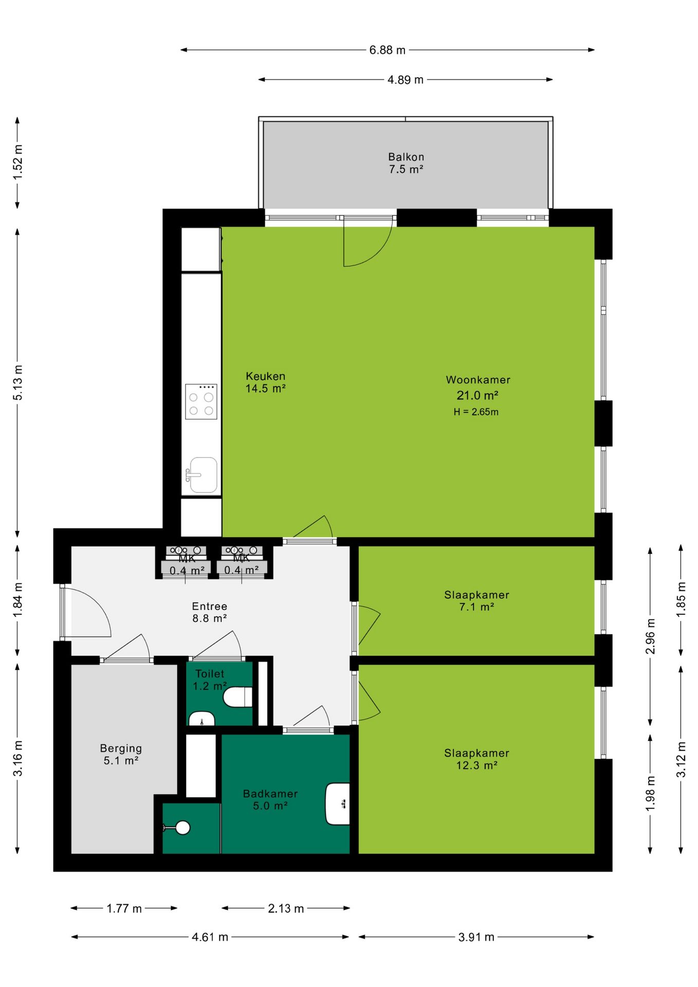 Het appartement heeft een inpandige berging waar ook de aansluiting voor de was-apparatuur is gesitueerd.