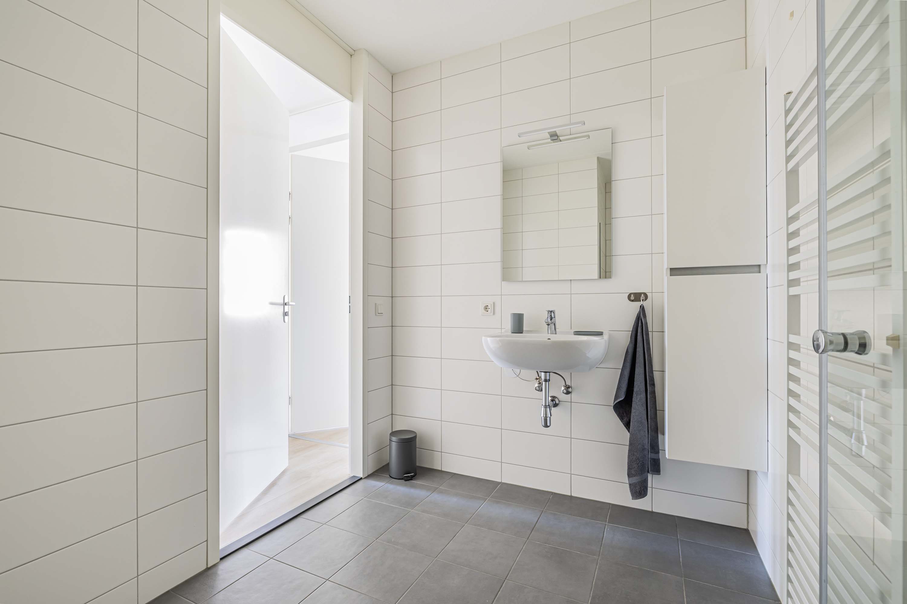 De badkamer is geheel betegeld in wit en antraciet kleurstelling en is ingericht met een ruime douchehoek, een wastafel met spiegel en een design radiator. De separate toiletruimte is eveneens geheel betegeld. De toiletruimte is afgewerkt met een hangend toilet en fonteintje in de zelfde kleurstelling als de badkamer.