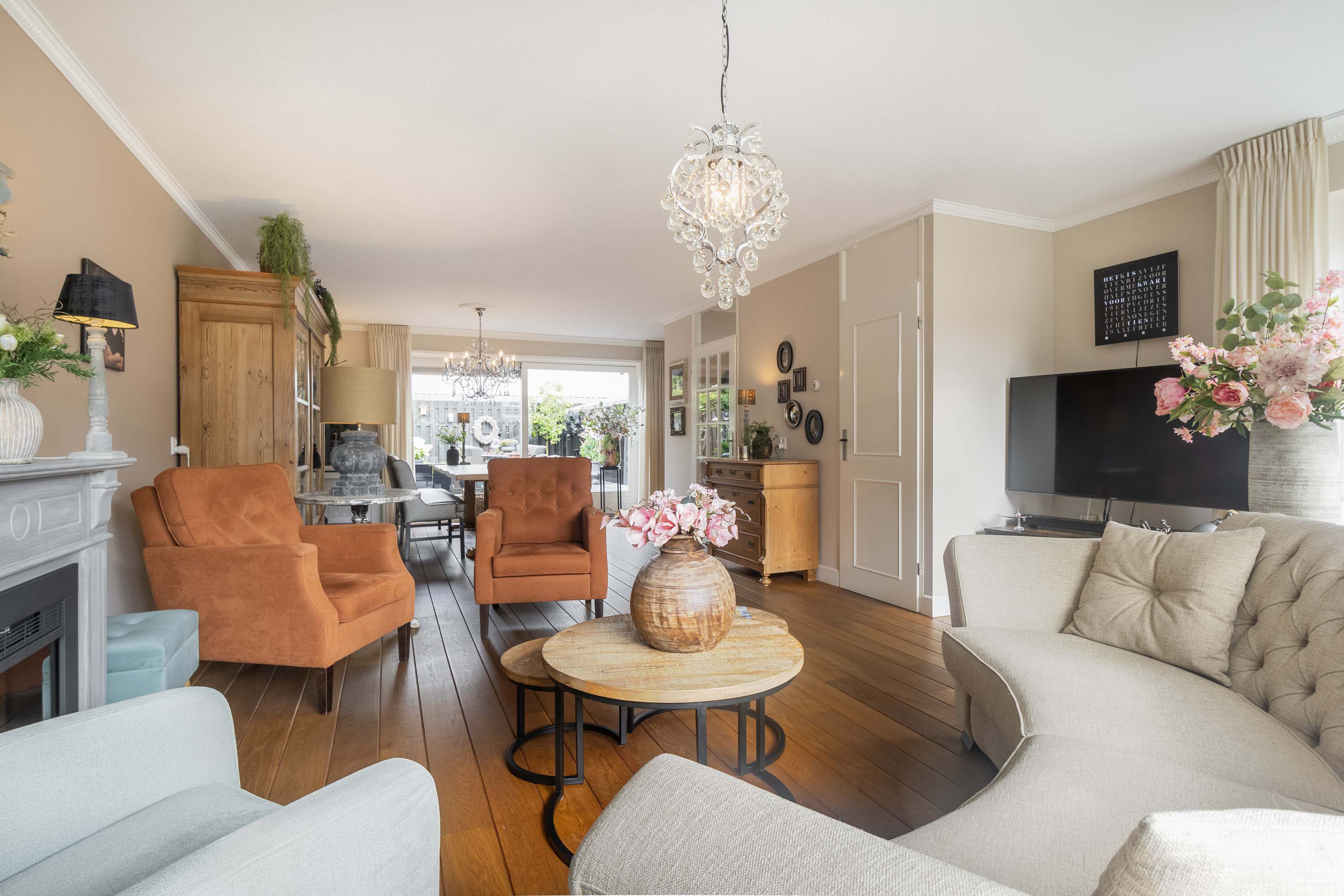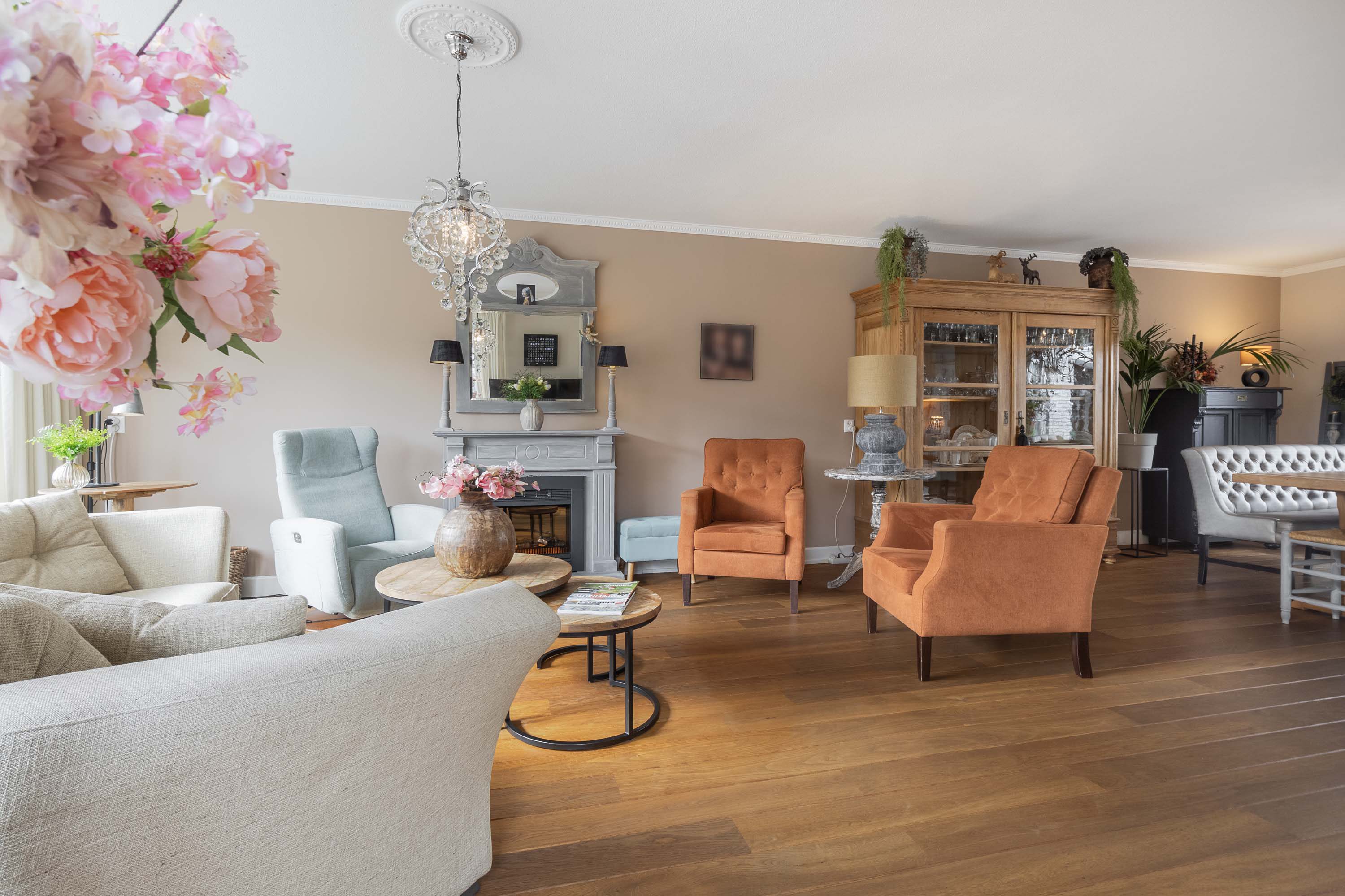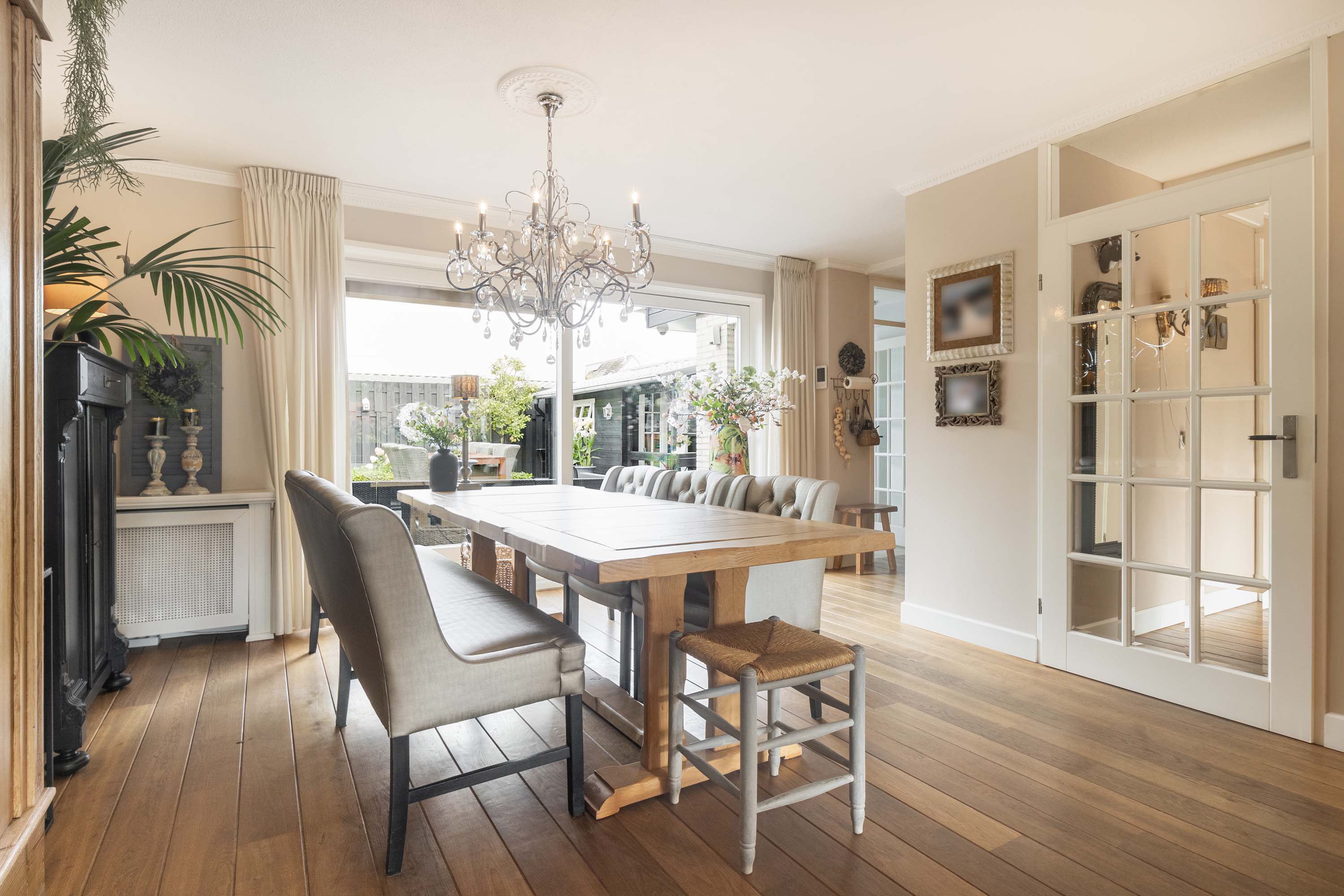 Aan de achterzijde van de woning bevindt zich het eetgedeelte dat direct aansluit op de luxe landelijke keuken. Deze moderne keuken is voorzien van verschillende inbouwapparatuur zoals: een inductiekookplaat met afzuigkap, combi-oven, koelkast en vaatwasser zodat je altijd kunt genieten van een optimale kookervaring.