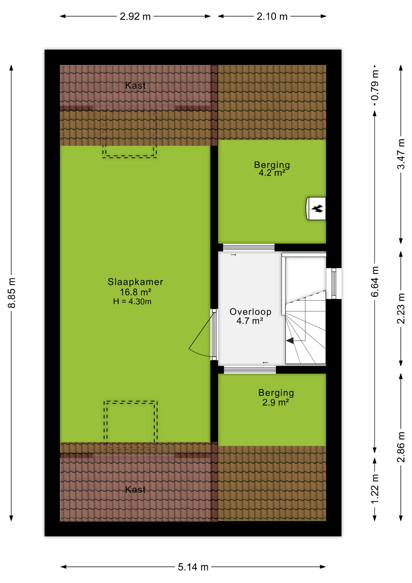 Met de vaste trap kom je op de zolder, deze verdieping beschikt over fijne bergruimten en de vierde slaapkamer. Deze kamer heeft een afmeting van maar liefst 16,8 m². Deze ruimte kan tevens dienst doen als werk-, hobby- of sportkamer. Ook is er een mogelijkheid om een tweede (slaap)kamer te creëren. Dankzij de aanwezige dakramen stroomt er voldoende daglicht binnen.