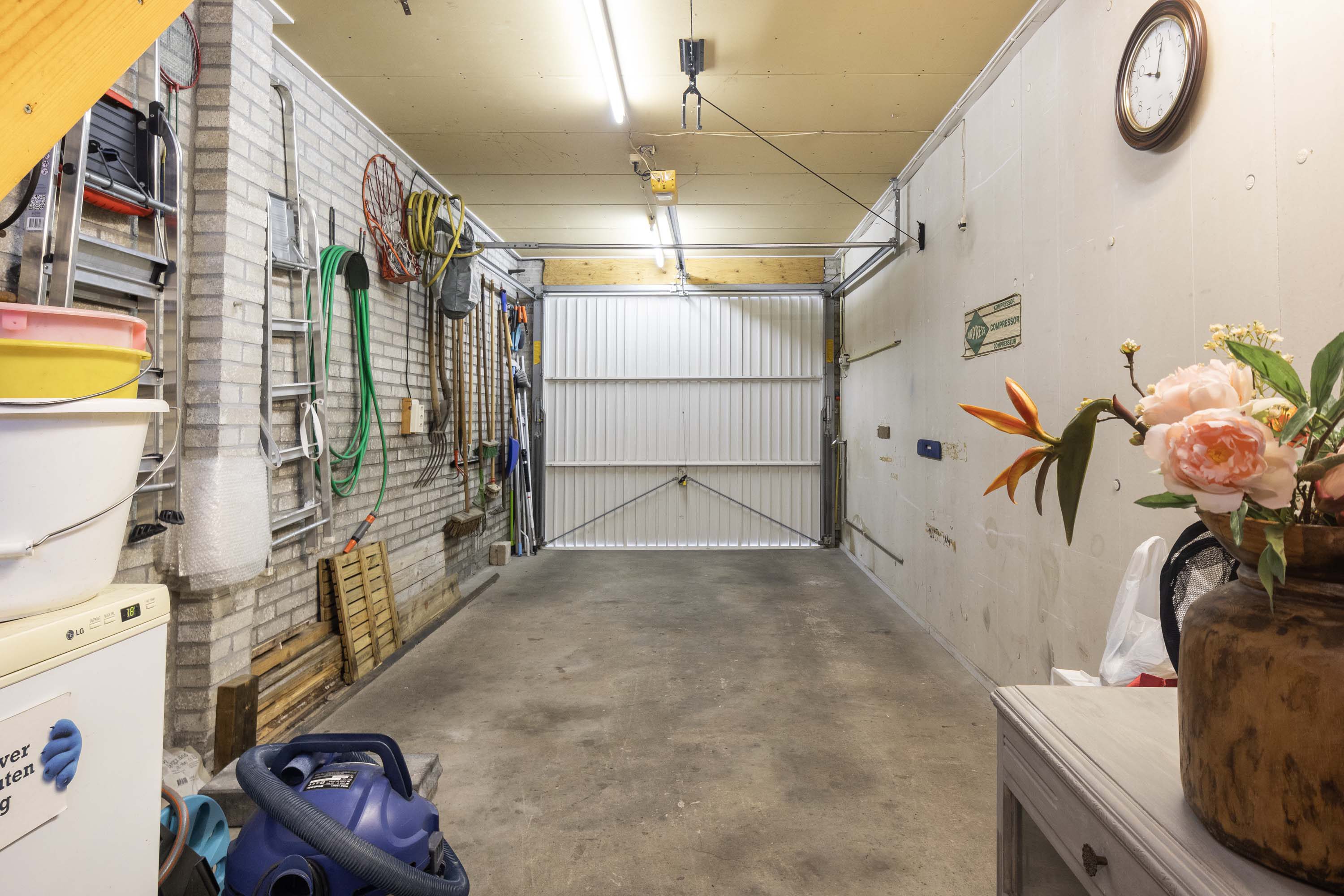 De aangebouwde en stenen garage biedt plannen om een auto binnen te parkeren of voor het opbergen van spullen. Via een vaste trap bereik je de garagezolder van 24,2 m², die voorzien is van diverse raampartijen en talloze mogelijkheden biedt. In de vloer bevindt zich een luik met daarboven een elektrische takel voor het tillen van zware items.