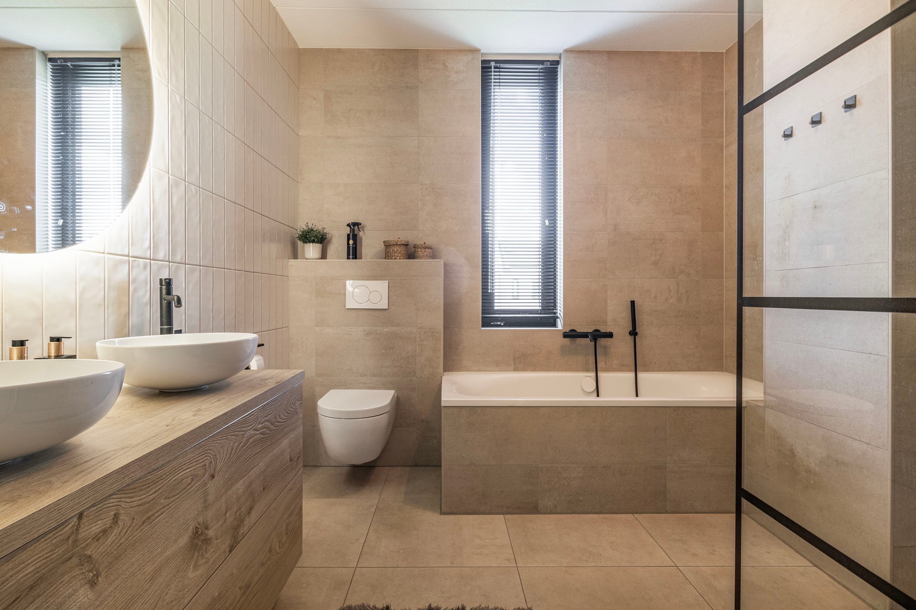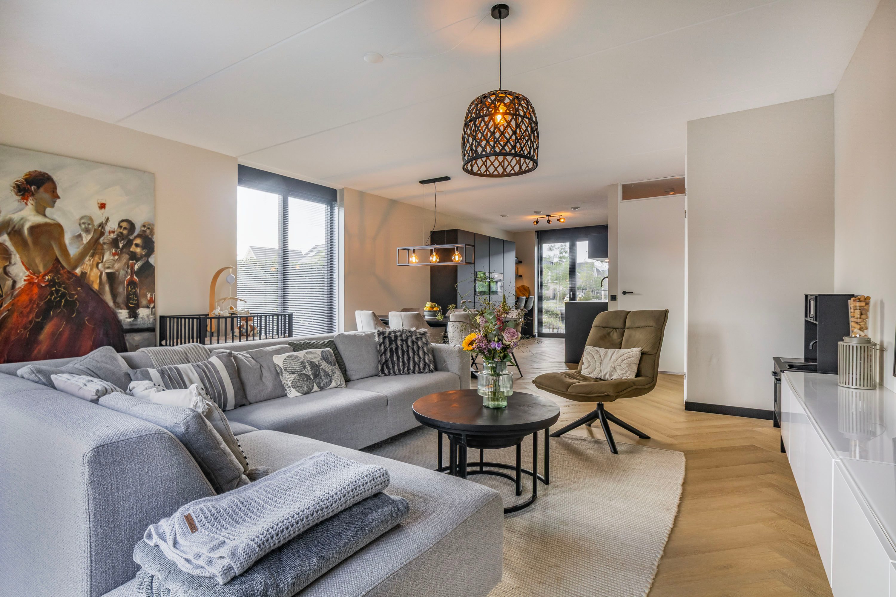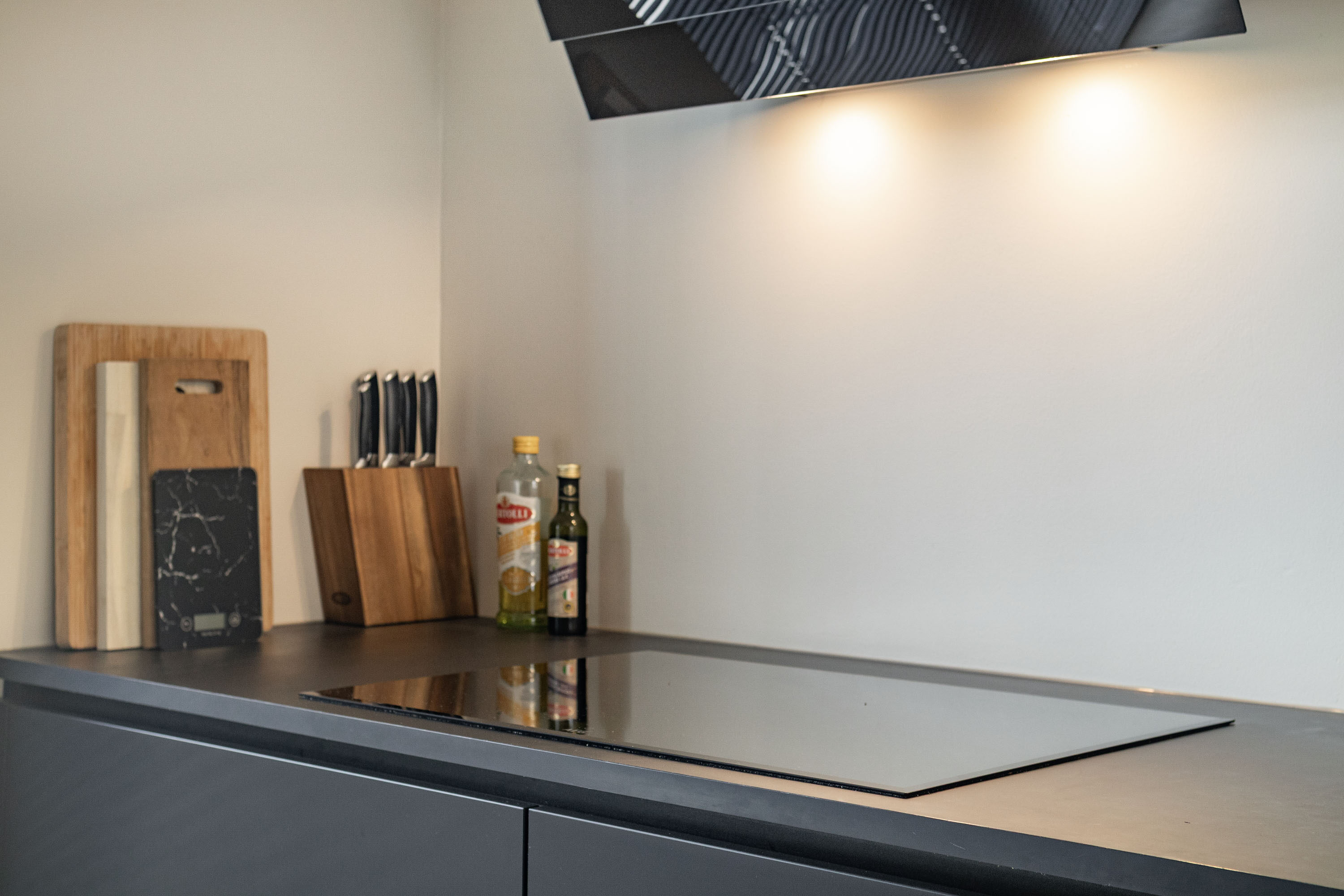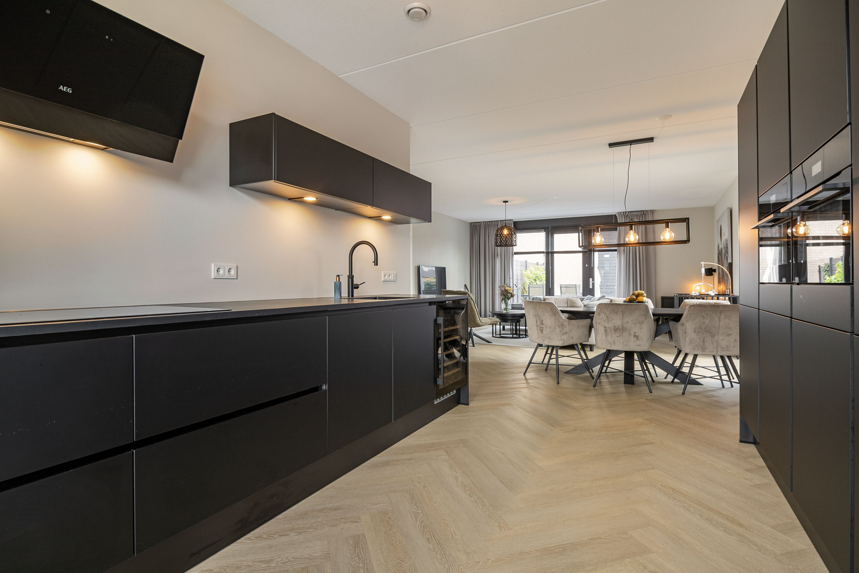 De woonkamer is ruim, breed (5.40 m) en tuigericht. Een heerlijk plek om te zitten! Via de openslaande tuindeuren is de zonnige en zeer verzorgd aangelegde achtertuin te bereiken. Centraal gelegen bevind zich het eetgedeelte met ruimte voor een riante eettafel. De open keuken is het stoere hart van het huis: matzwarte fronten, strak lijnenspel en voorzien van álle denkbare inbouwapparatuur. Denk o.a. aan een vaatwasser, koel-vriescombinatie, Quooker, stoomoven én combi-oven, inductie kookplaat met strakke afzuigkap, plus een wijnklimaatkast voor je mooiste flessen. Koken, borrelen, leven—het kan hier allemaal. De begane grond is volledig afwerkt met een PVC visgraatvloer, gladde wanden, vloerverwarming en vloerkoeling.