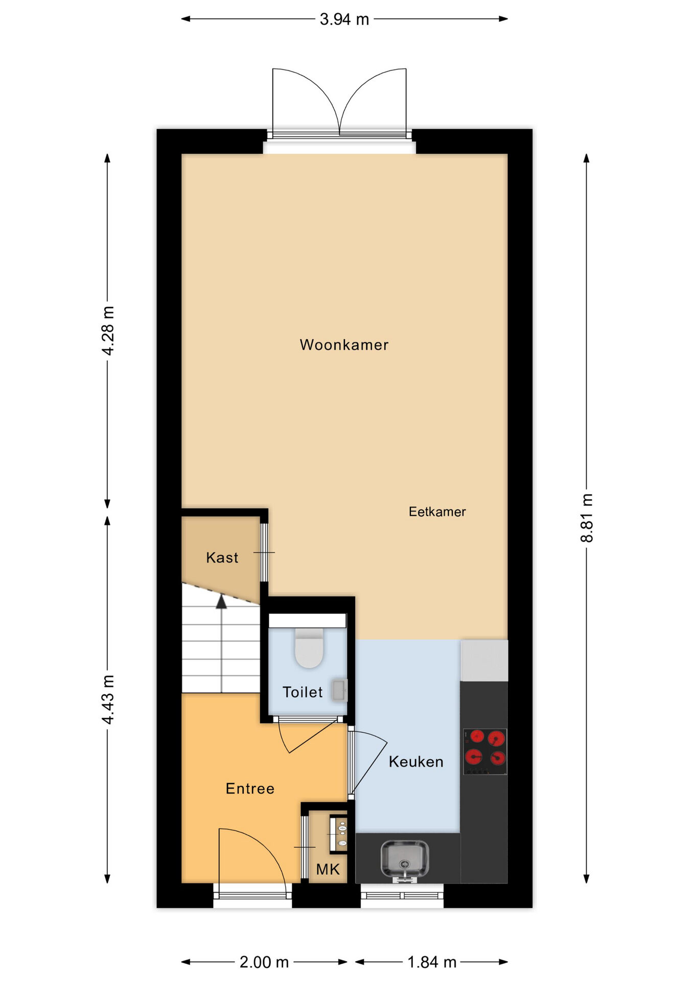 Vanuit de hal is er toegang tot de woonkamer. Deze heeft een prettige lichtinval en is voorzien van openslaande deuren naar de achtertuin. Door de uitbouw van 1.2 meter heb je een fijne zithoek en ook nog voldoende ruimte voor de eettafel. De half open keuken is voorzien van een nette inbouwkeuken waar je de beschikking hebt over een inductie kookplaat, afzuigkap, combi-oven/magnetron, koelkast, vriezer en vaatwasser. De gehele begane grond (m.u.v. de toiletruimte) is voorzien van een lichte (click) PVC vloer.