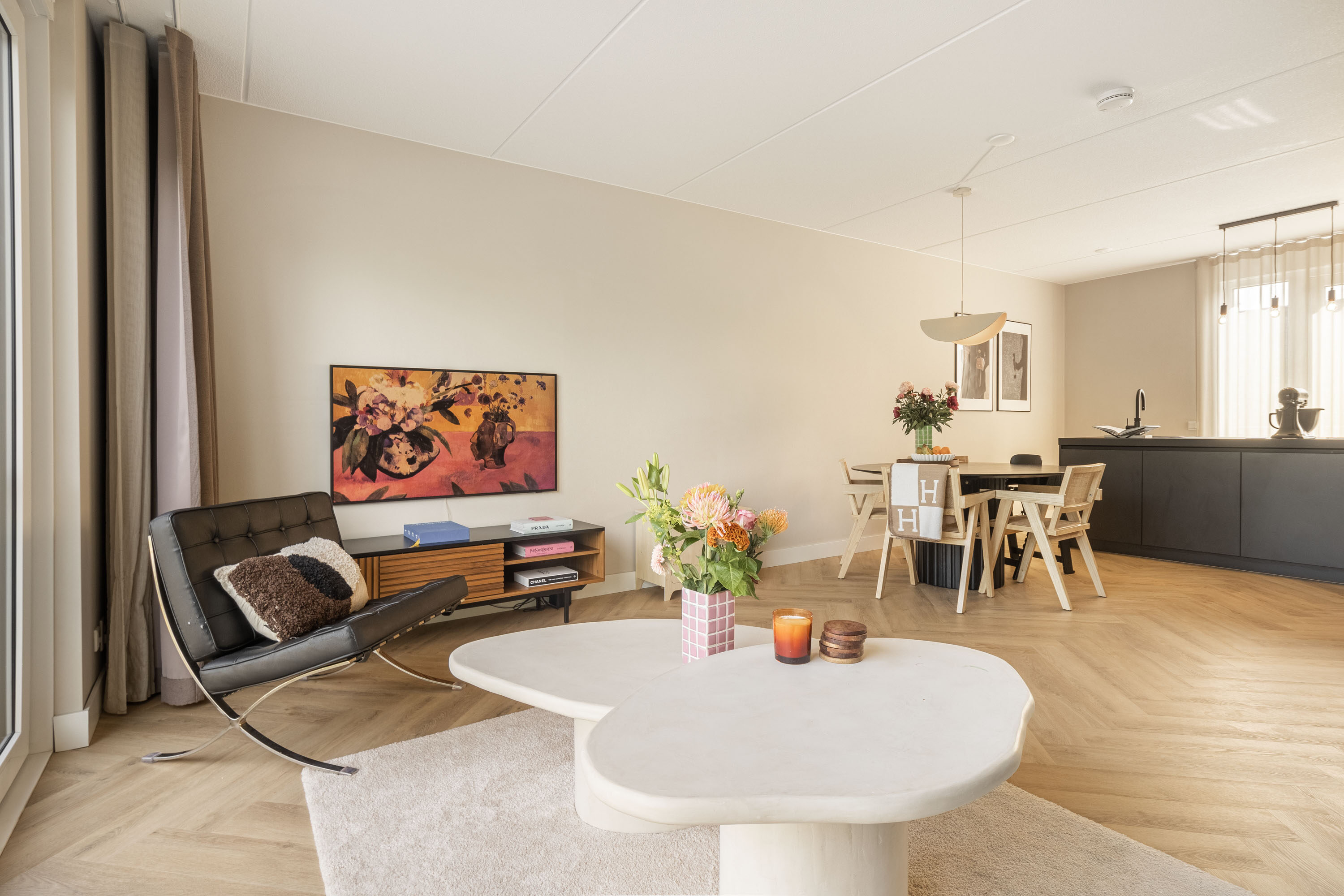 De ruime en lichte woonkamer met grote raampartijen is afgewerkt met een strakke vloer en neutrale kleurstellingen. Aan de achterzijde bevindt zich de moderne keuken met kookeiland en diverse inbouwapparatuur. Via de keuken heb je toegang tot het balkon van ca. 8 m², gelegen op het oosten — ideaal voor een ontbijt of kop koffie in de ochtendzon.