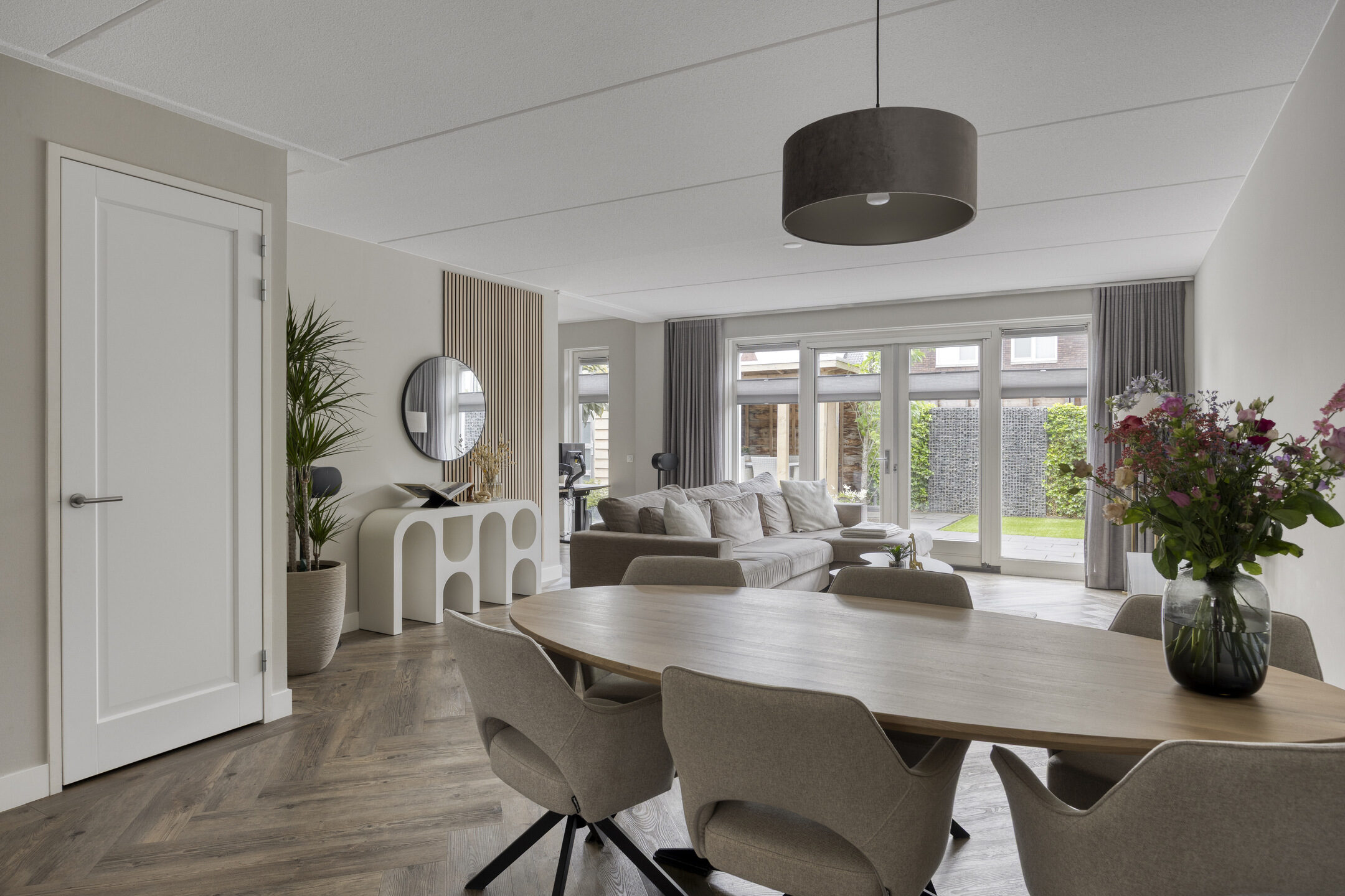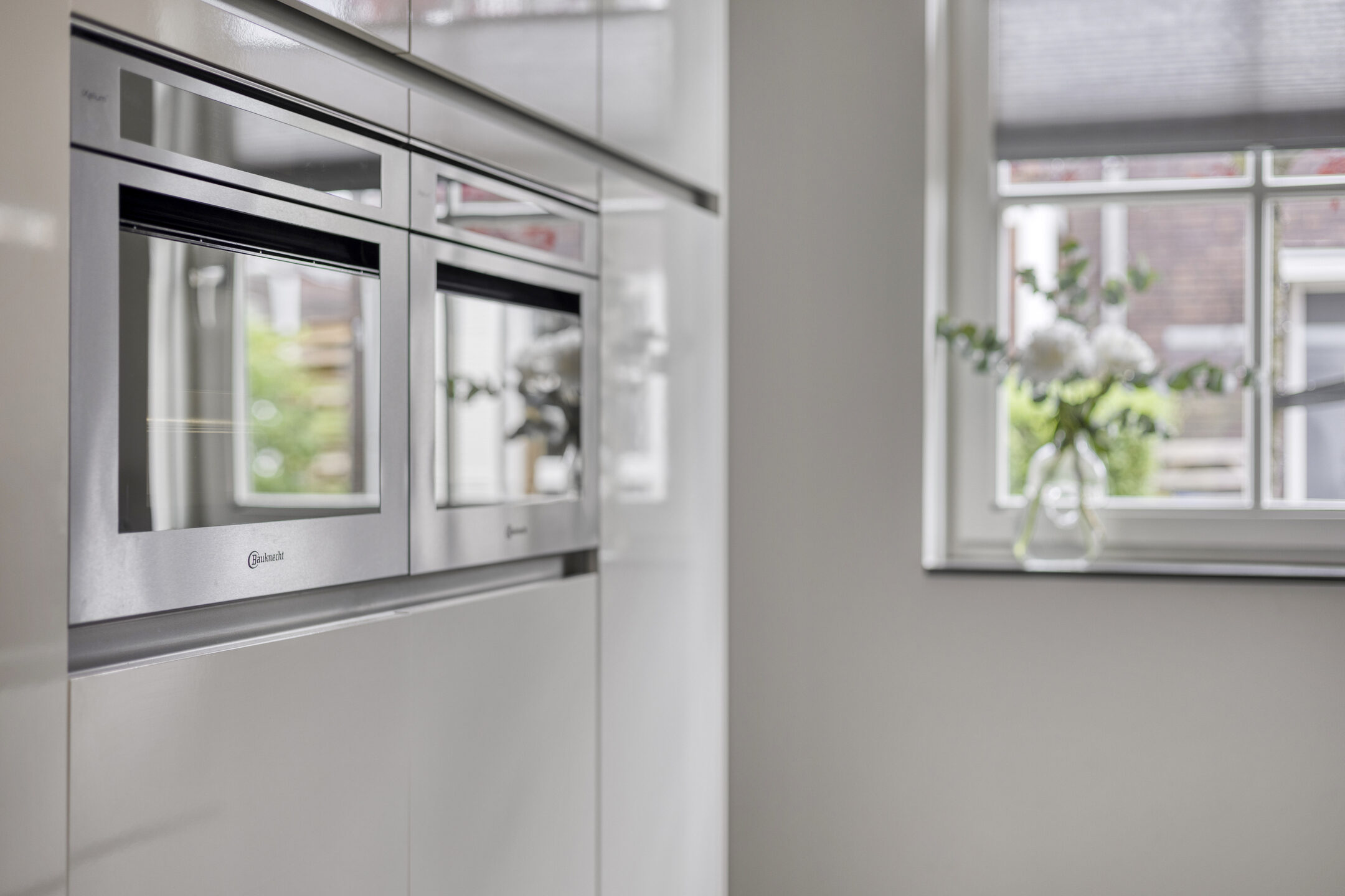 Aan de voorzijde van de woning bevindt zich het eetgedeelte, dat naadloos overgaat in de moderne keuken. De keuken is uitgevoerd in een hoogglans wit design en beschikt over een ruim keukenblok, met alle luxe die je kunt wensen. Denk hierbij aan een ingebouwde vaatwasser, een inductiekookplaat, een afzuigkap, een combi-oven, een Quooker en een koel-vriescombinatie. Alles is hier perfect afgestemd om comfortabel en stijlvol te koken en eten.