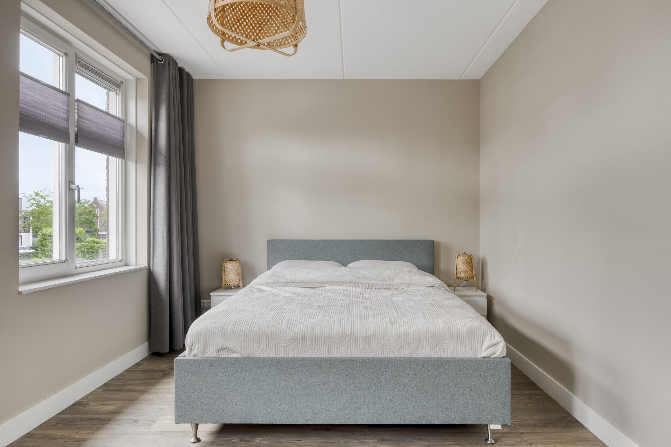 Via de vaste trap bereik je de eerste verdieping. Vanaf de overloop heb je toegang tot drie slaapkamers en de badkamer. De grootste slaapkamer van 15,7 m² bevindt zich aan de achterzijde van de woning en biedt voldoende ruimte voor een royale kastenwand. Aan de voorzijde van de woning liggen de tweede en derde slaapkamers van 10 m² en 5.1 m², beide voorzien van grote ramen die zorgen voor veel natuurlijk licht.