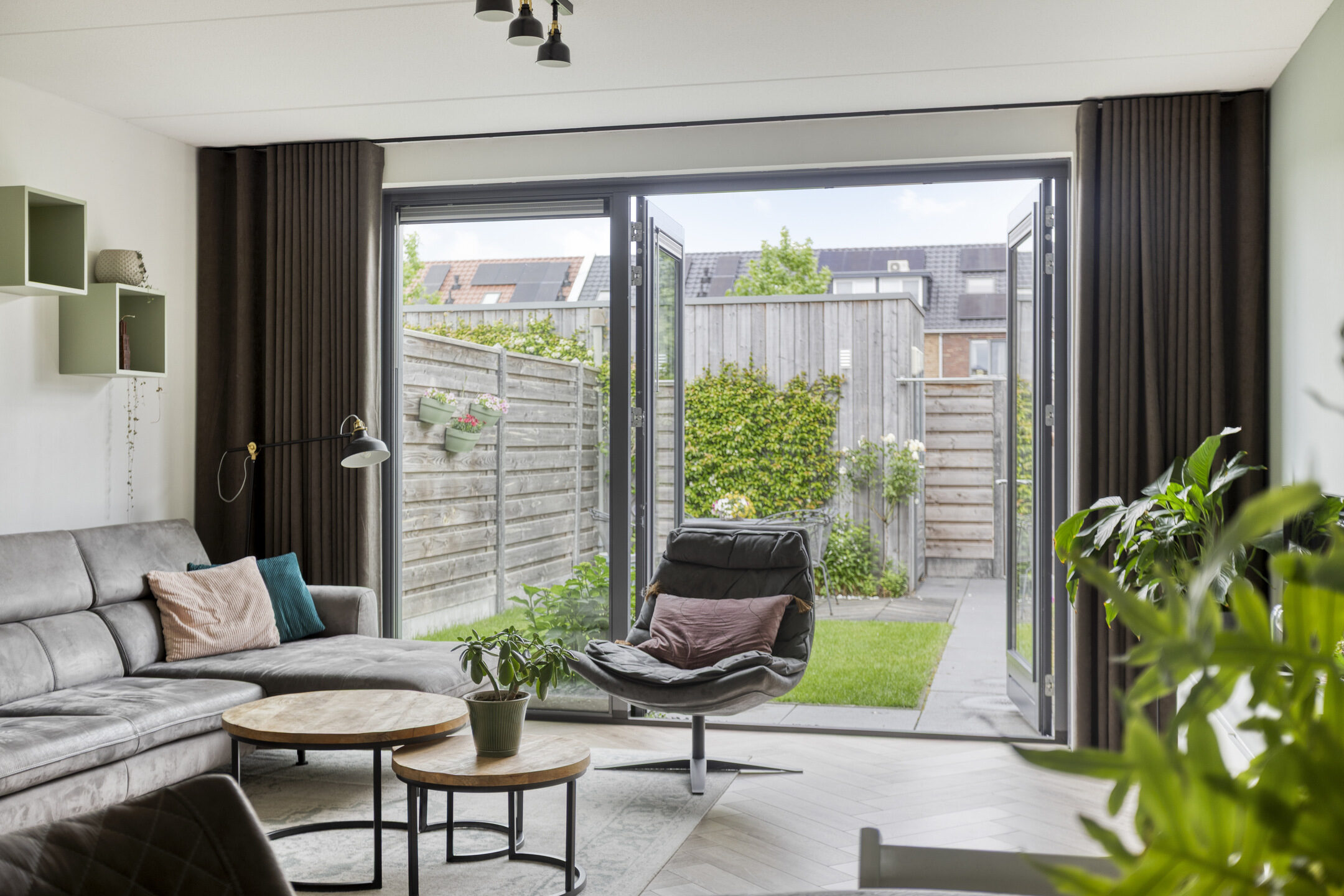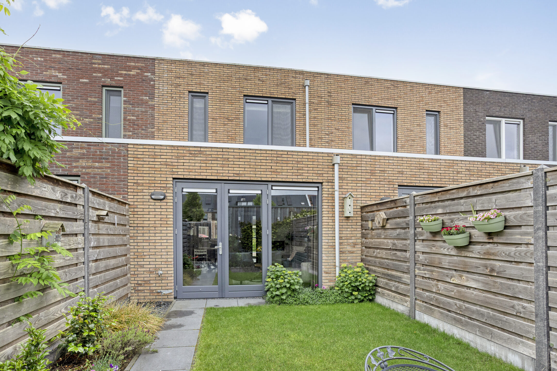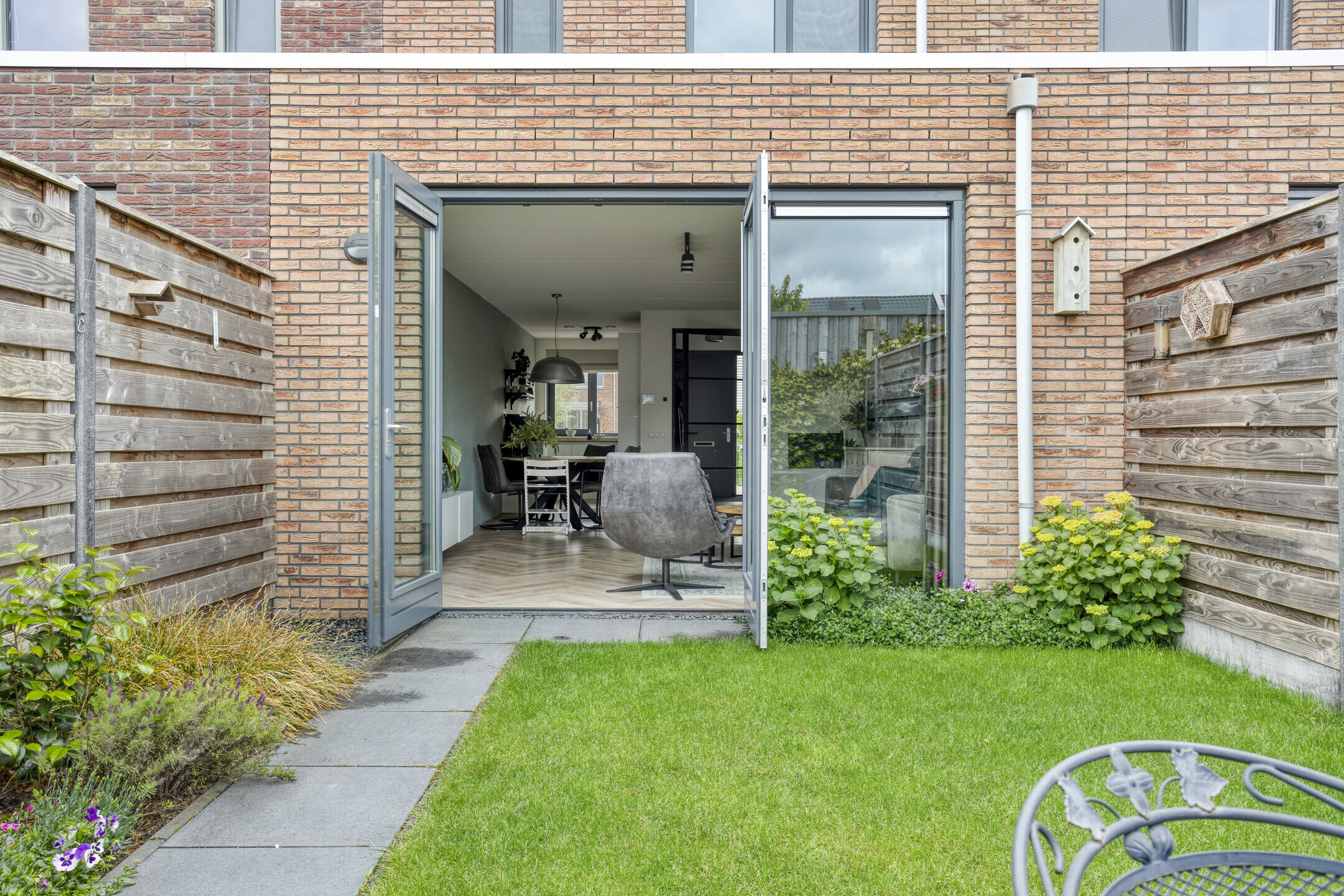 Via de twee openslaande deur in de woonkamer stap je de tuin in. De tuin is praktisch aangelegd en beschikt over een grasperk, houten vlonderterras en plantenborders. Achterin de tuin bevindt zich een houten berging, ideaal voor het opbergen van fietsen of tuingereedschap. De tuin is tevens toegankelijk via een handige achterom.