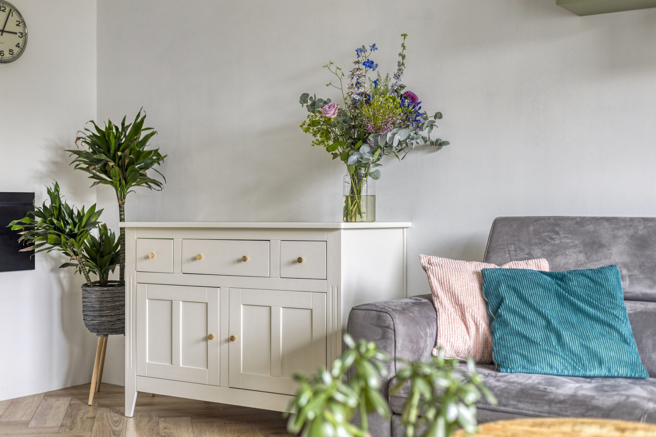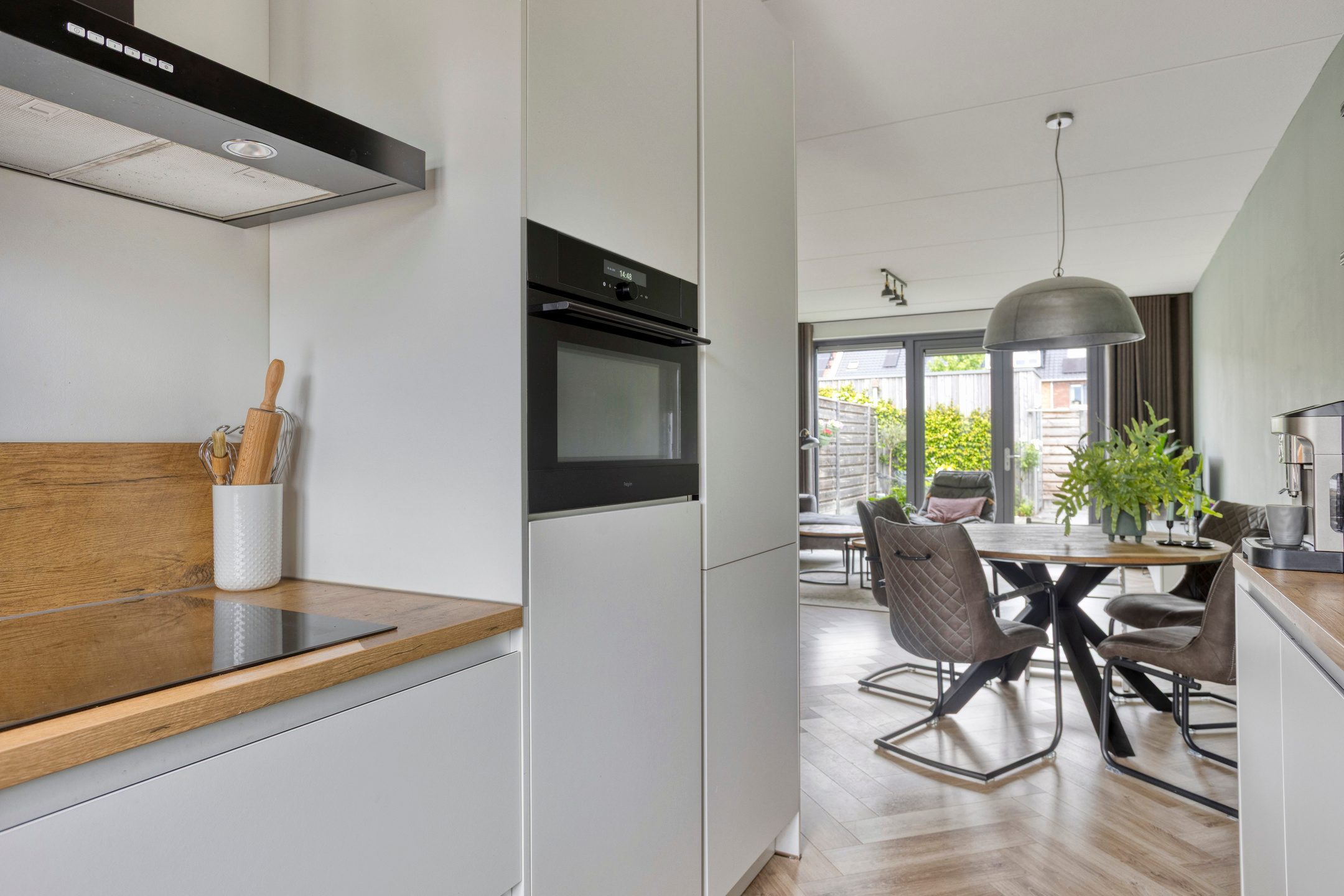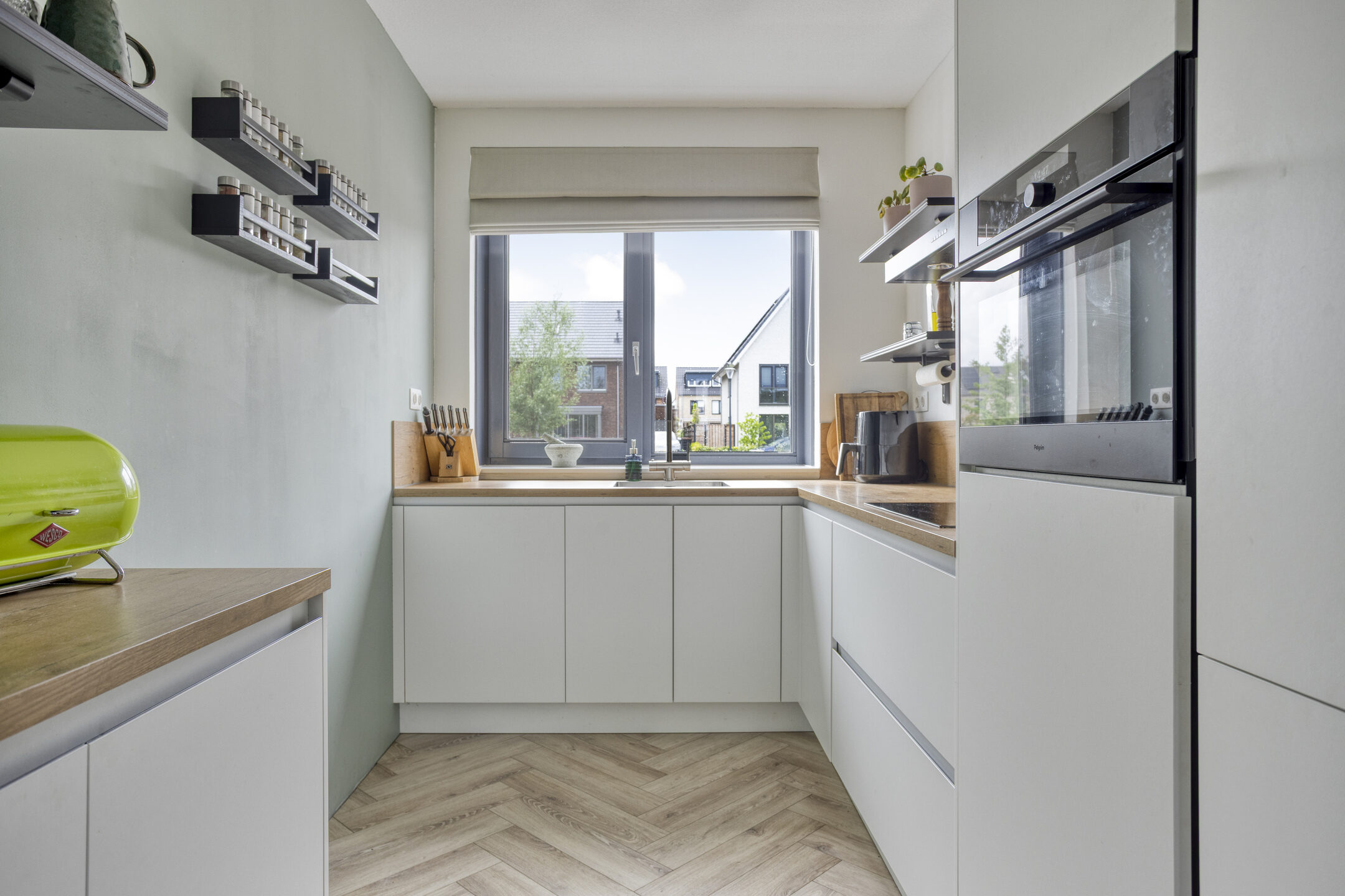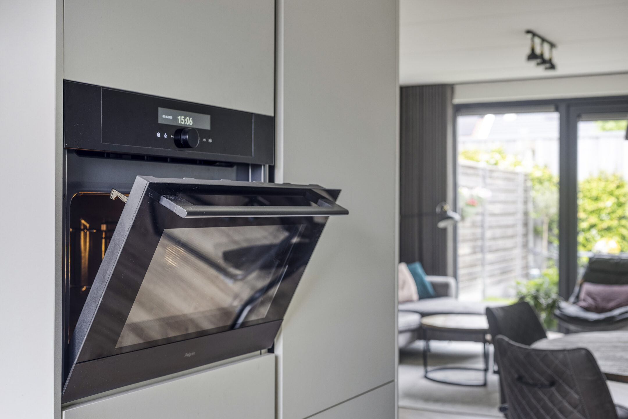 De royale (uitgebouwde) woonkamer is echt een blikvanger dankzij de grote raampartijen, die zorgen voor een overvloed aan natuurlijk licht. Vanuit de woonkamer heb je via twee tuin deuren directe toegang tot de tuin, waardoor het binnen-buitenleven naadloos met elkaar verbonden wordt. Centraal tussen de woonkamer en keuken bevindt zich het eetgedeelte. Hier is voldoende ruimte voor een eettafel met stoelen. Een fijne plek om met familie en/of vrienden te genieten van een hapje, drankje en spelletje! Aangrenzend aan de woonkamer vind je de moderne keuken, uitgevoerd in een lichte kleurstelling.