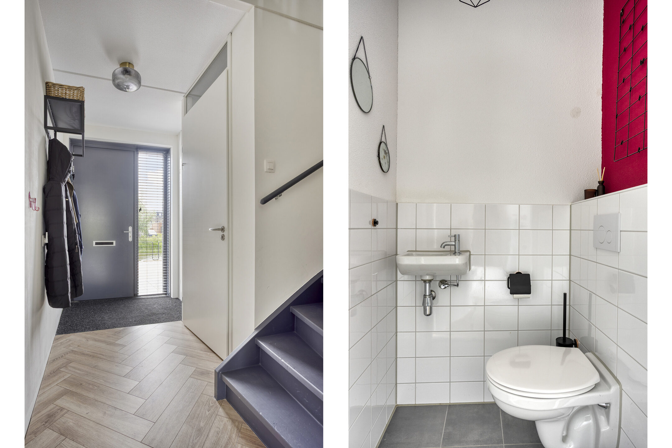 Wanneer je de woning binnenkomt, stap je in de entree, waar je ook de meterkast vindt. Direct naast de entree is er een keurig afgewerkt toilet met een fonteintje. Vanuit de entree leidt een trapopgang je naar de eerste verdieping.