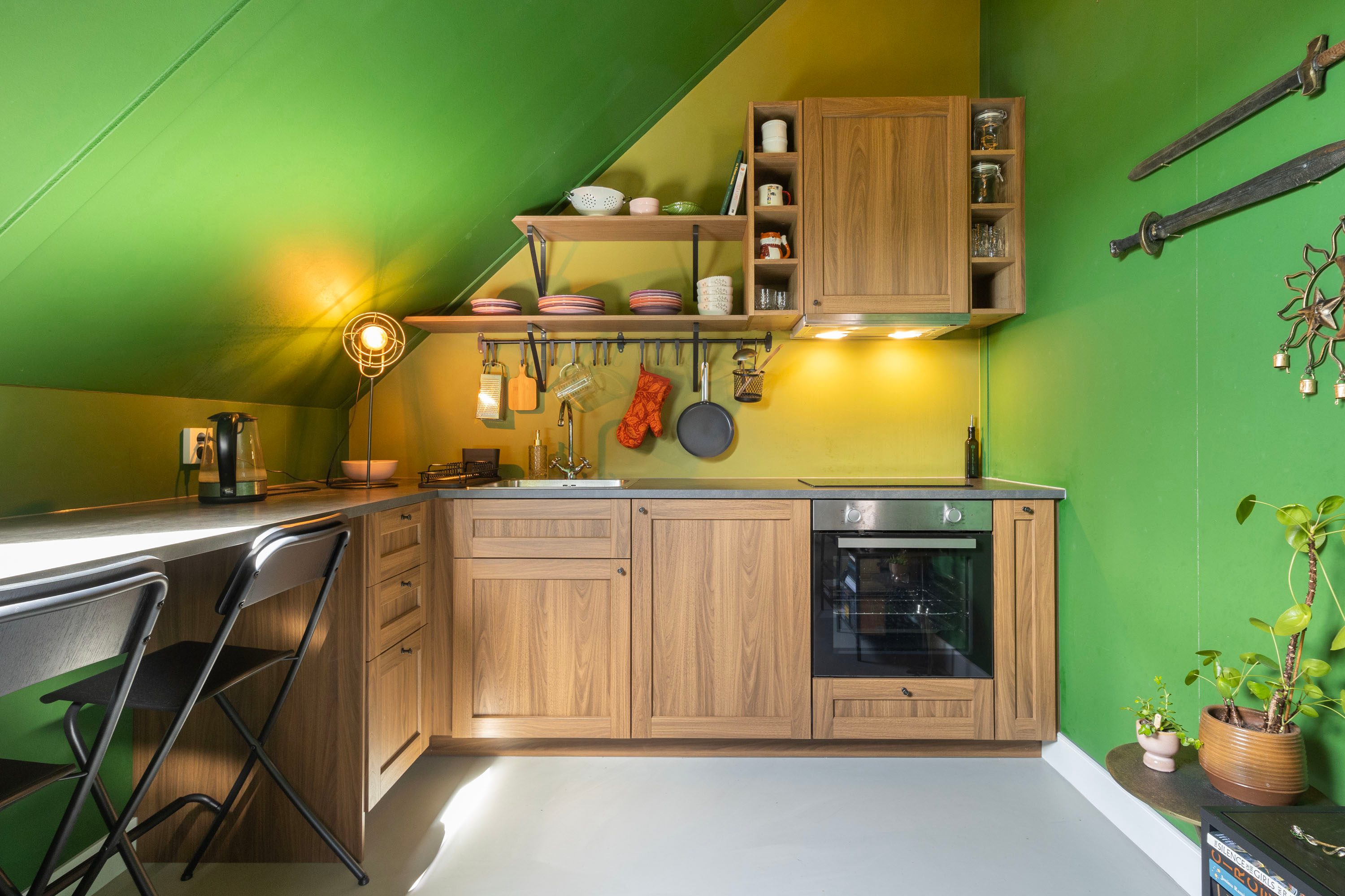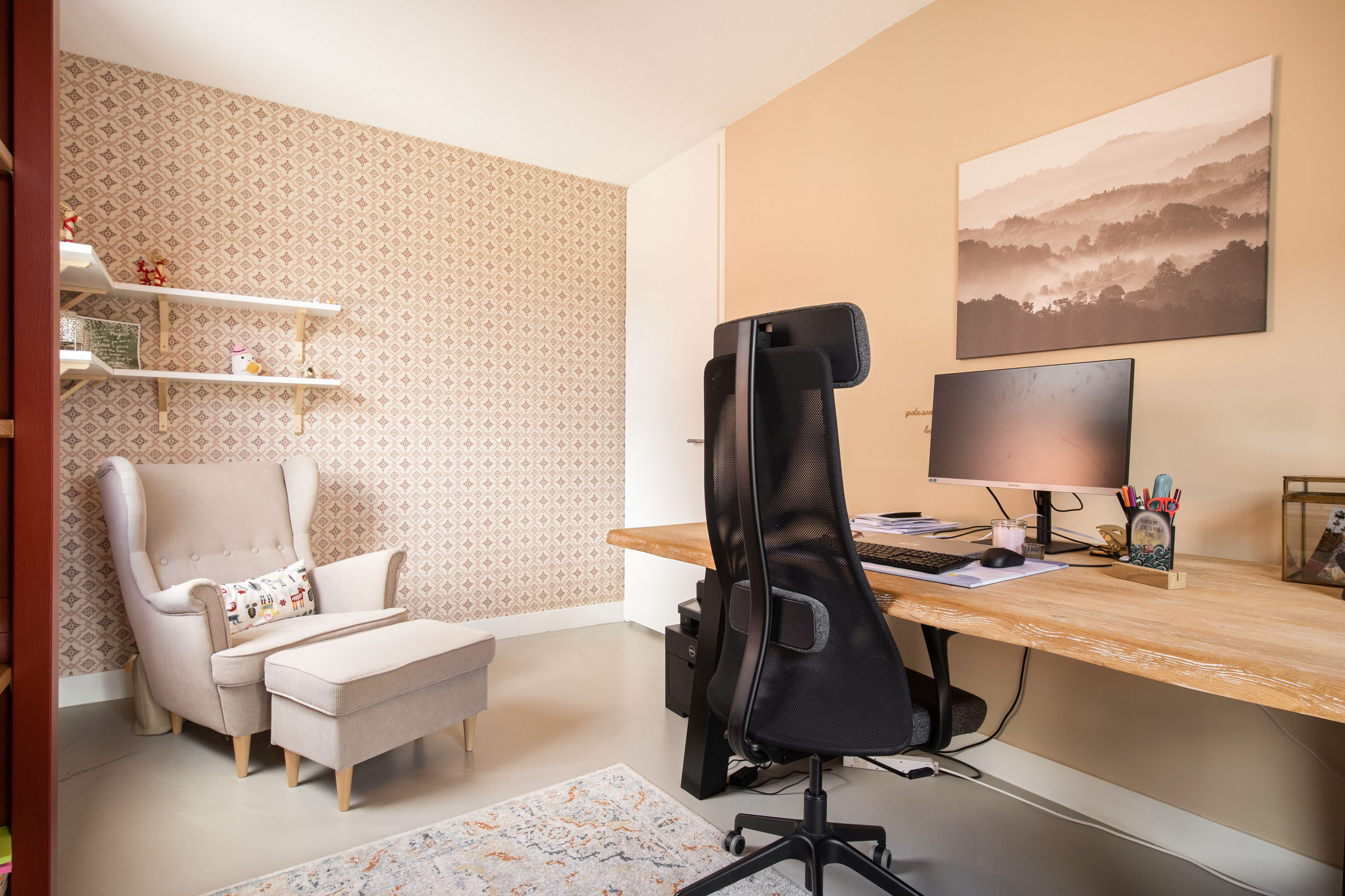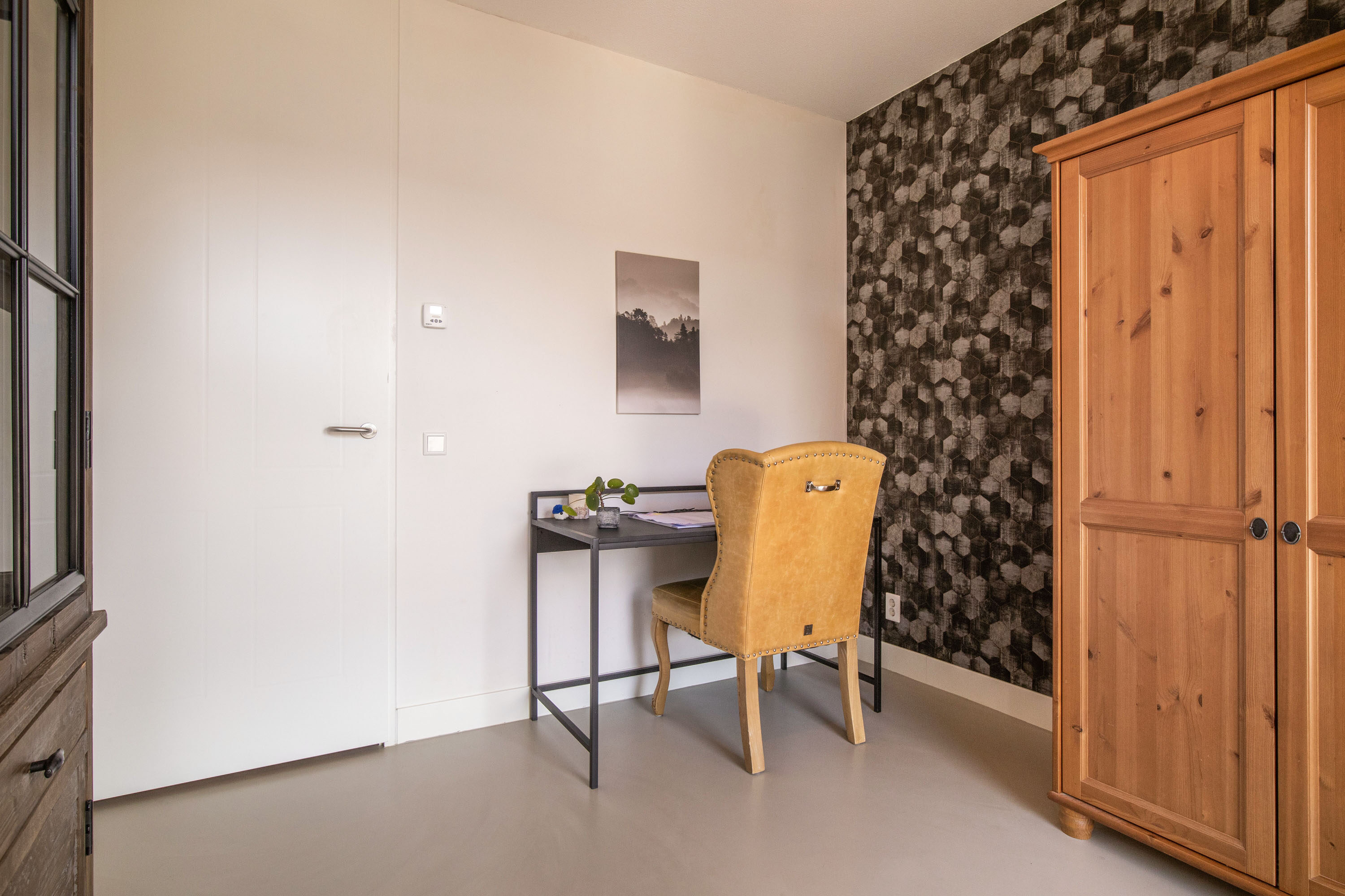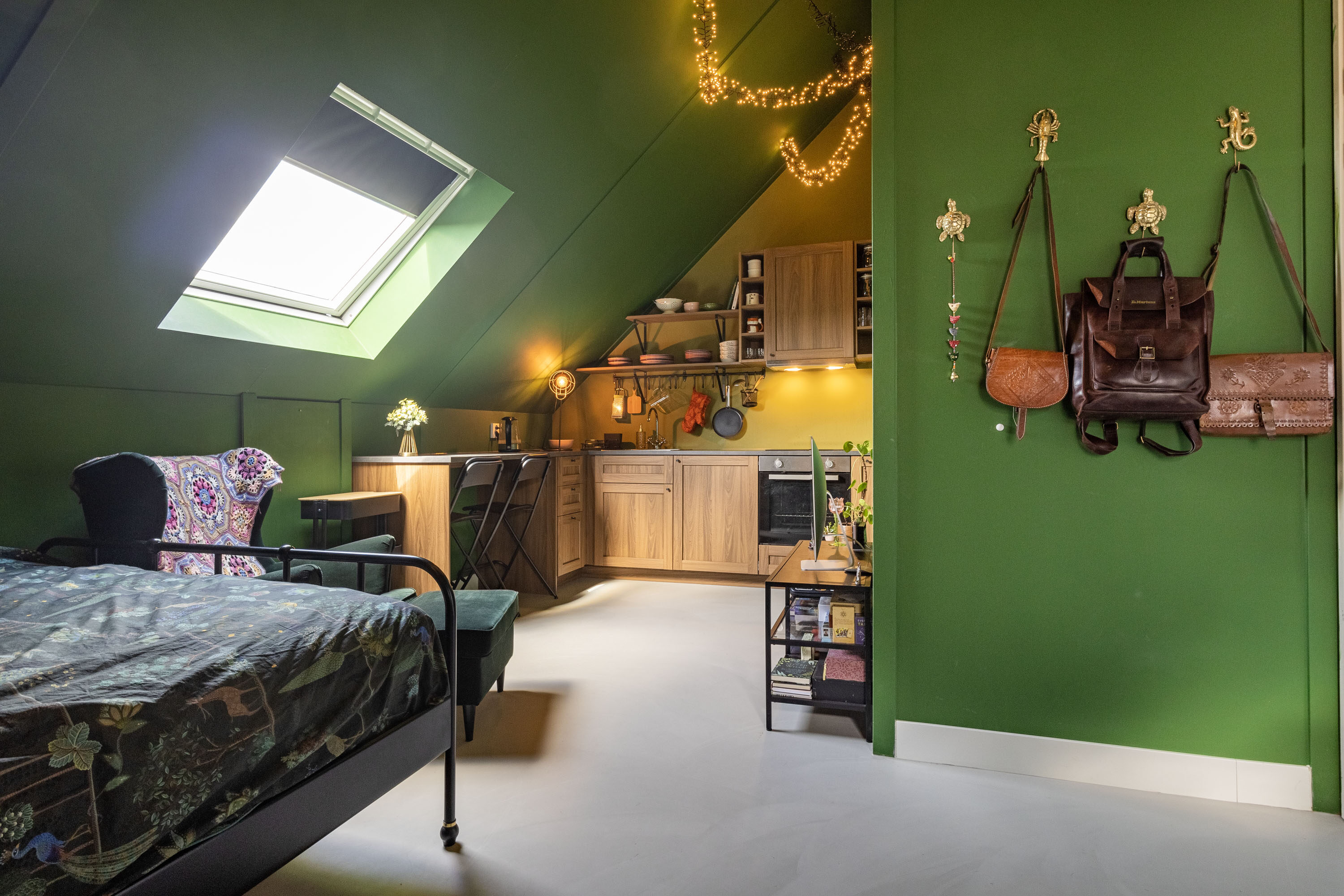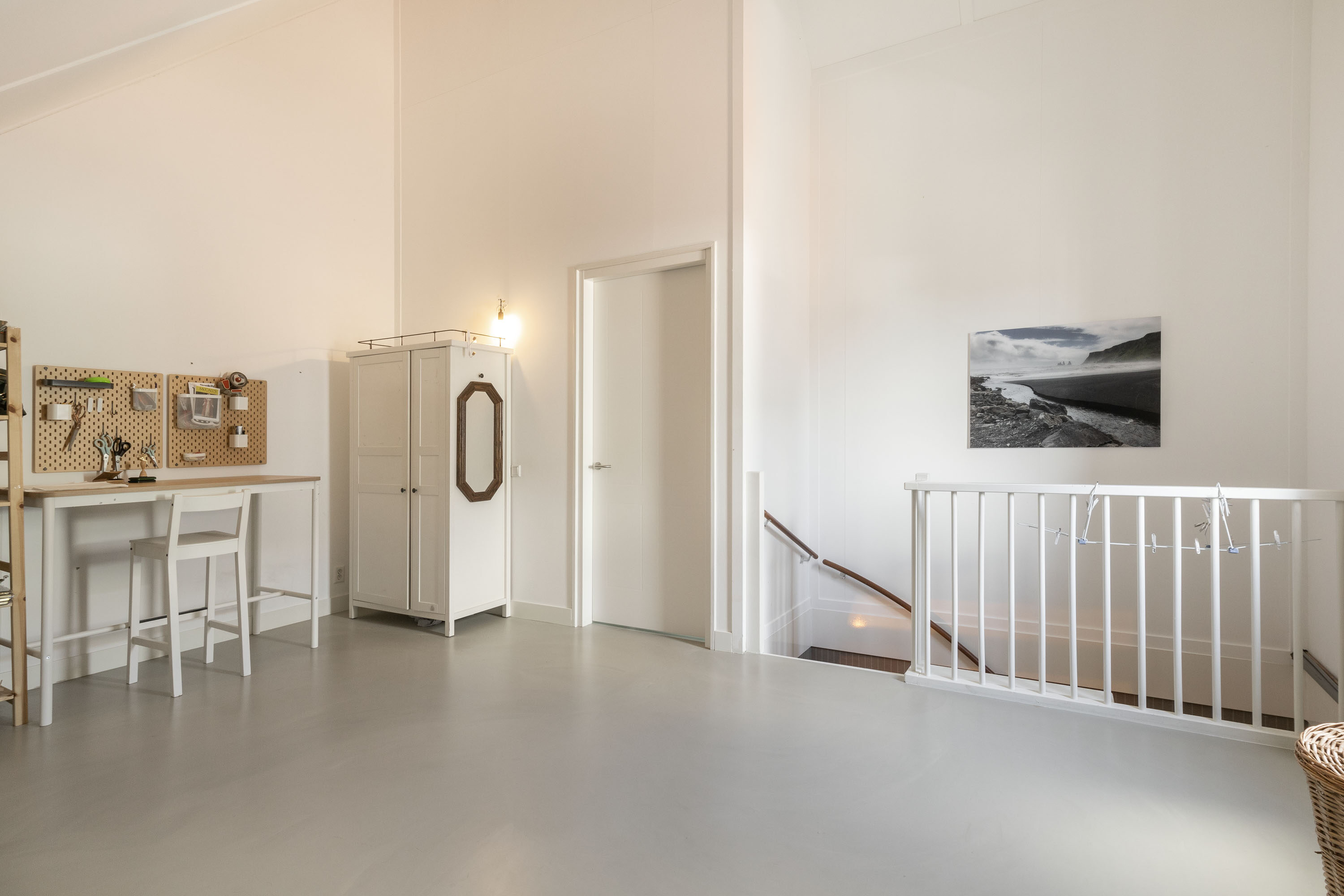 Bij het betreden van de tweede verdieping zult u direct verbaasd zijn over de hoogte van deze verdieping en de ruimte die deze met zich meebrengt. De ruimte is nu ingericht voorzolder met bergruimte en met de opstelling van de was apparatuur, ventilatie-unit. Er is daarnaast ruimte genoeg voor een werkplek. Verder op deze verdieping een ruime vierde slaapkamer met dak- en gevelraam. Deze slaapkamer beschikt over vloerverwarming-/koeling en is voorzien van een praktische inbouwkeuken die is uitgerust met warm- en koud stromend water, inductie kookplaat, oven, koelkast en afzuigkap.