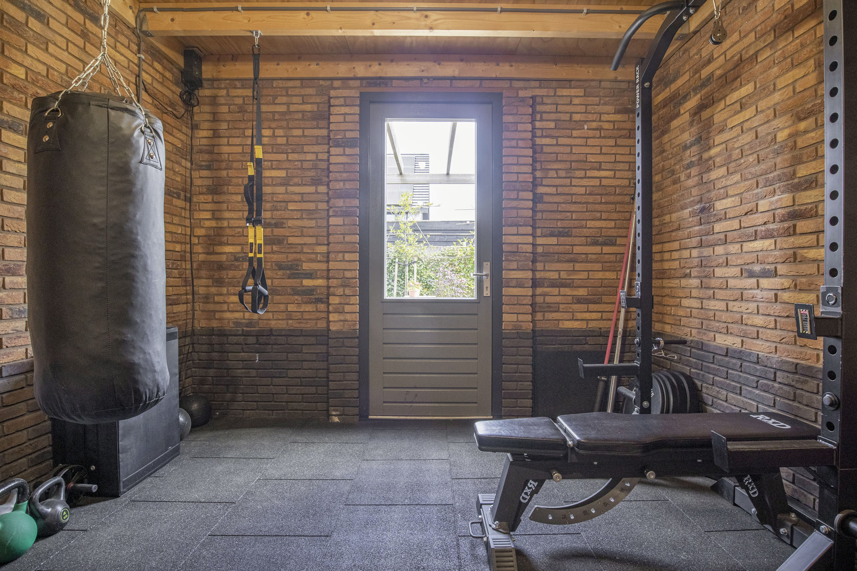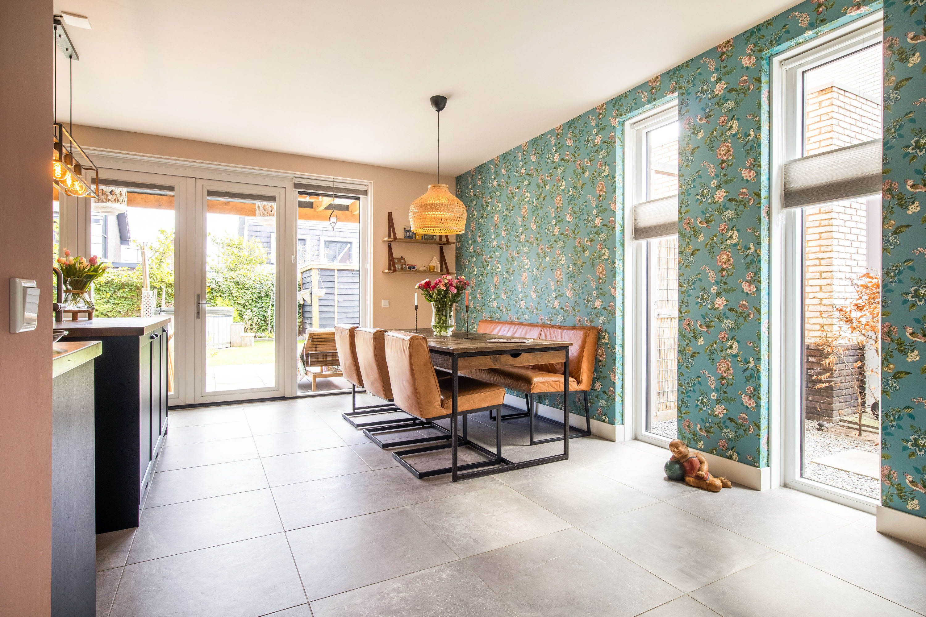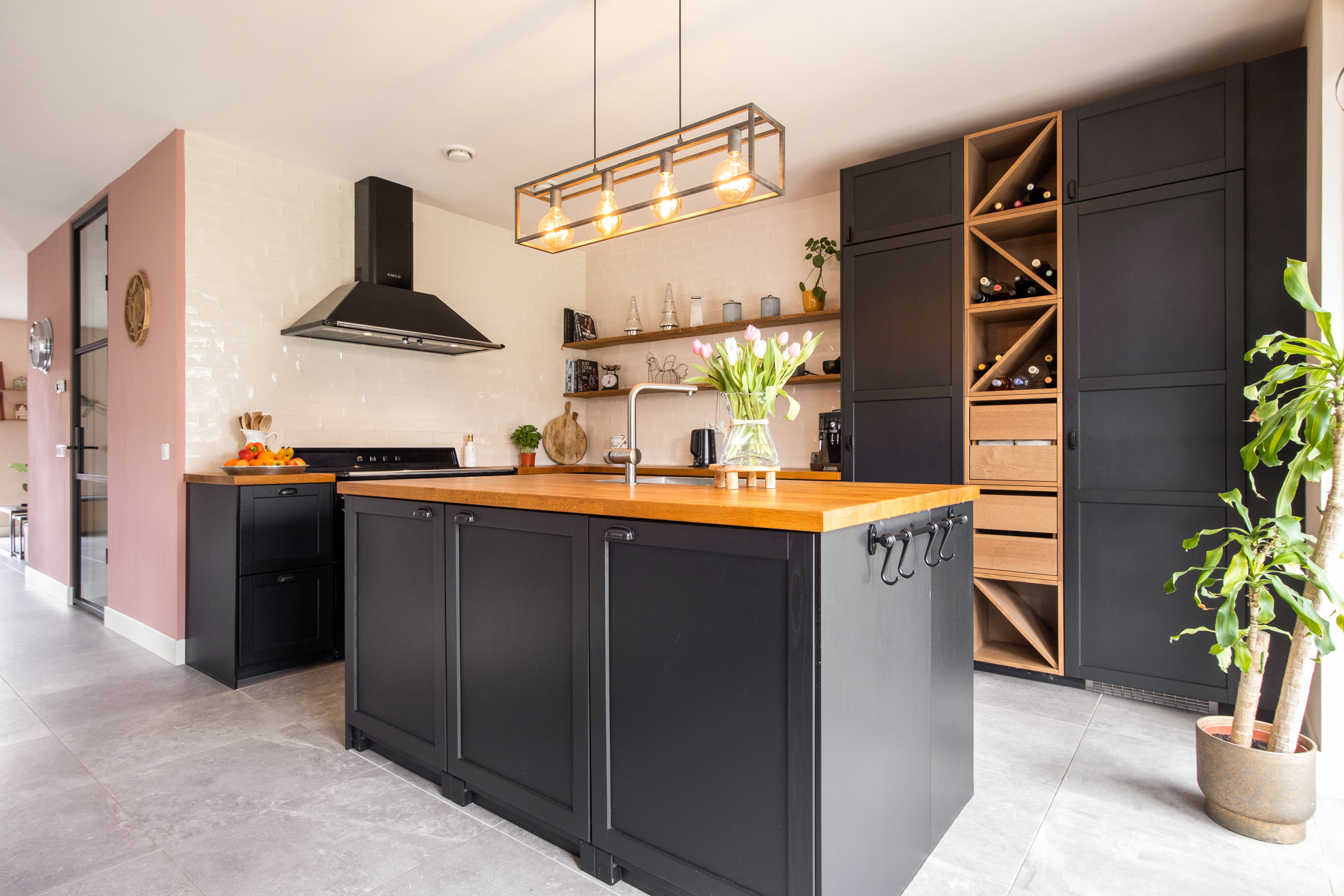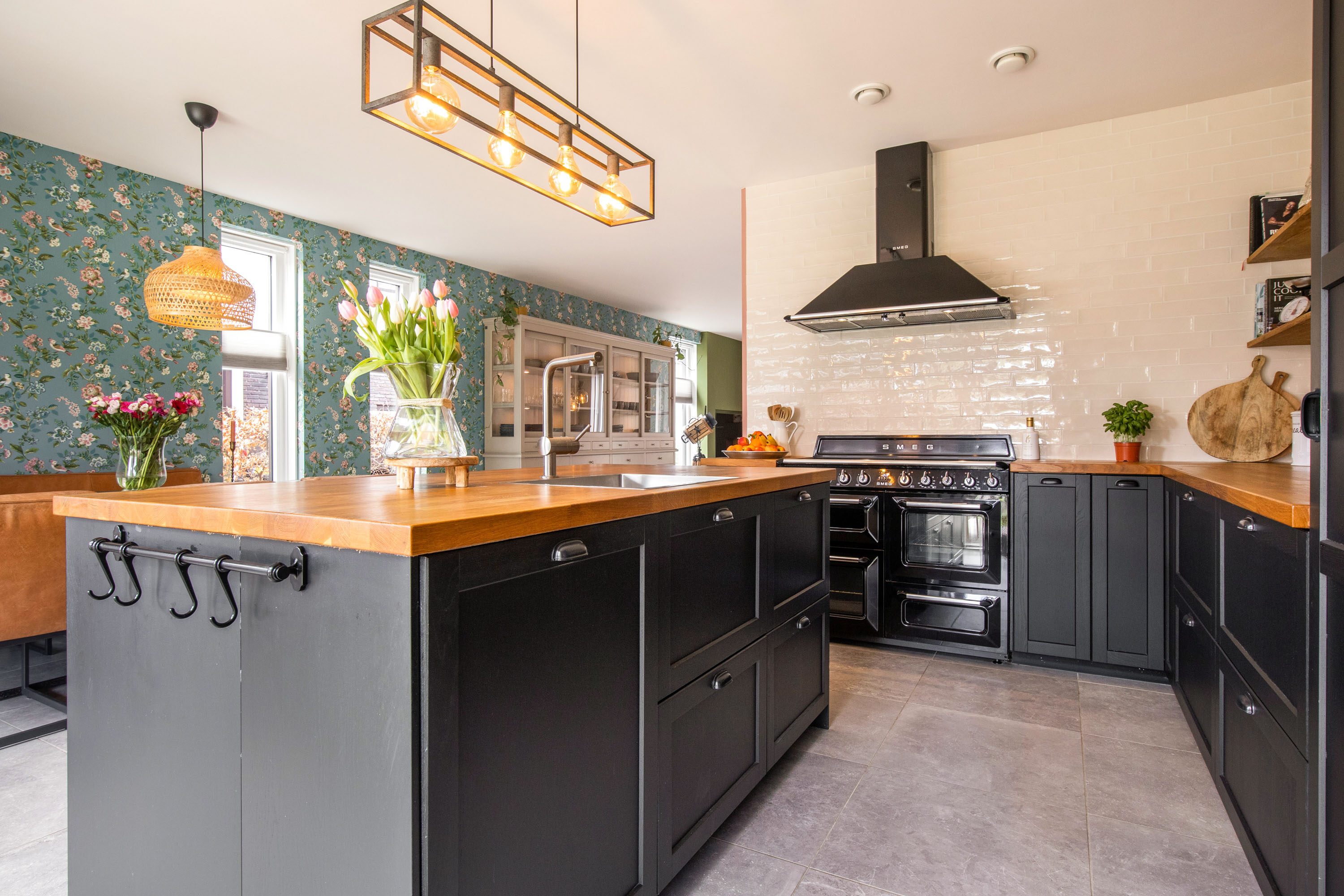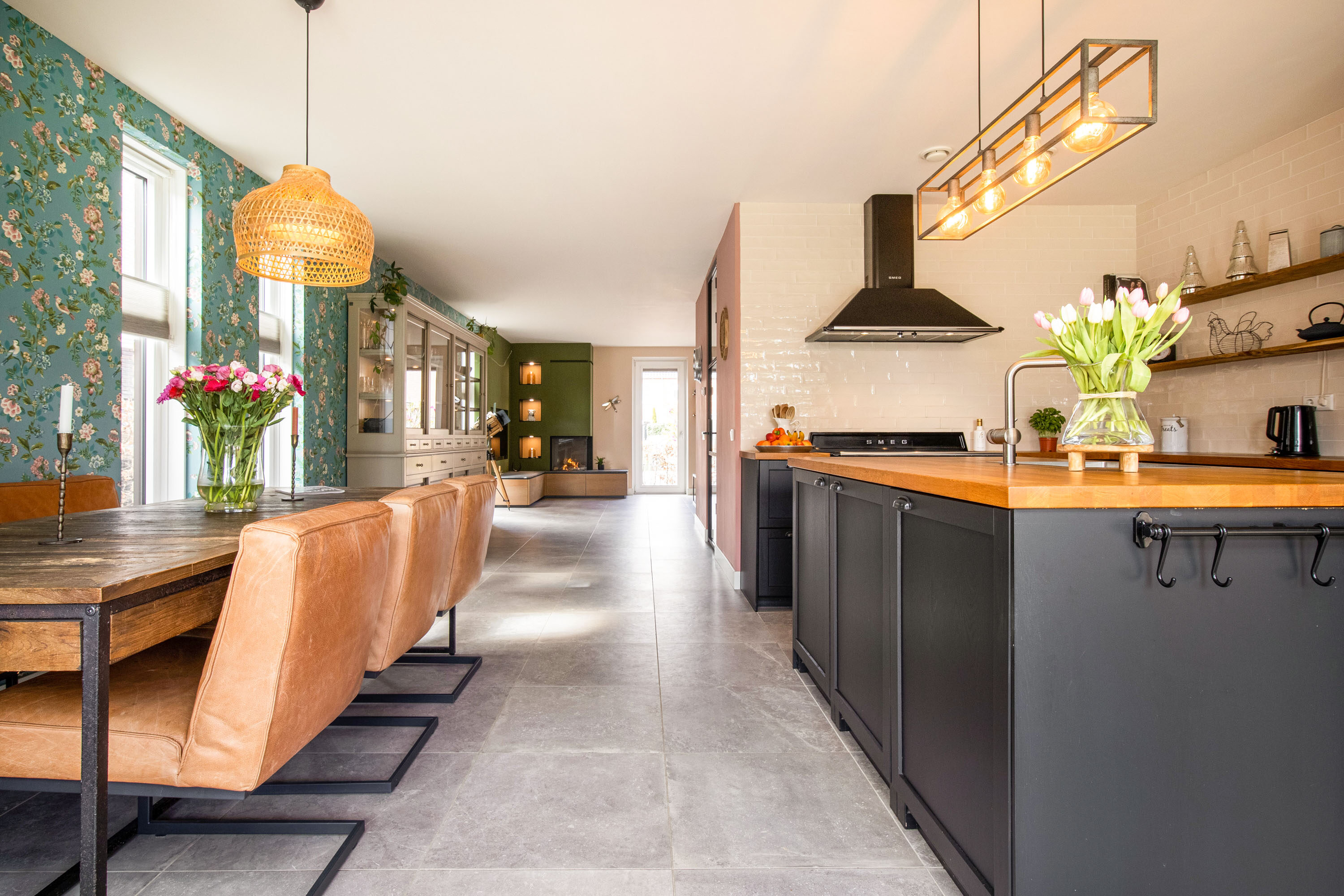 Verder is de uitgebreide luxe inbouwkeuken in L-opstelling geplaatst en heeft een spoeleiland. De keuken is uitgerust met veel kastruimte, wijnrekken en een massief houten blad. Qua apparatuur is er een zeer fraai Smeg fornuis met inductie kookplaat en drie ovens, daarboven een bijpassende Smeg afzuigkap. Prominent geplaatst is het spoeleiland, met veel werkruimte en uitgerust met een spoelbak en een vaatwasser. Tot slot heeft deze keuken een hoge kastenwand in zwarte uitvoering met diverse accenten in houtlook waar naast de diverse opbergruimte, de koelkast en vriezer geplaatst zijn. Vanuit de keuken geven twee tuindeuren toegang tot de sfeervolle overkapping die aan de achterzijde is aangebouwd. In de overkapping is een fraaie lichtstraat geplaatst.