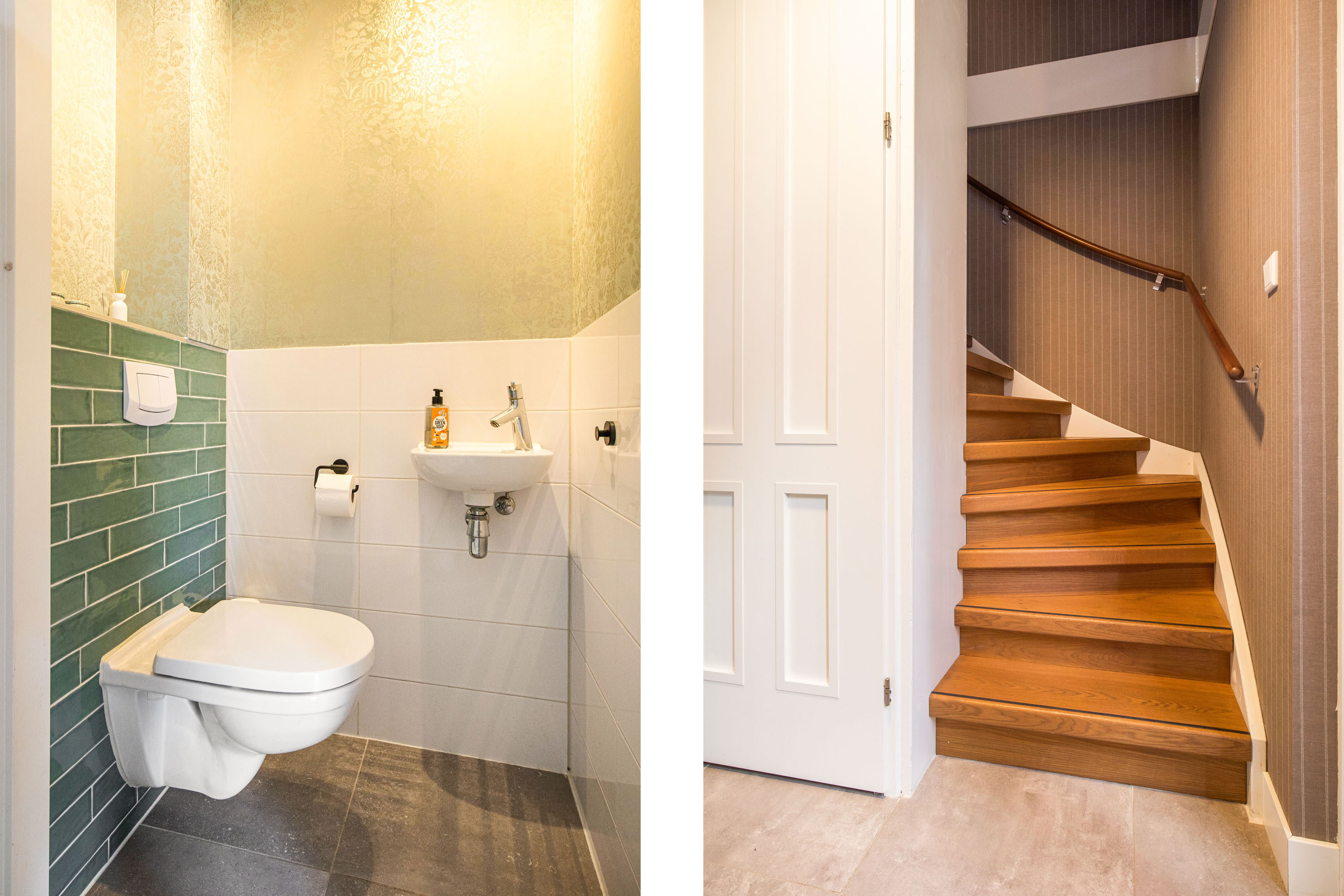 Er is een separate toiletruimte voorzien van een wandcloset en fonteintje, in de zelfde kleurstelling als de badkamer.