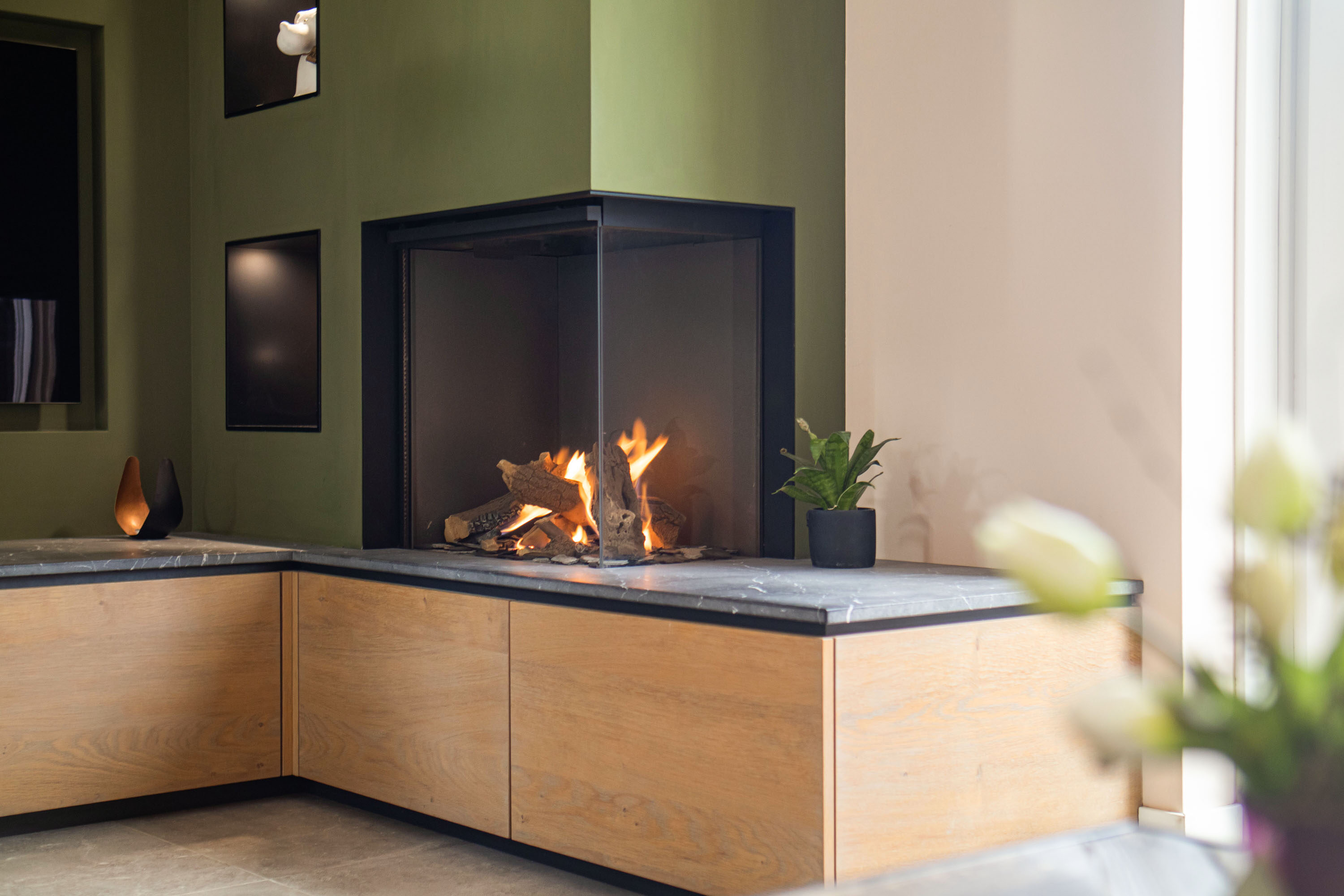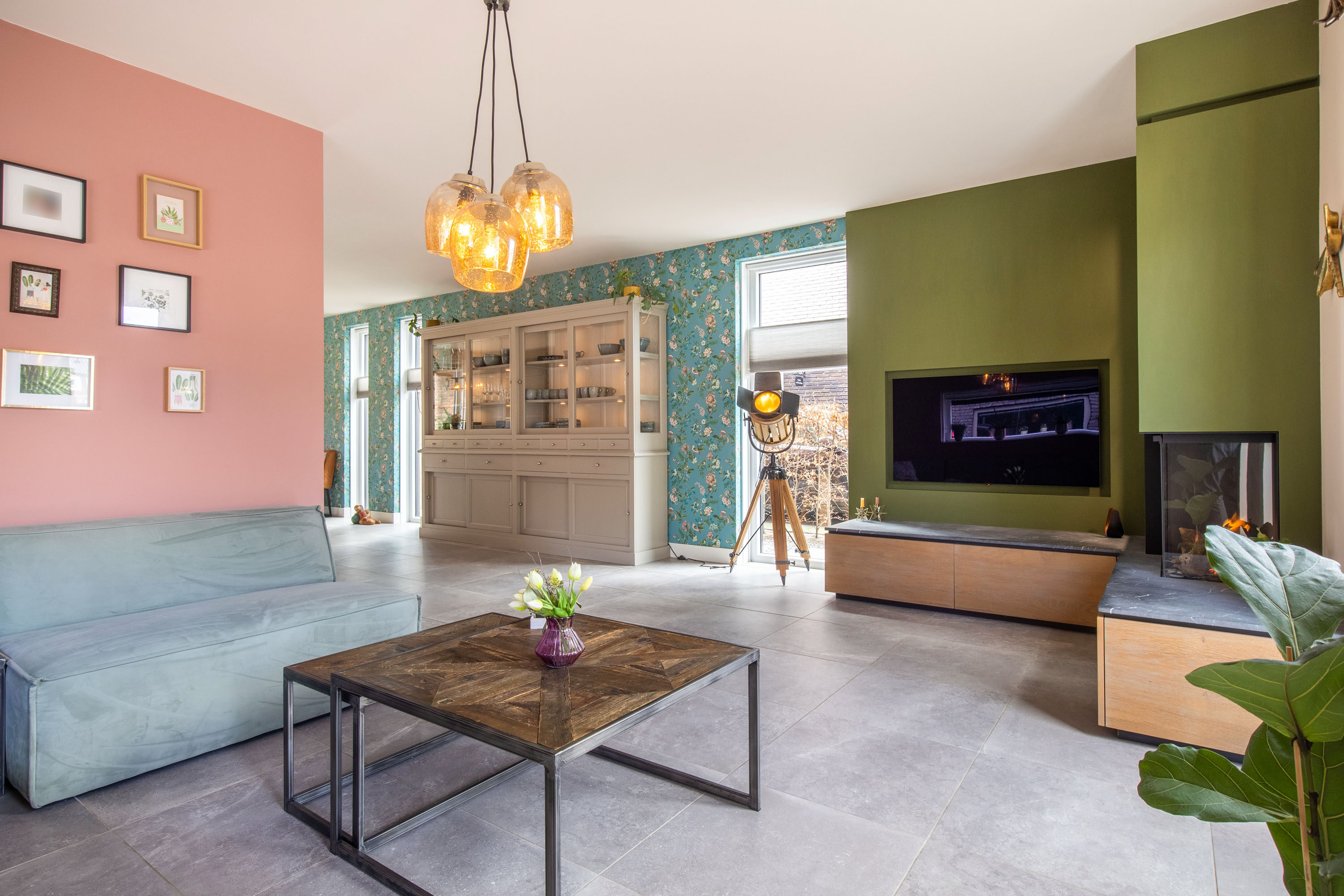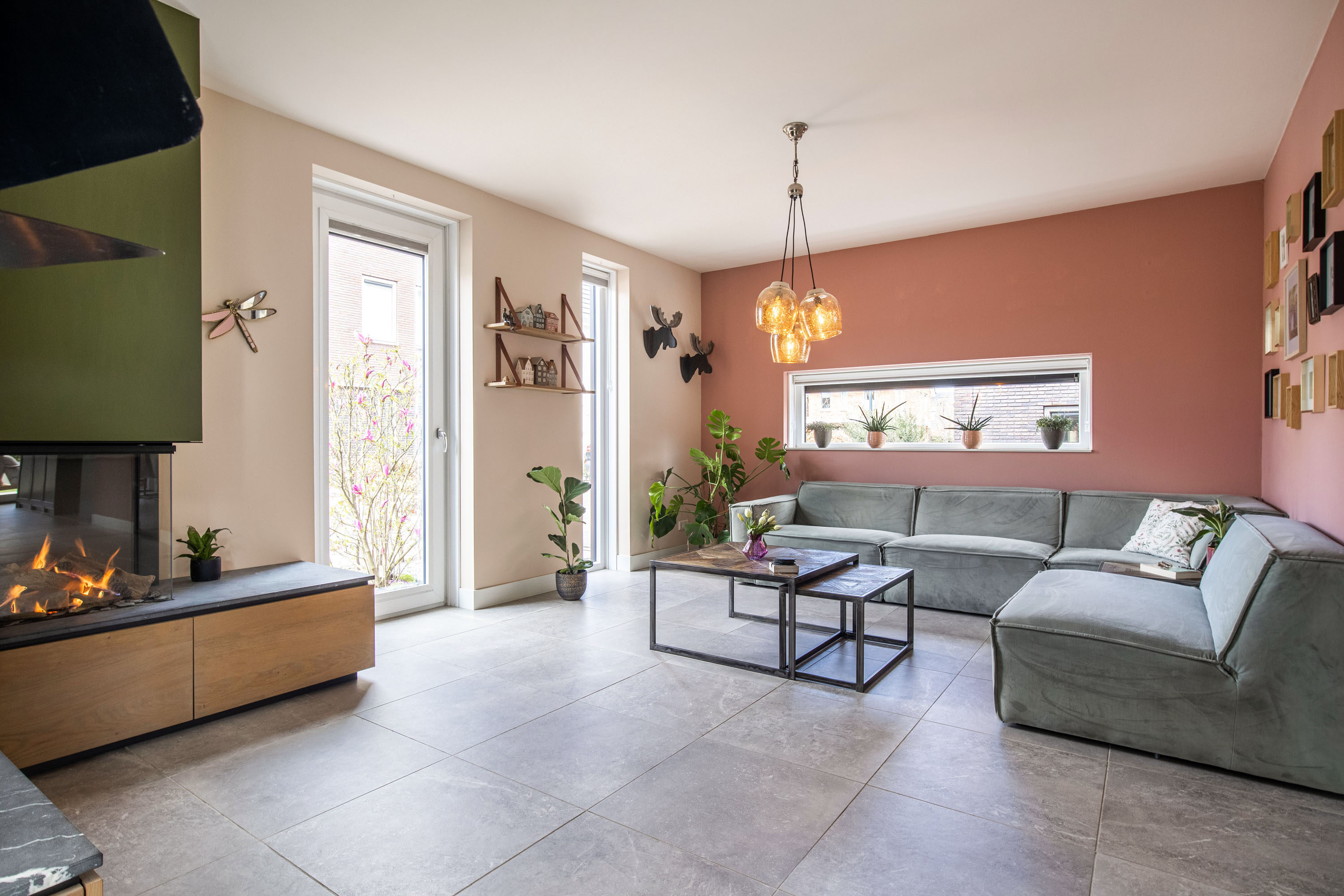 De woonkamer, aan de voorzijde gesitueerd, is zeer sfeervol, mede door de aanwezige gashaard (op propaangasflessen) met een strak wand-zitmeubel. Door het gebruik van warme kleuren en lichtgrijze vloertegels is er eenheid en rust in de woonkamer.