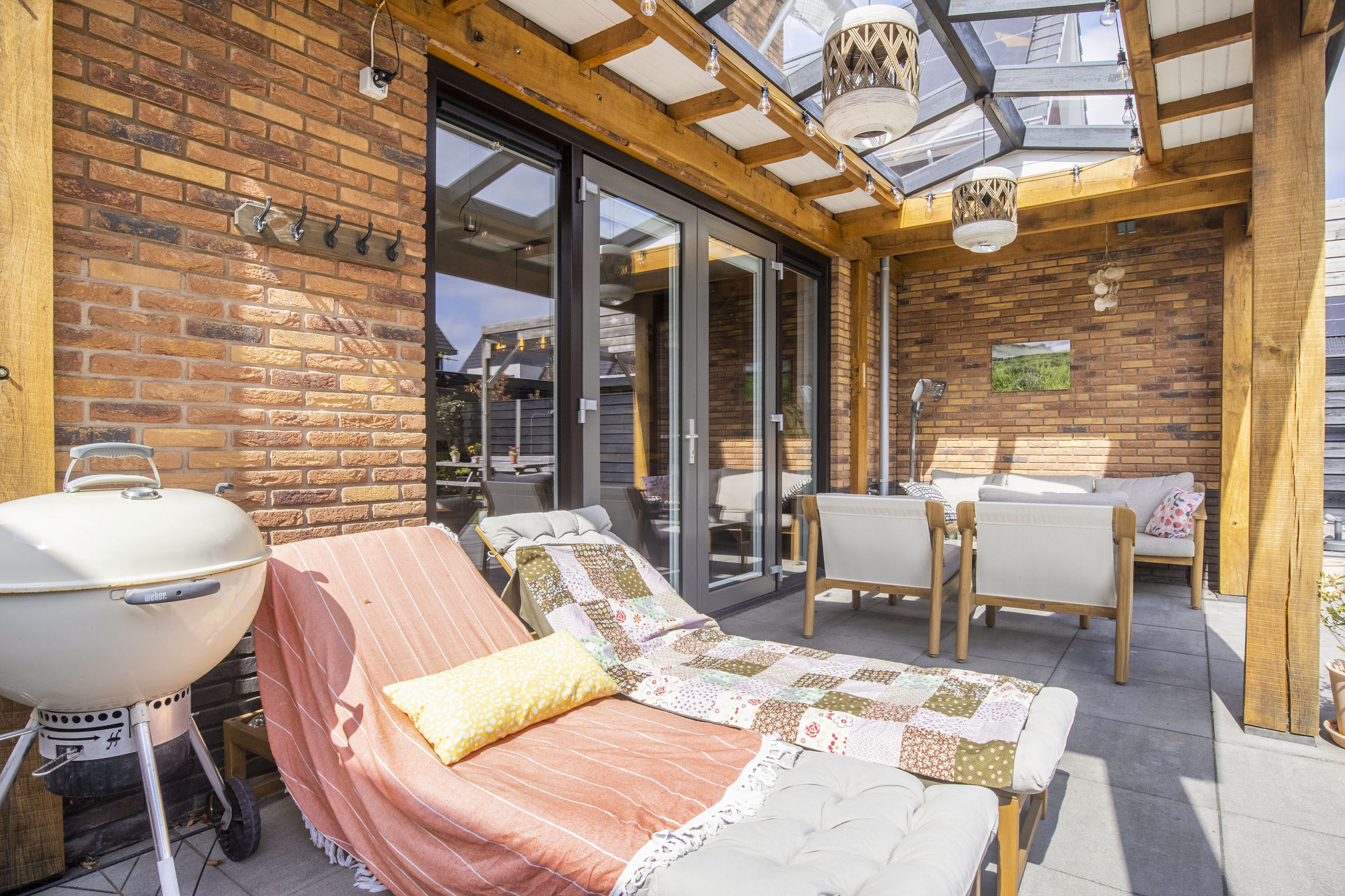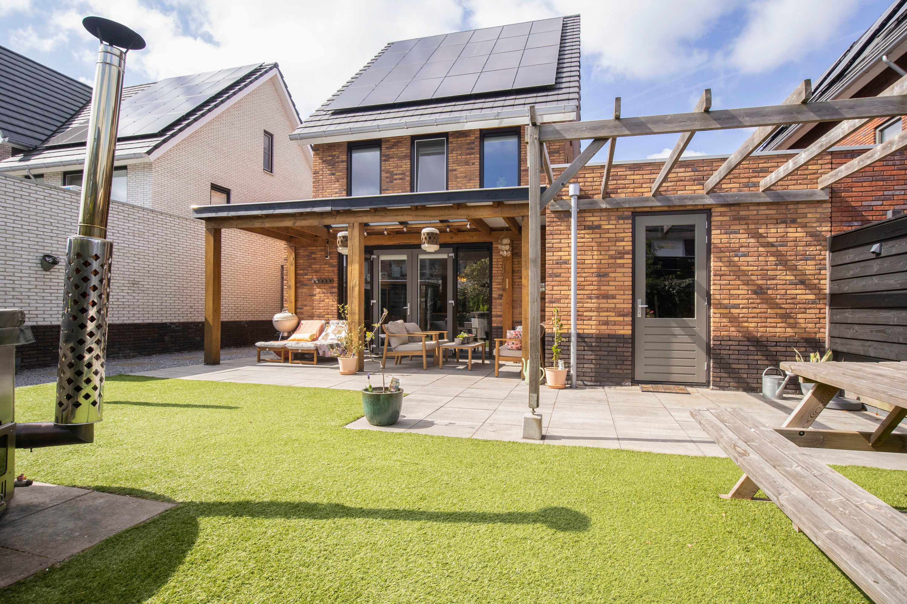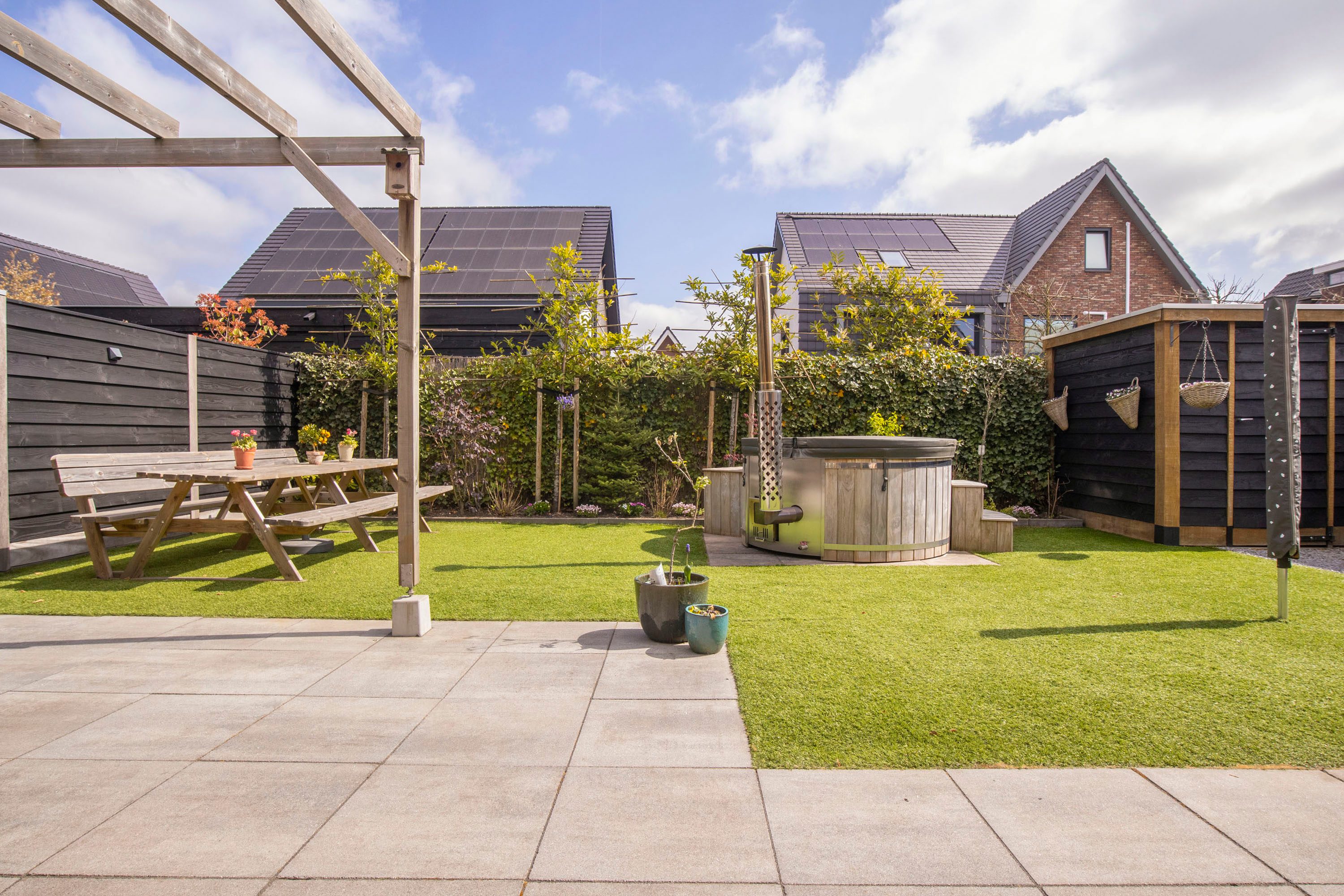 Fijne, op het zuidoosten gelegen, verzorgd aangelegde achtertuin met mooie sierbestrating en kunstgras gazon! Mooie grote terrastegels met naast de woning een grindpad met staptegels. Het pronkstuk is de aan de woning aangebouwde overkapping met een mooie lichtstraat voor extra daglicht onder de overkapping en in de keuken. Ook is er een praktische houten berging, ruim genoeg voor fietsen en overige tuinbenodigdheden.
