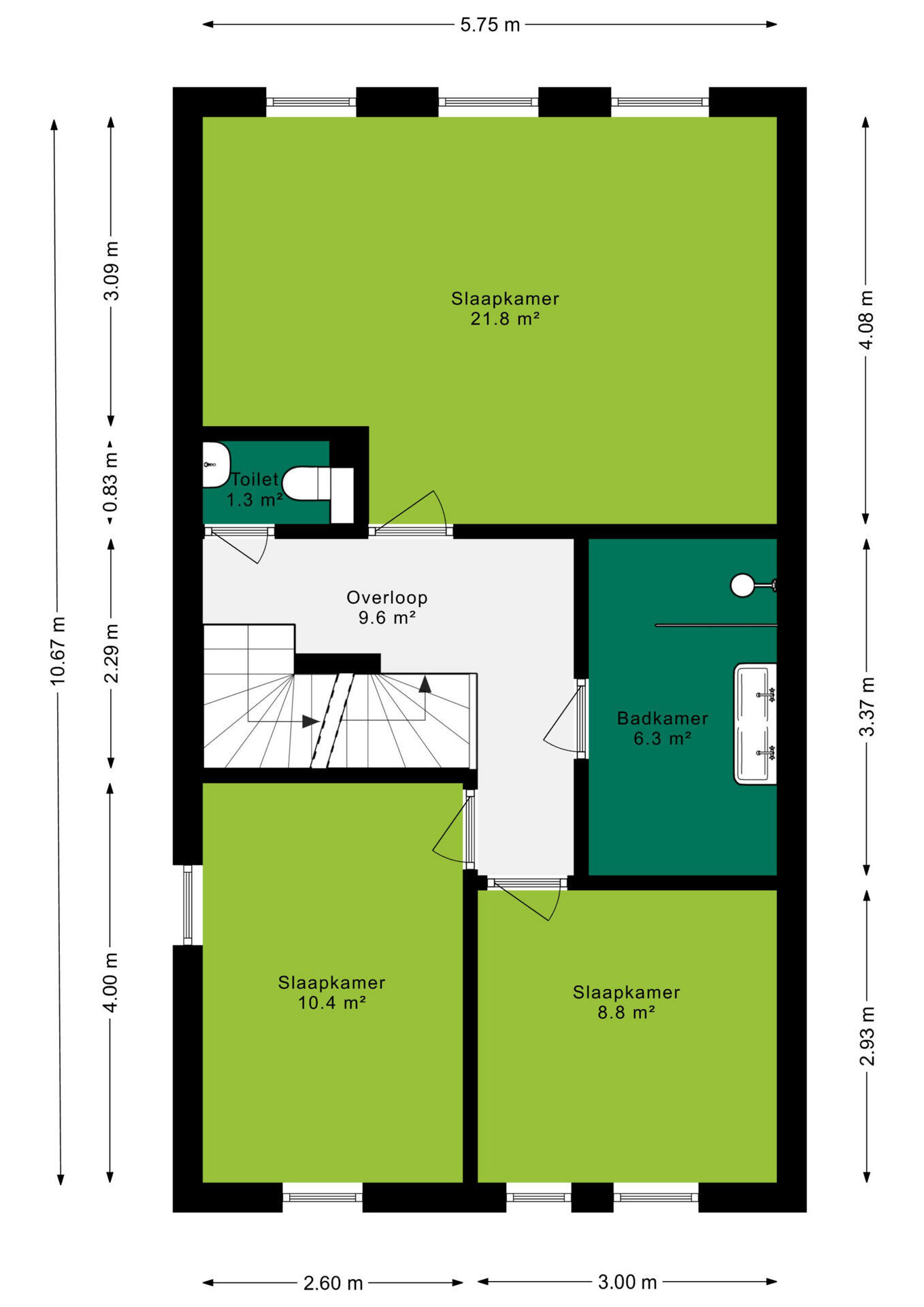 Vanuit de ruime overloop zijn alle vertrekken te bereiken. Slaapkamer 1 is over de gehele breedte van de woning aan de achterzijde gesitueerd en heeft de royale afmeting van 21.8 m². Slaapkamer 2 en 3 zijn gelegen aan de voor-/zijzijde van de woning.