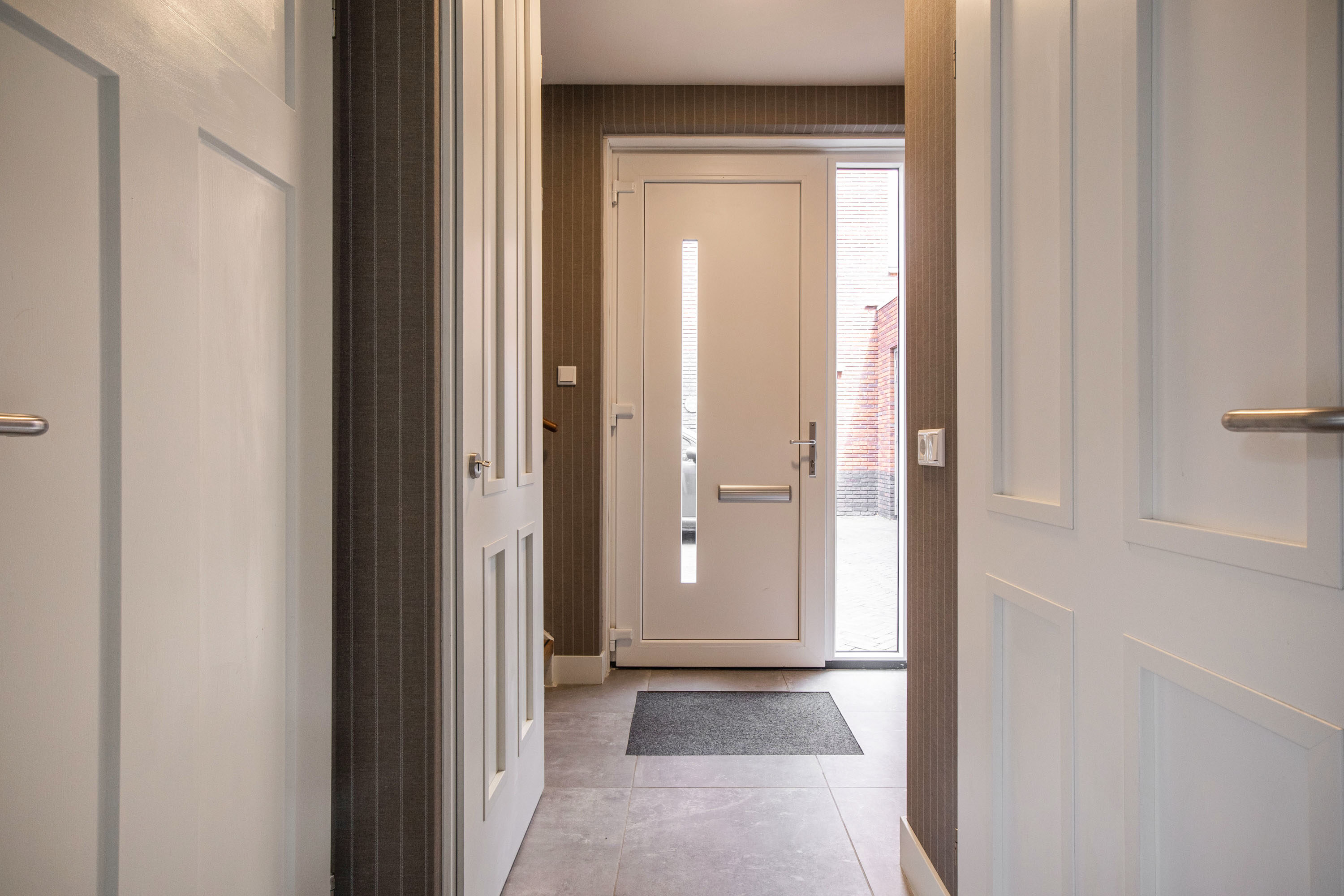 Entree/hal, uitgebreide meterkast met DEVO systeem, luxe toiletruimte met zwevend toilet en fonteintje in moderne kleurstelling. Vanuit de hal geeft een stalen deur toegang tot de woonkamer en keuken. De ruime open keuken is aan de tuinzijde gelegen en heeft voldoende ruimte om ook de eettafel te plaatsen. Doordat in de gevel meerdere ramen zijn geplaatst die tot op de grond reiken is de keuken een zeer lichte ruimte.
