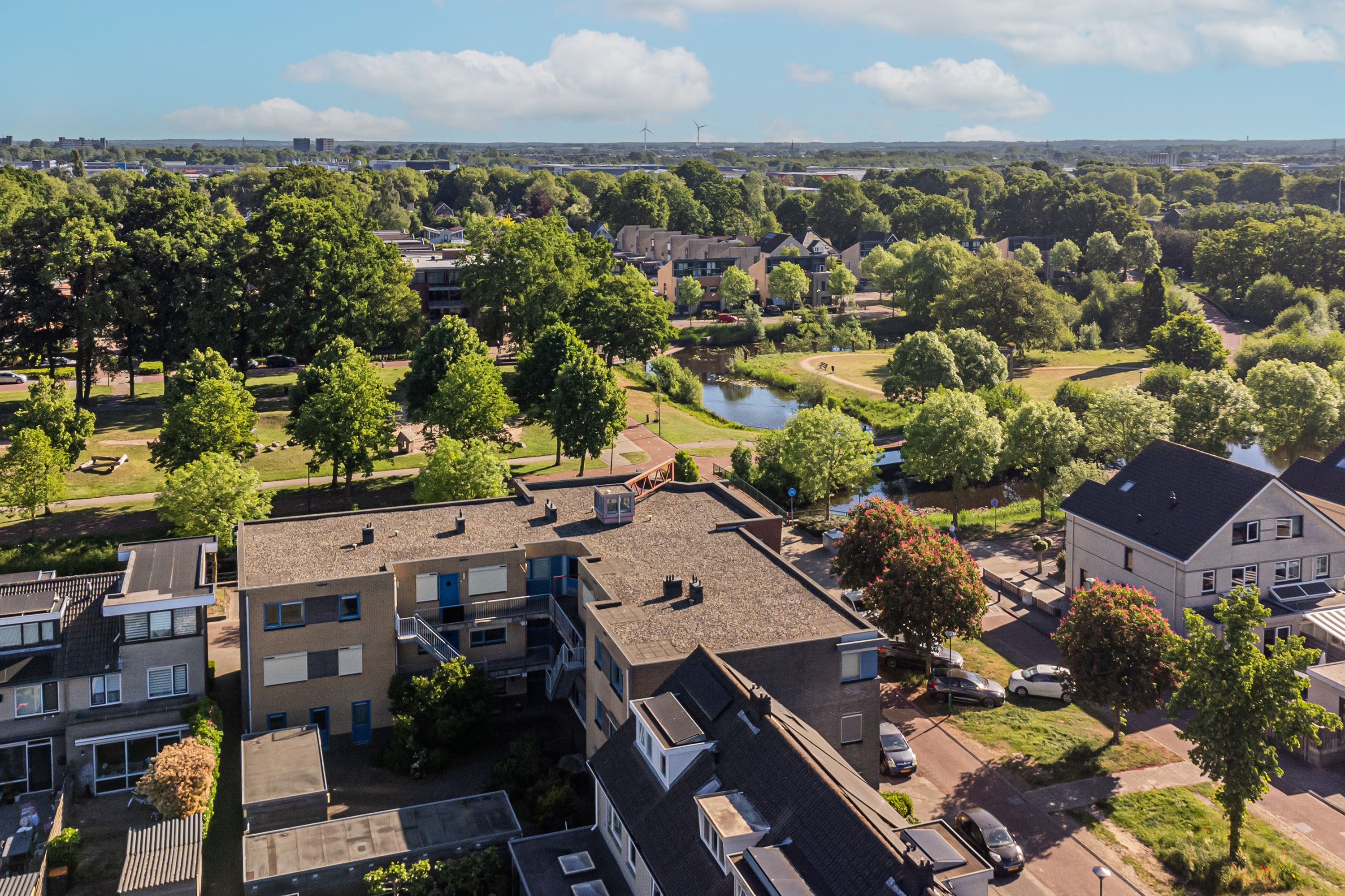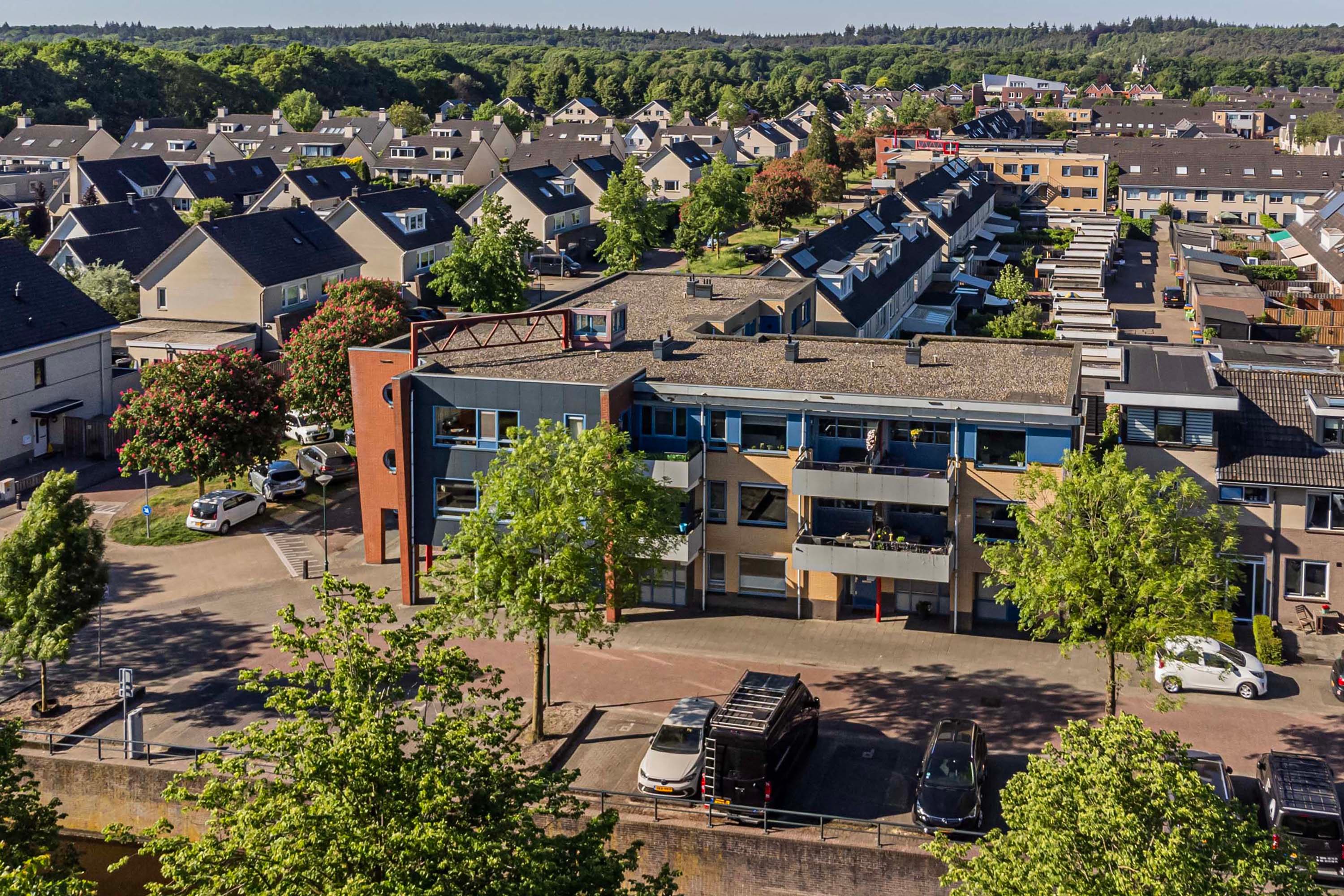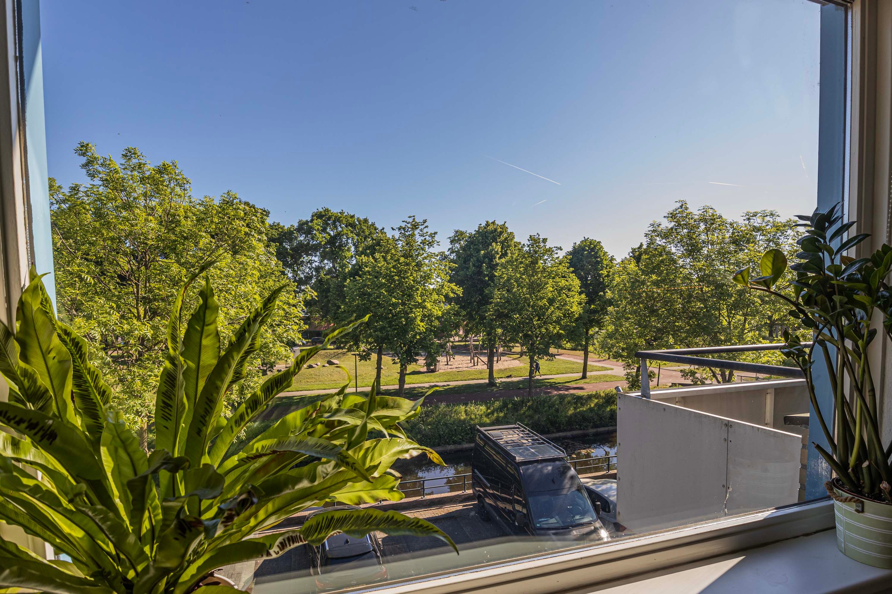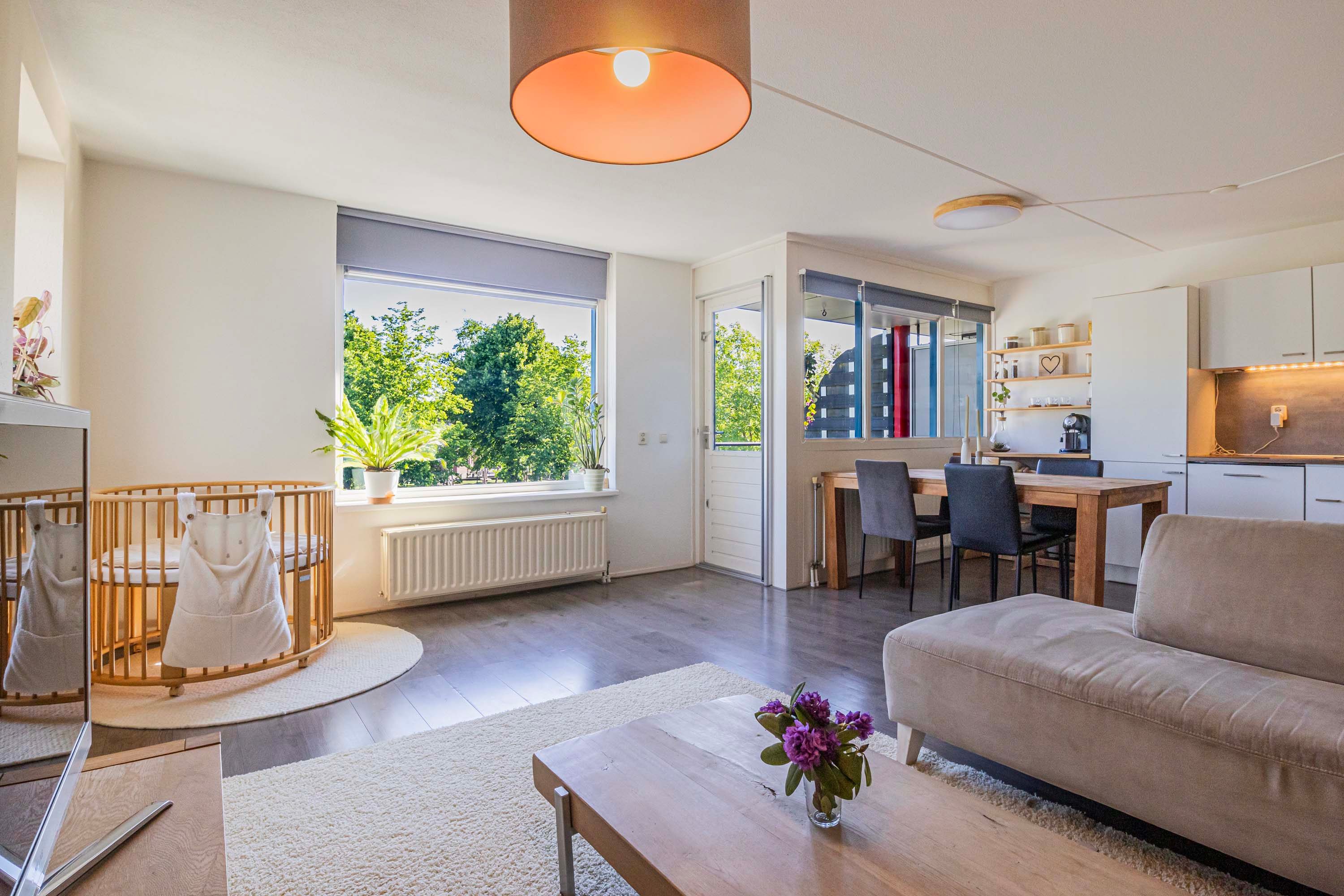 Op de hoogste verdieping, op een beschutte hoeklocatie en met een van de mooiste uitzichten van Petenbos: dit lichte appartement biedt volop privacy, geen inkijk, en een levendig uitzicht over groen en spelende kinderen.