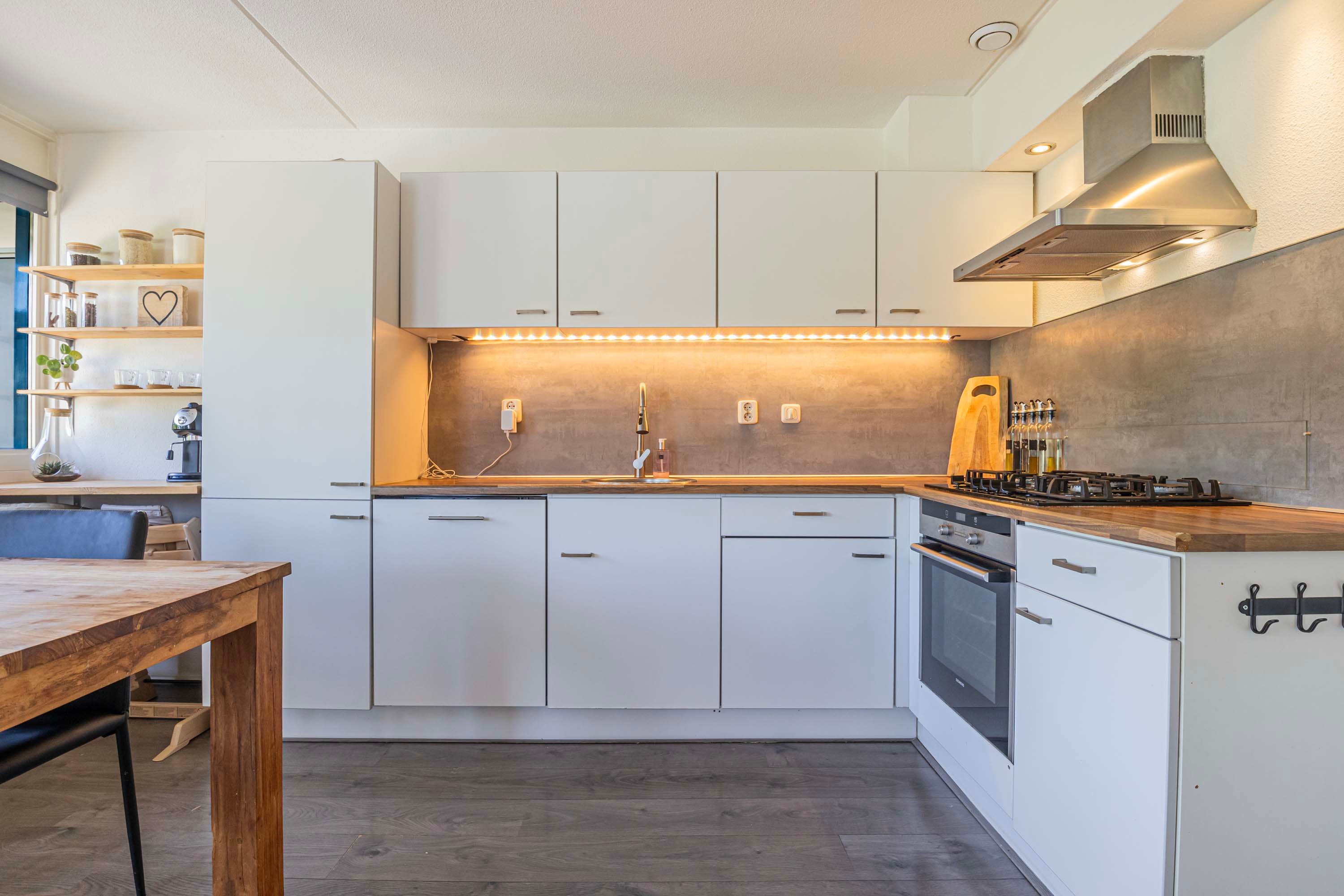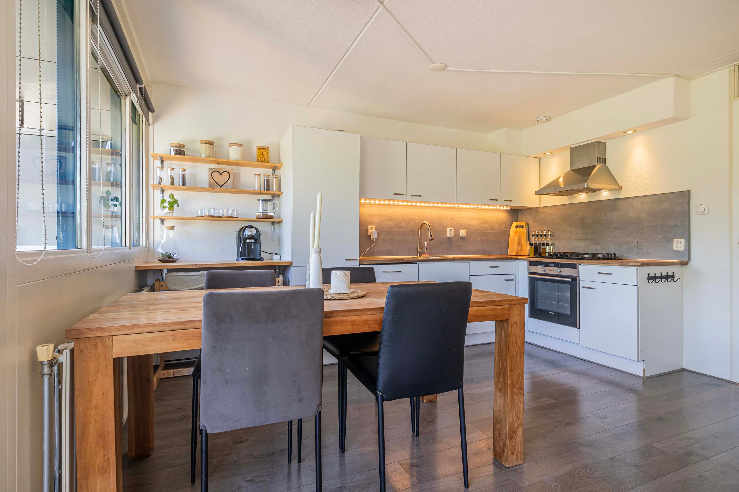 De keuken staat in open verbinding met de woonkamer, wat gezelligheid tijdens het koken garandeert. De keuken biedt veel opbergruimte dankzij de boven- en onderkastjes. Daarnaast beschik je over alle noodzakelijke inbouwapparatuur, waaronder een 4-pits gasfornuis met afzuigkap, vaatwasser, koel-/vriescombinatie en oven.