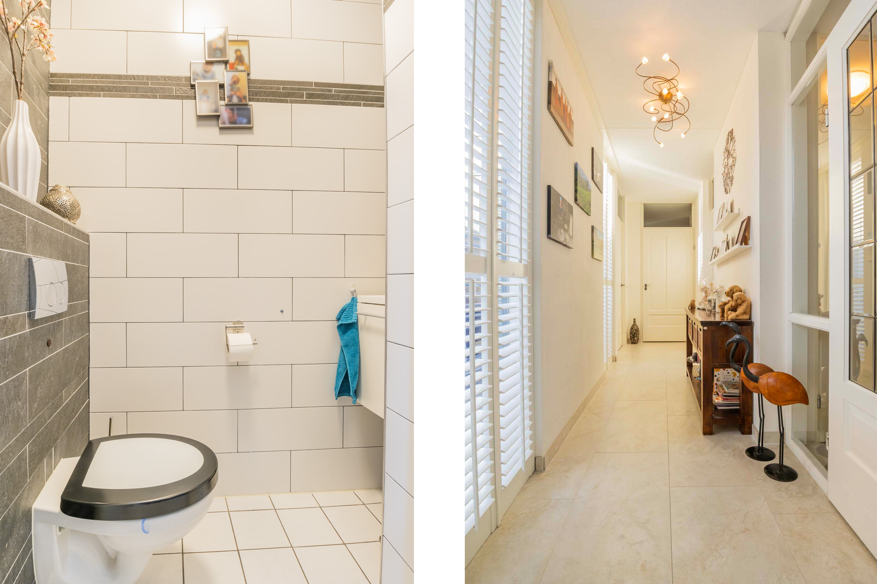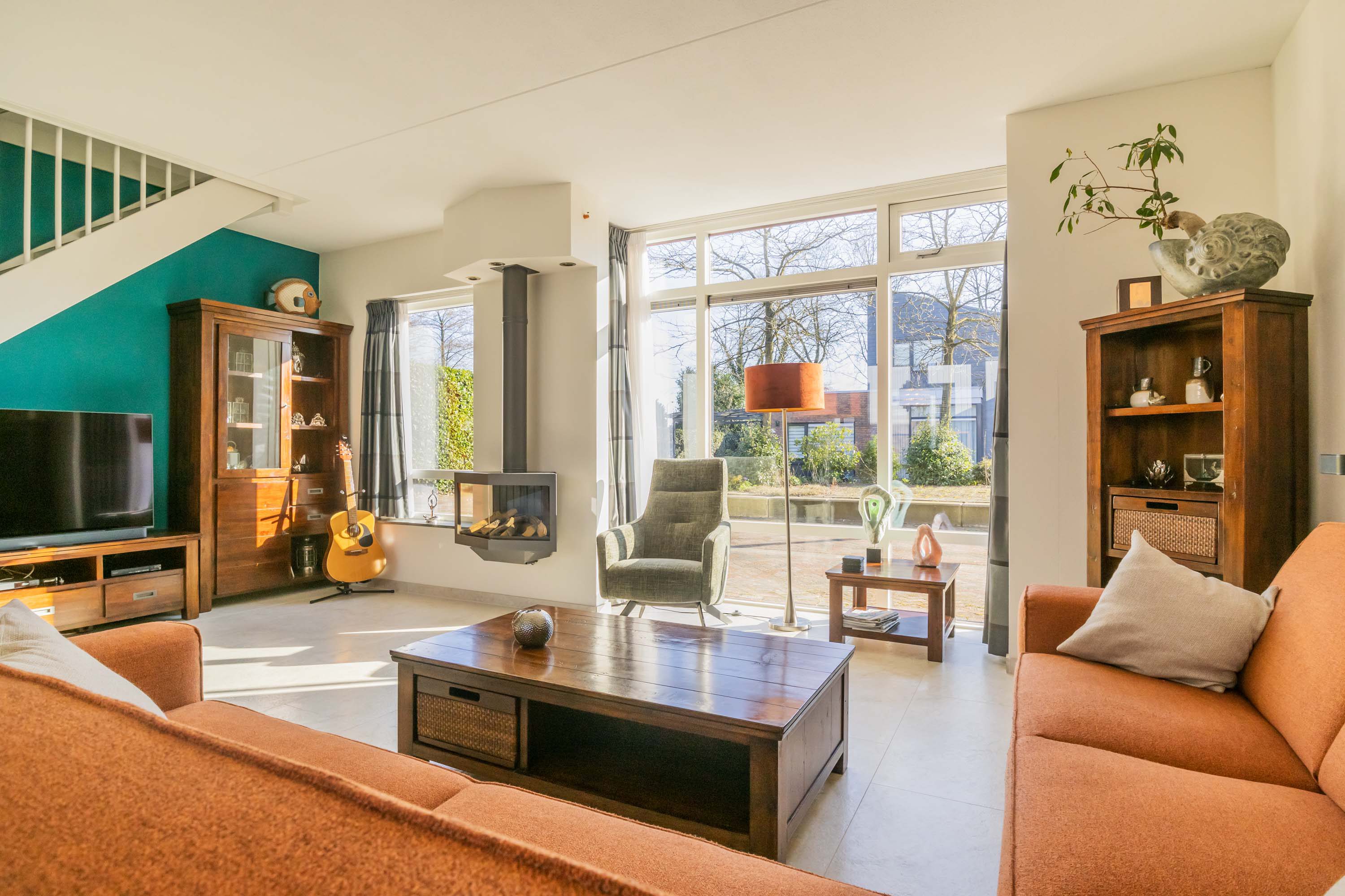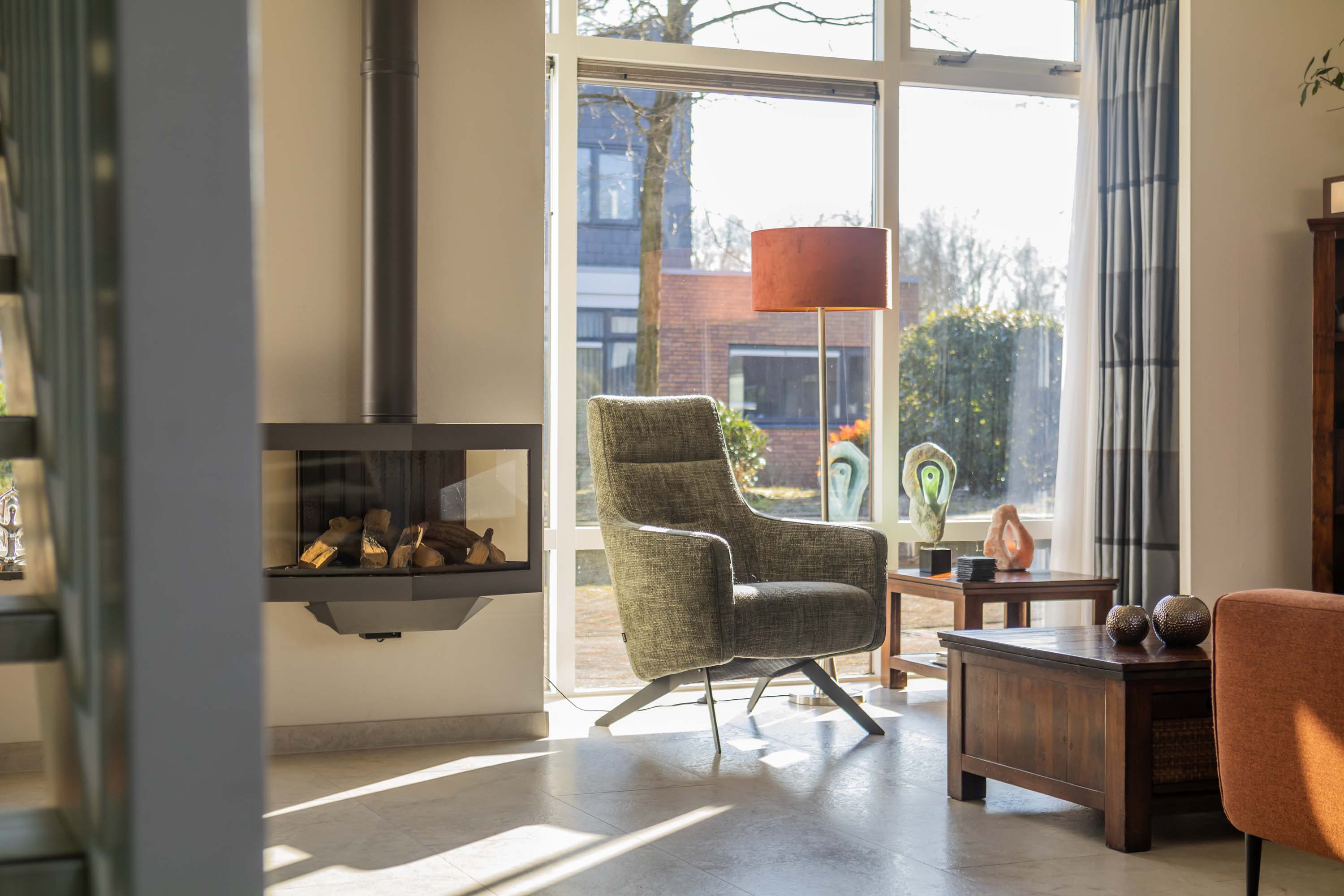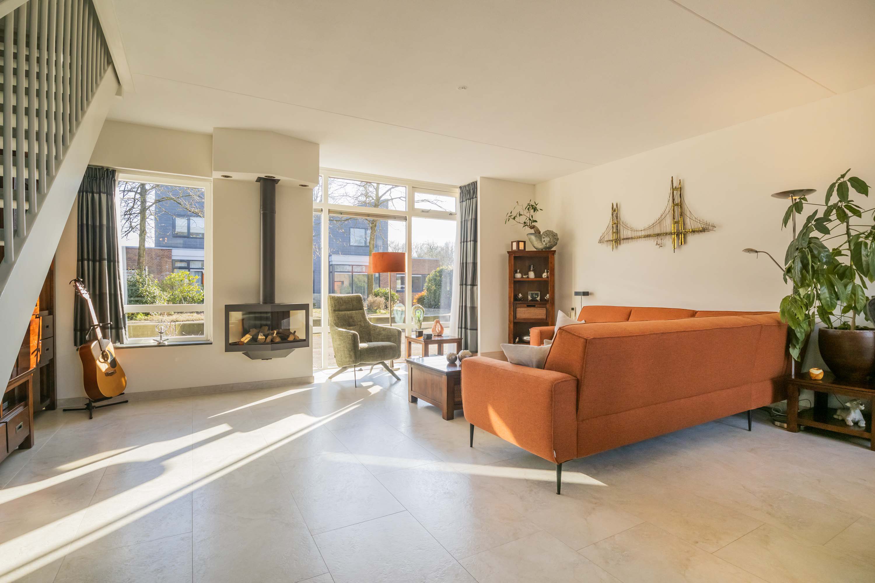 De entreehal is voorzien van een meterkast en inpandige berging en cv-ruimte, waar de mechanische ventilatie-unit en HR-cv-combiketel (merk: Nefit Proline HR CW4 combiketel, 2019) staan opgesteld. De keurige moderne toiletruimte is voorzien van wandcloset en een wastafelkast en is betegeld met lichte wand- en vloertegels met antraciet kleurige accenten. Vanuit de entreehal is er toegang tot de royale woonkamer van maar liefst 41.2m² met een open trapopgang naar de verdieping en prettig veel lichtinval door de vele raampartijen en een grote glazen pui met openslaande deuren naar de patio. Deze besloten patio biedt veel privacy en rust om te relaxen. De royale woonkamer beschikt over een mooie gashaard en tevens een airco om het binnenklimaat optimaal te kunnen regelen. De begane grond vloer is betegeld met een lichte plavuizen vloertegel met comfortabele vloerverwarming.