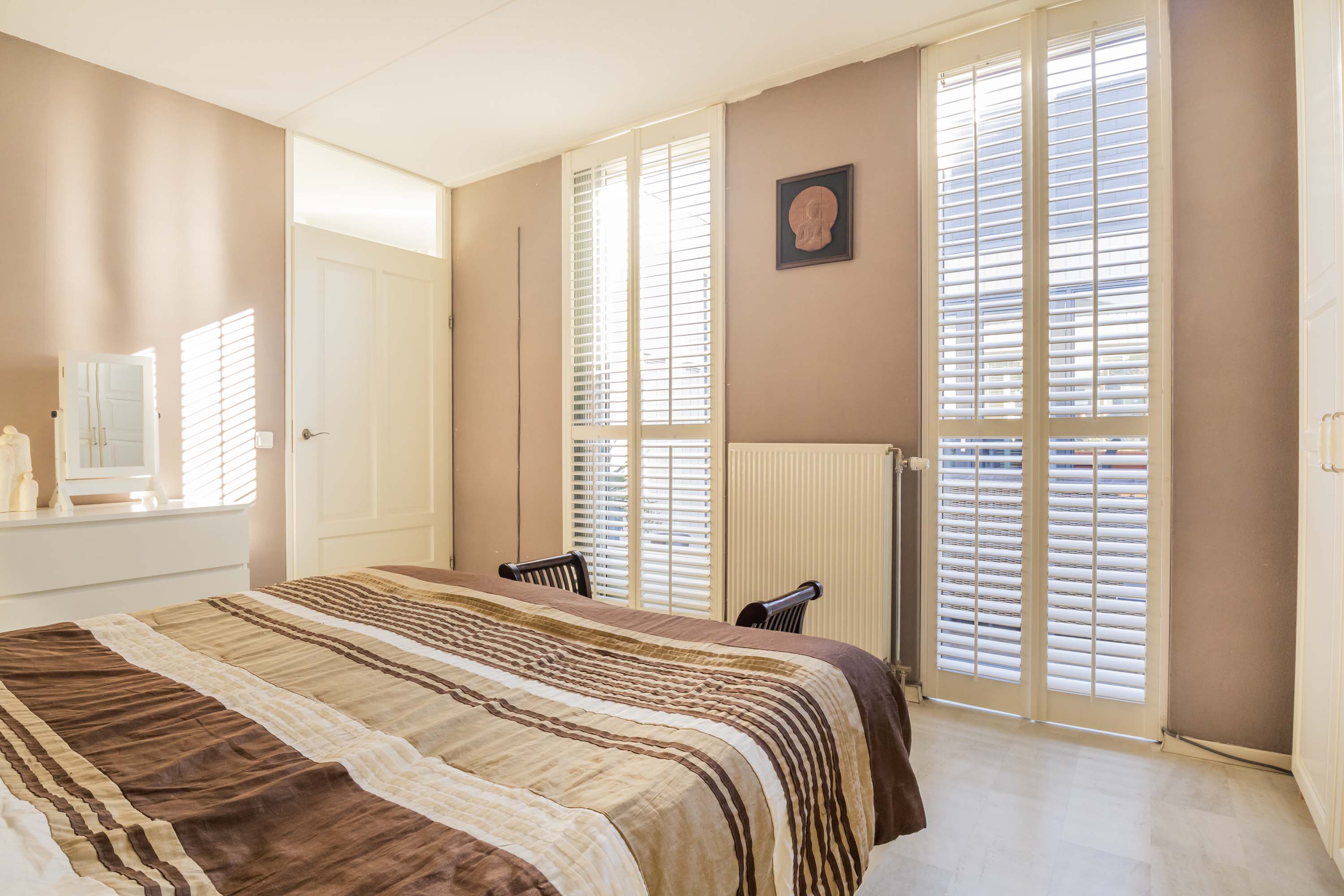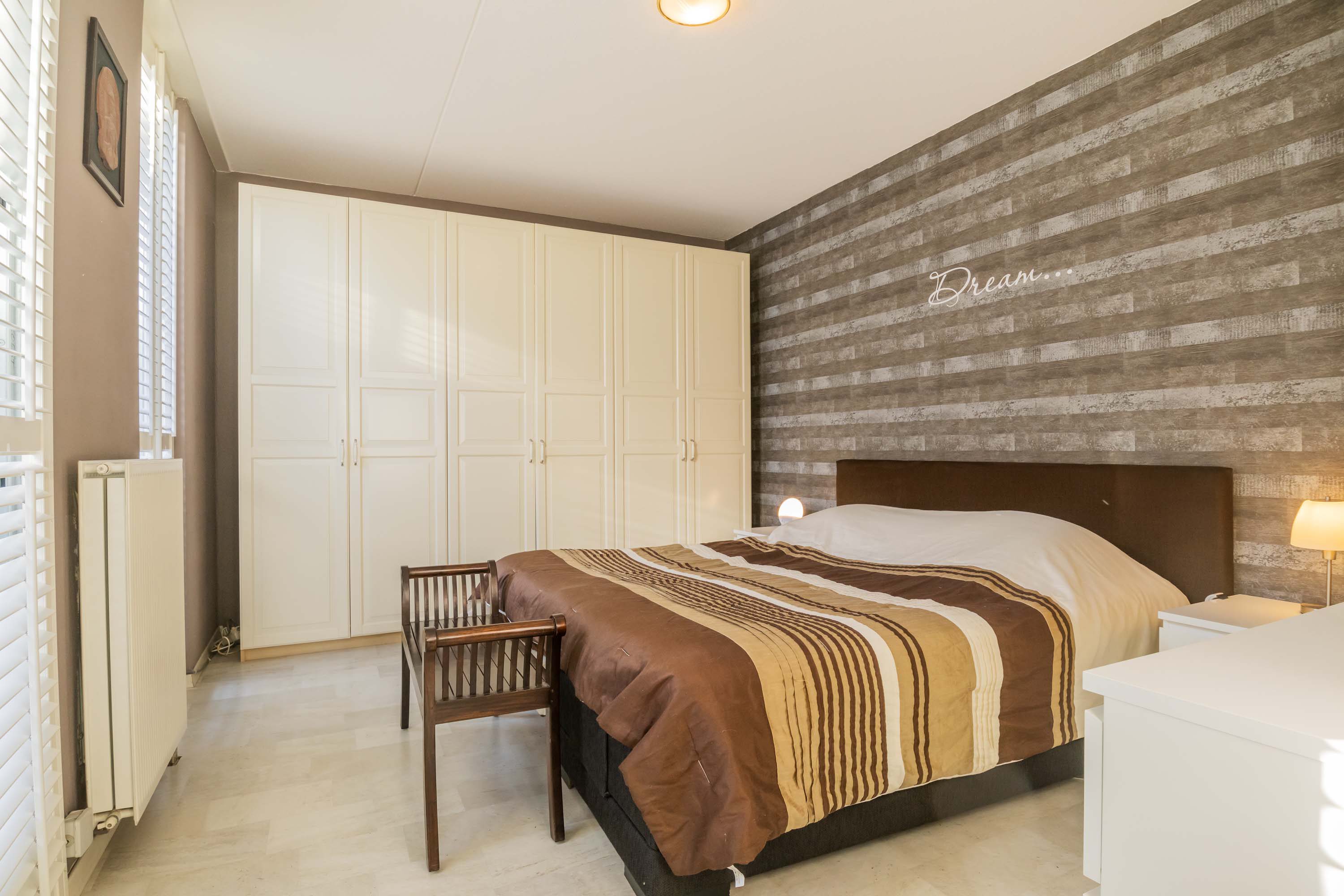 Vanuit de woonkamer/keuken loop je een gang in met ook veel daglichtinval door de vele raampartijen, vanuit deze gang is er toegang tot een ruime slaapkamer en een tweede slaapkamer die thans in gebruik is als kantoor en de in 2023 volledig vernieuwde badkamer. De grootste slaapkamer is praktisch en ruim en is voorzien van een deur naar de patio. De recente compleet fraai gerenoveerde badkamer is voorzien van een inloopdouche, wastafelmeubel en een wandcloset.