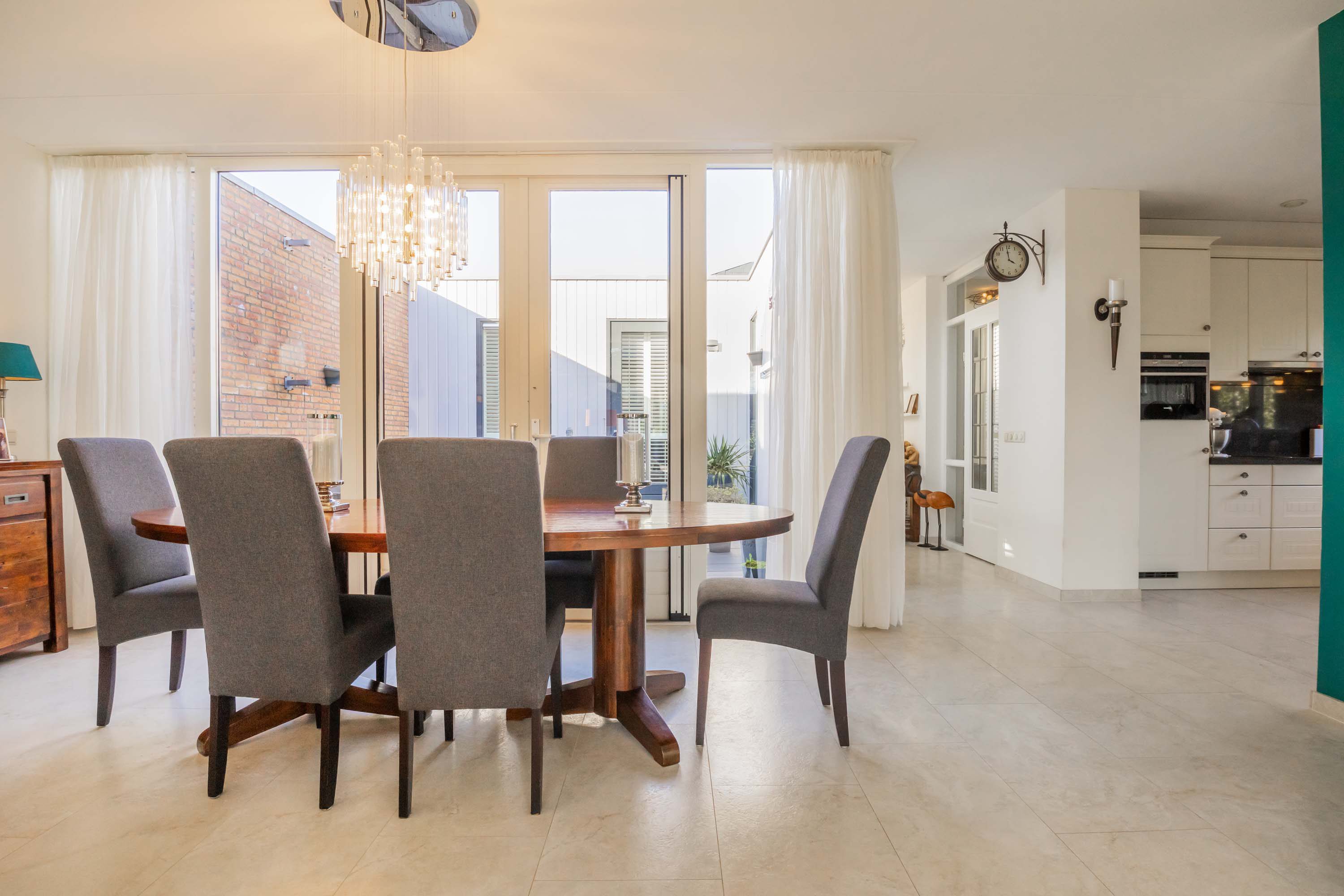 Door de prettige indeling is er ruimte genoeg voor een grote eettafel en ontstaat er een gezellige verbinding tussen de woonkamer en de keuken. De open keuken is voorzien van een in hoekopstelling geplaatste luxe inbouwkeuken met lichte kastfronten en een antraciet kleurig granieten aanrechtblad. Deze complete keuken is uitgerust met een spoelbak, vaatwasser, inductie kookplaat, afzuigkap, combimagnetron en koelkast. Direct vanuit de keuken heb je toegang tot de inpandige garage/berging, die voorzien is van een kanteldeur en een tuindeur. In de garage is tevens de opstelling van de was-apparatuur.