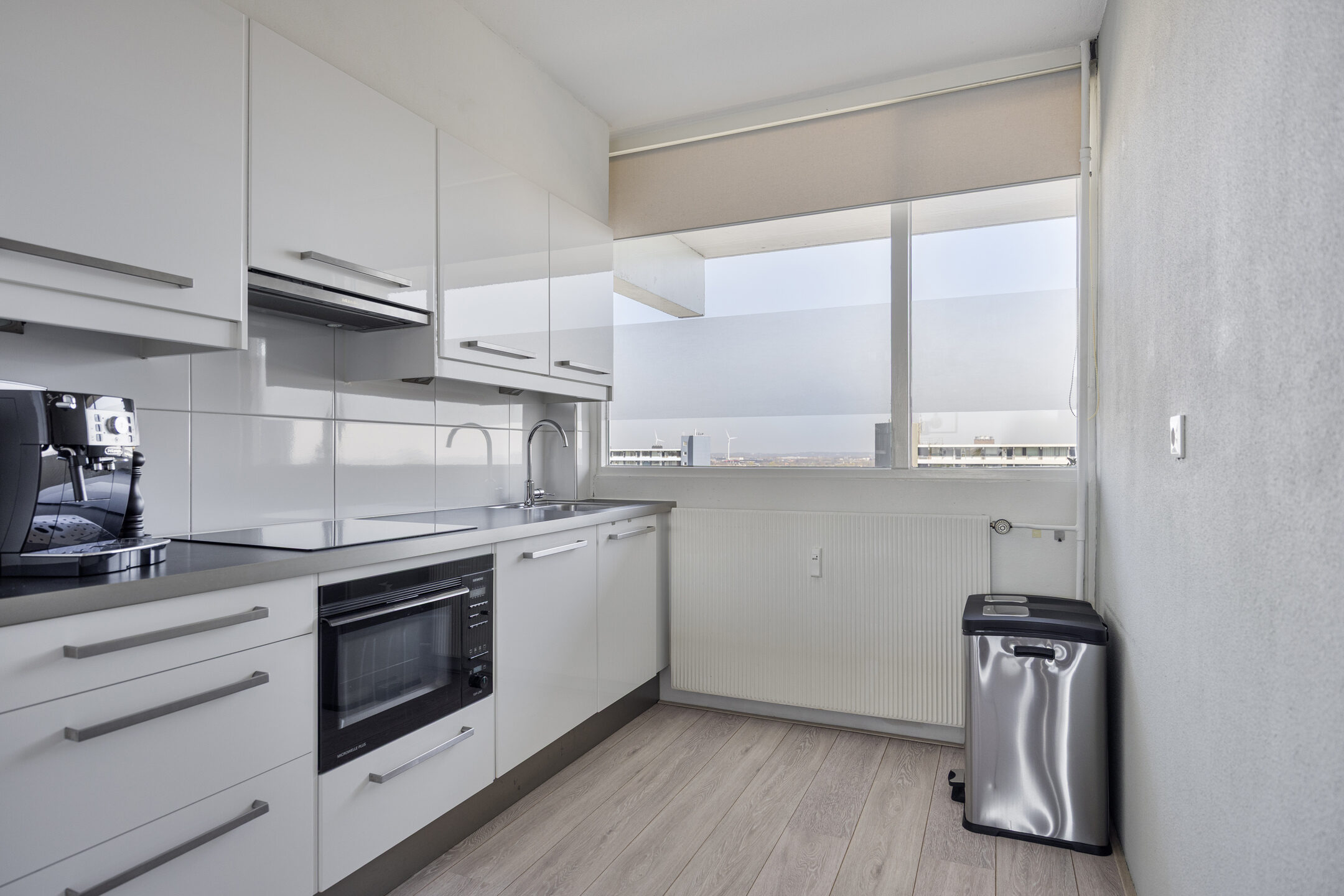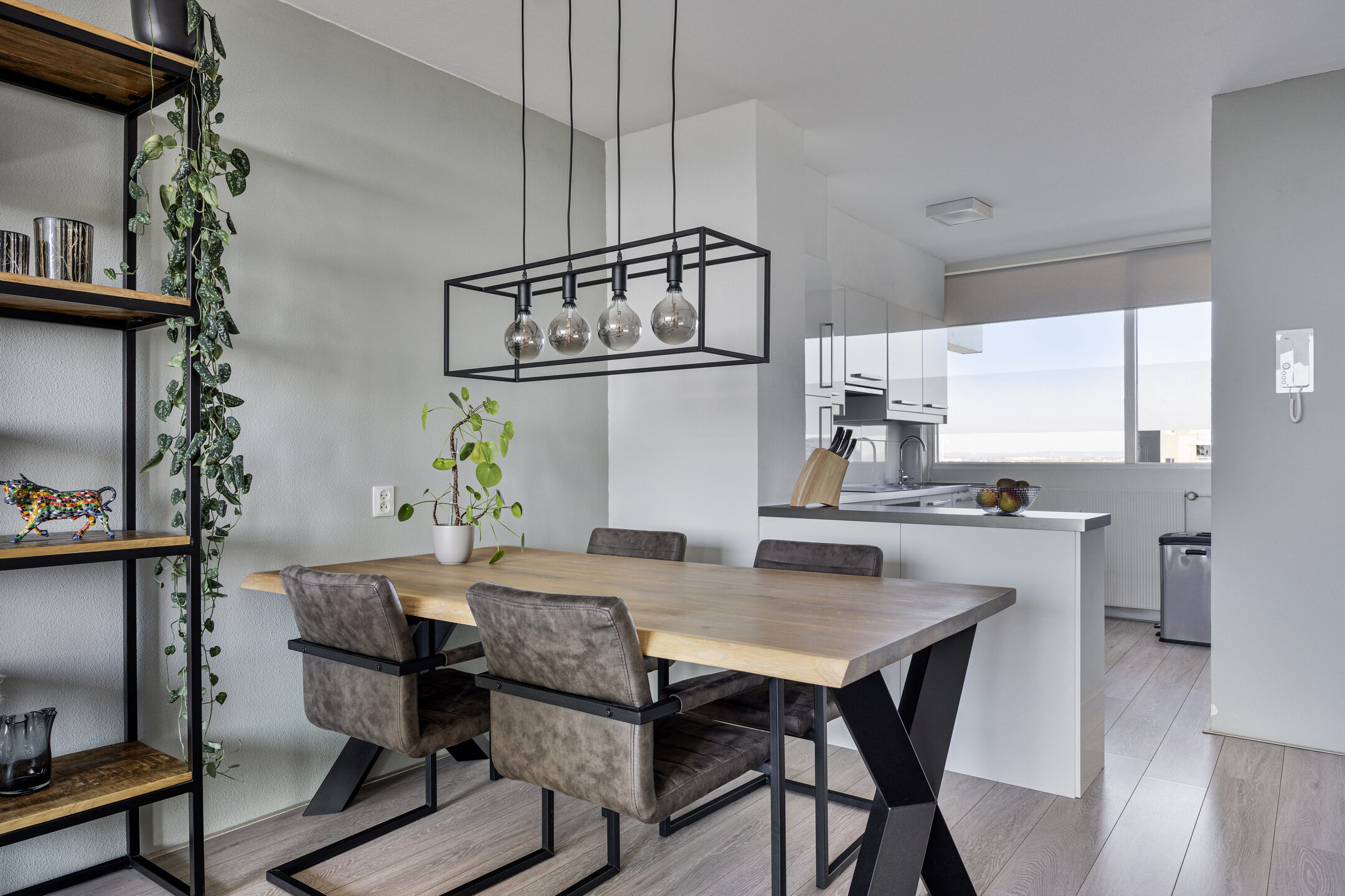 Via de entree, waar zich ook de meterkast bevindt, stap je de ruime woonkamer binnen met ruimte voor een riante zithoek. Centraal in de ruimte ligt het eetgedeelte, geschikt voor een grote eettafel. De halfopen keuken is uitgevoerd met hoogglans witte kasten en een antracietgrijs werkblad, en is voorzien van een inductiekookplaat, afzuigkap, combimagnetron, vaatwasser en koelkast.