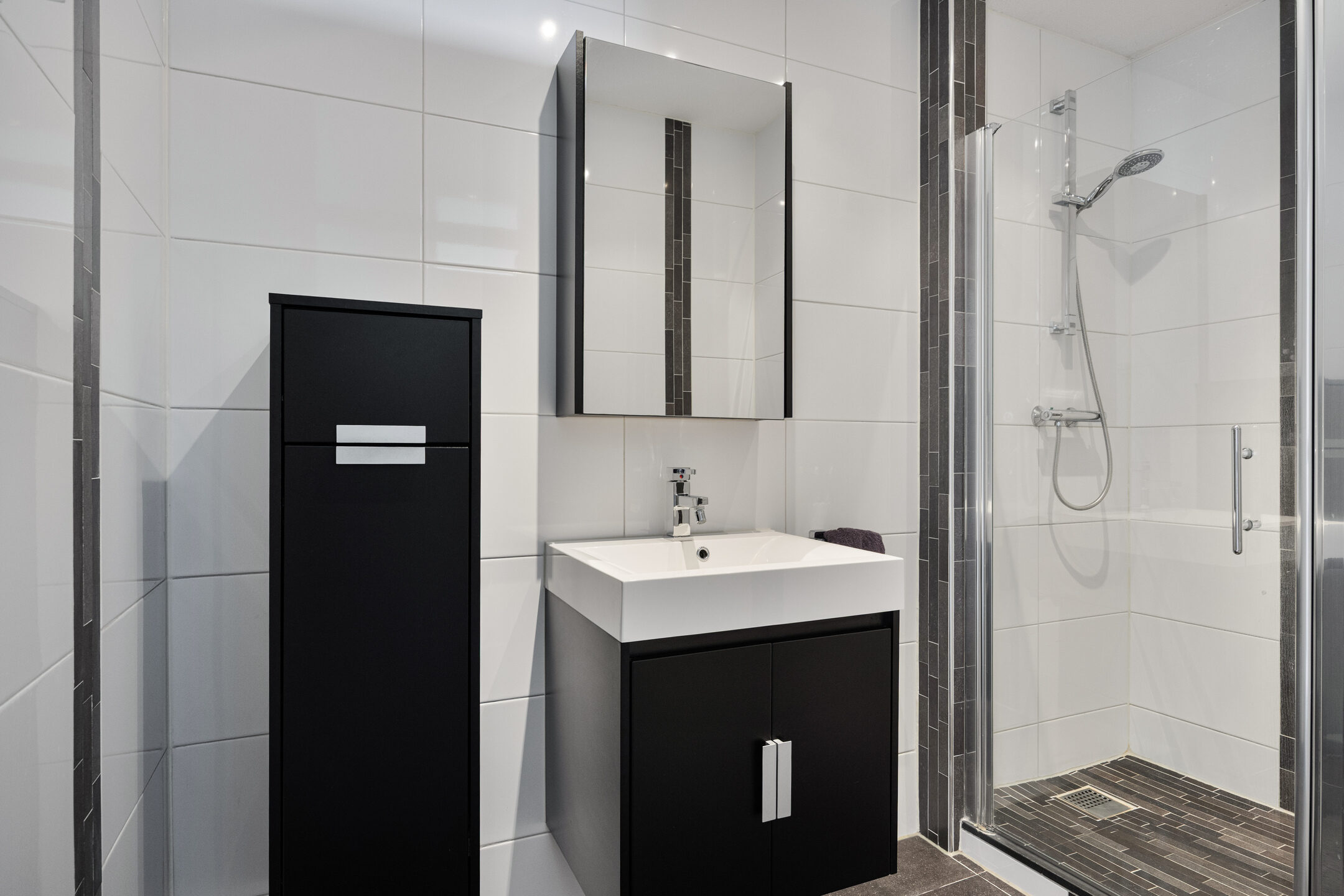 De moderne badkamer van 3,5 m² is ingedeeld met een ruime douche, wastafelmeubel, spiegelkast en een zwarte badkamerkast. Het naast gelegen toilet is uitgerust met witte tegels en een fonteintje.