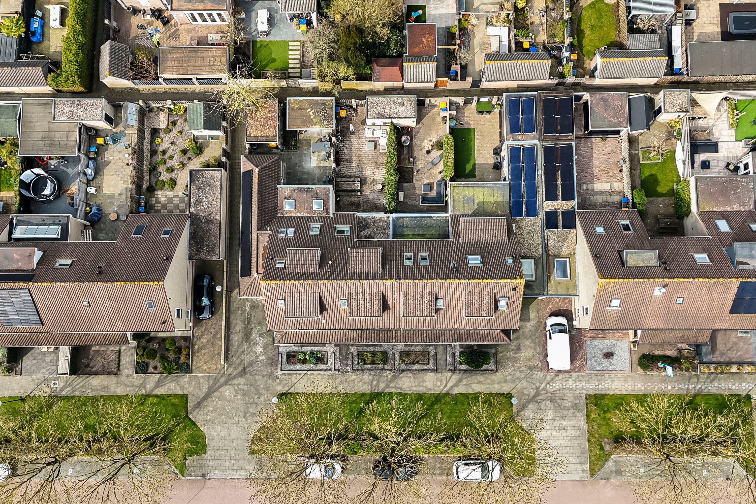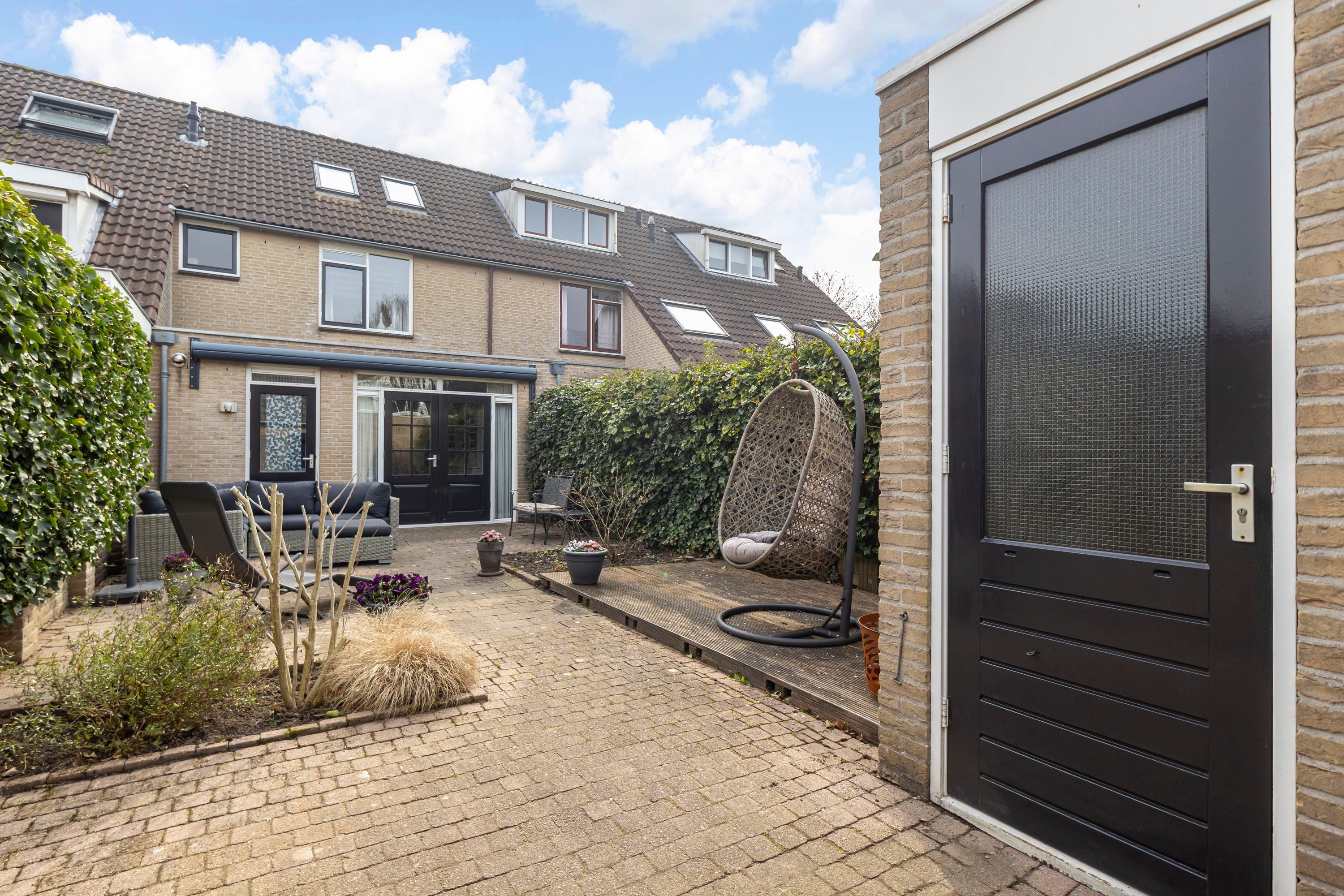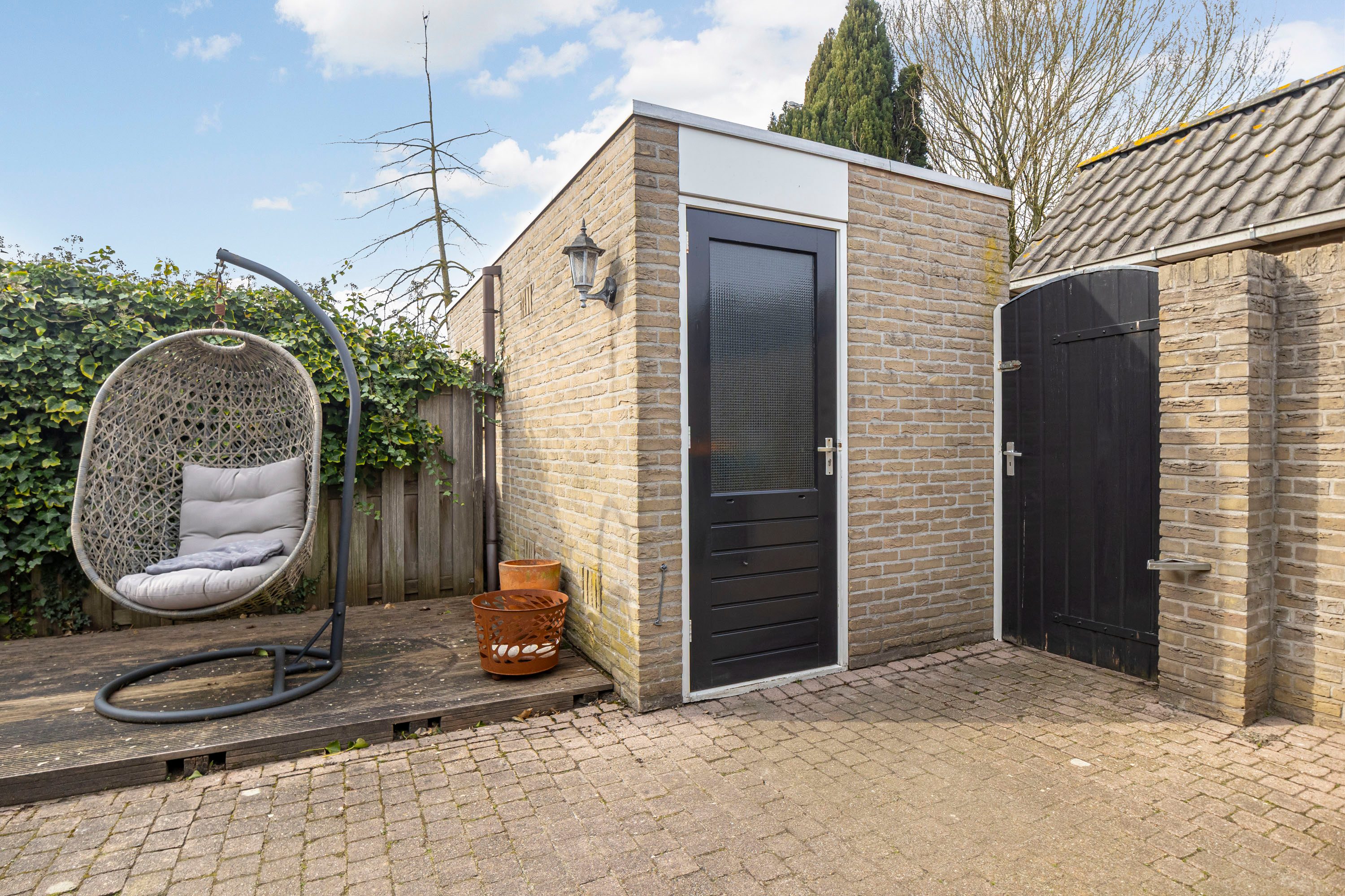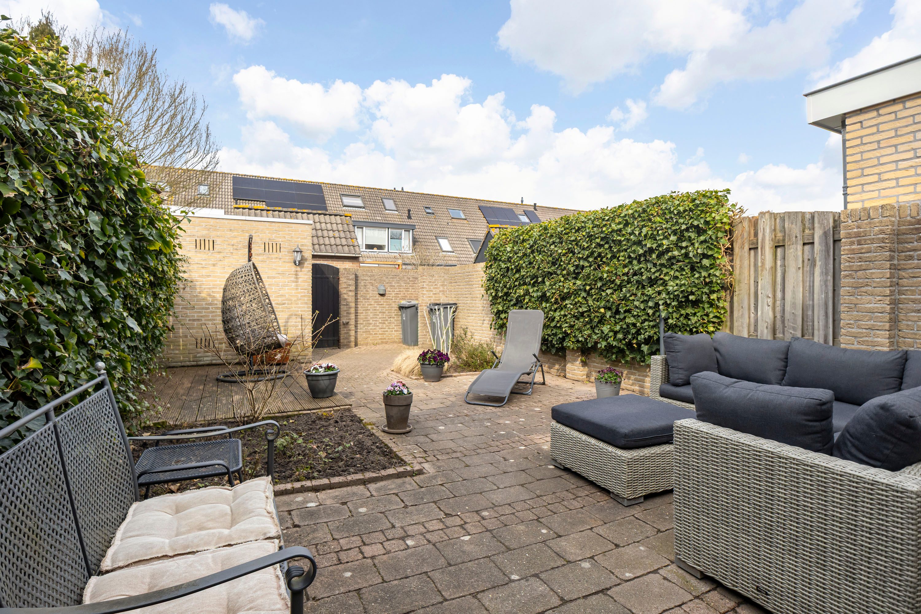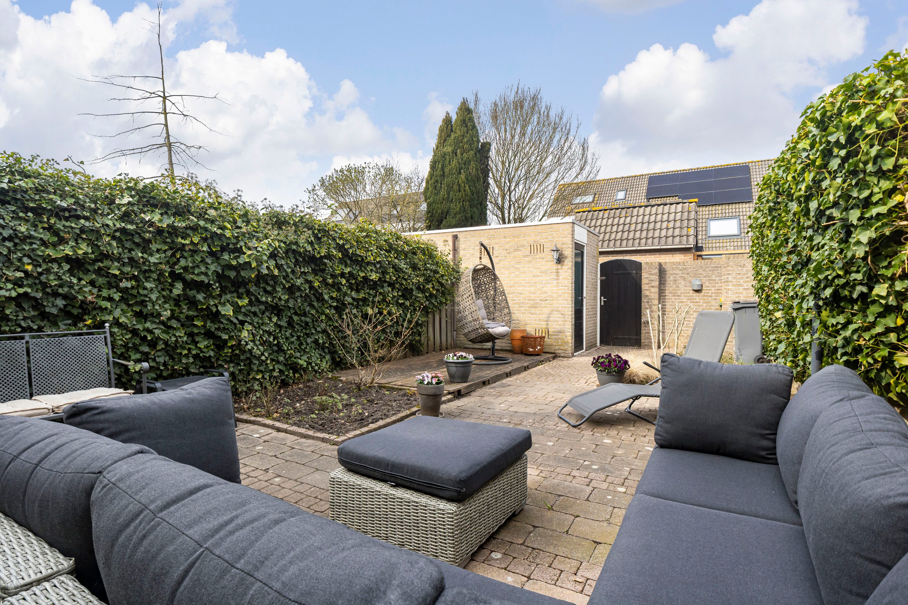De achtertuin is gelegen op het westen, wat betekent dat je hier de hele dag kunt genieten van de zon. Door de afstand tot de achterburen ervaar je bovendien veel rust en privacy. Via de openslaande deuren loopt de woonkamer naadloos over in de tuin — ideaal voor lange zomerdagen en gezellige avonden buiten. Achterin de tuin bevindt zich een berging van circa 5 m² met elektra en er is een handige achterom aanwezig. Ook de voortuin is netjes aangelegd en geeft de woning een verzorgde uitstraling.