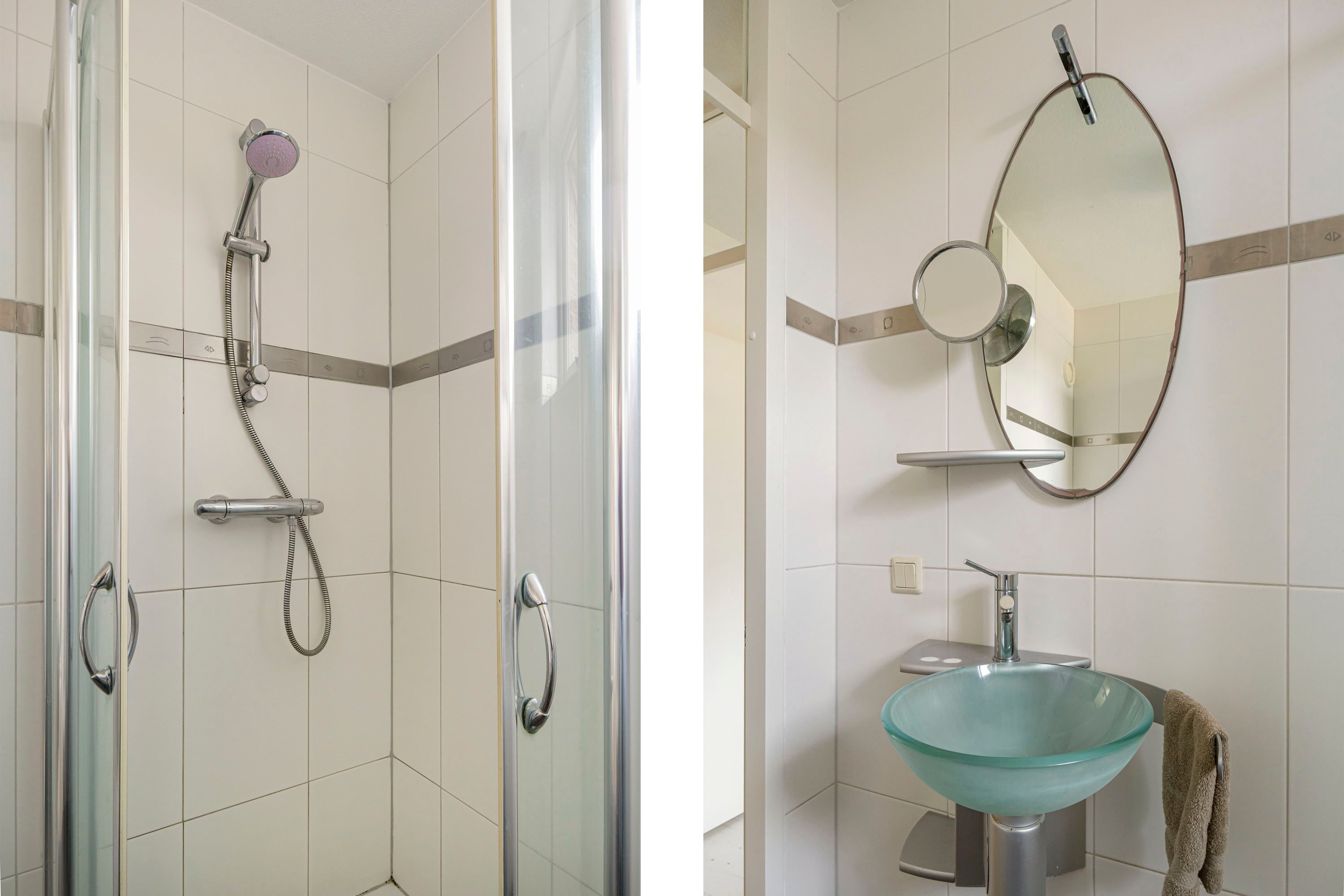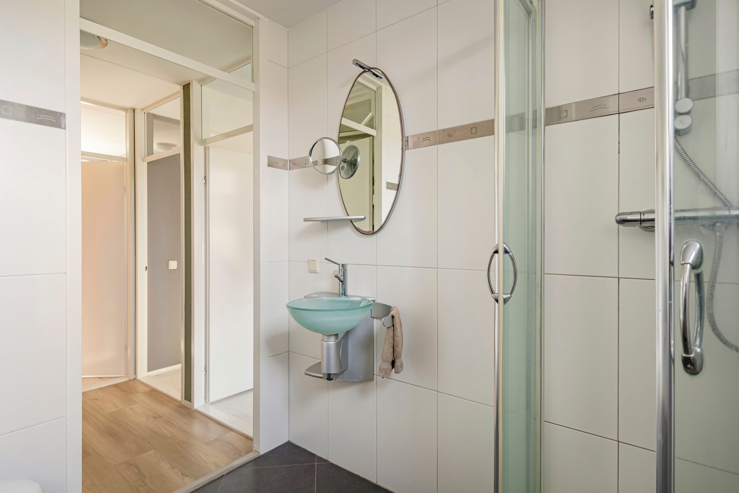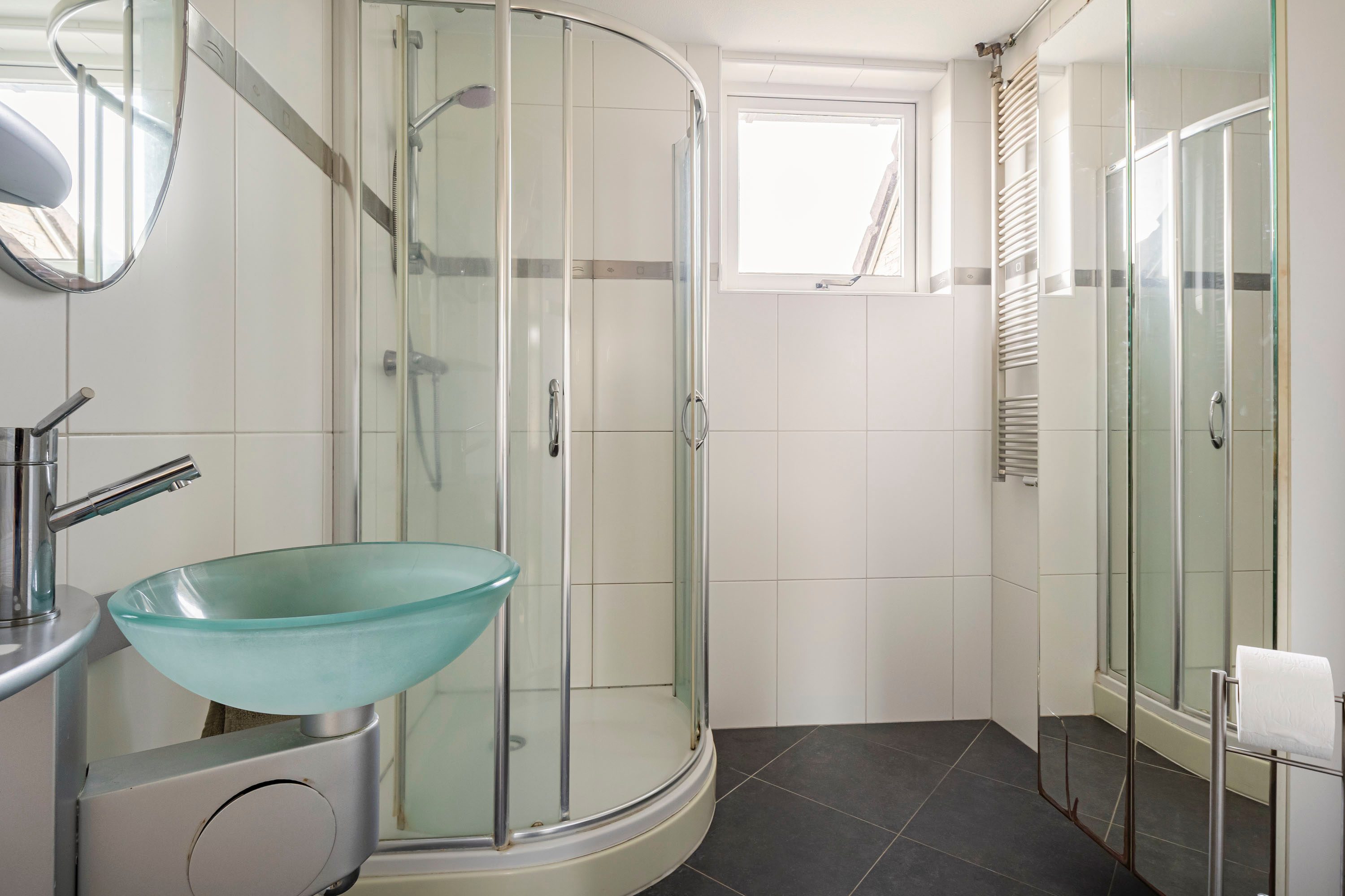 De badkamer is netjes en functioneel ingericht en voorzien van een douche, wastafel en tweede toilet, alles wat je nodig hebt voor een comfortabele start van de dag.