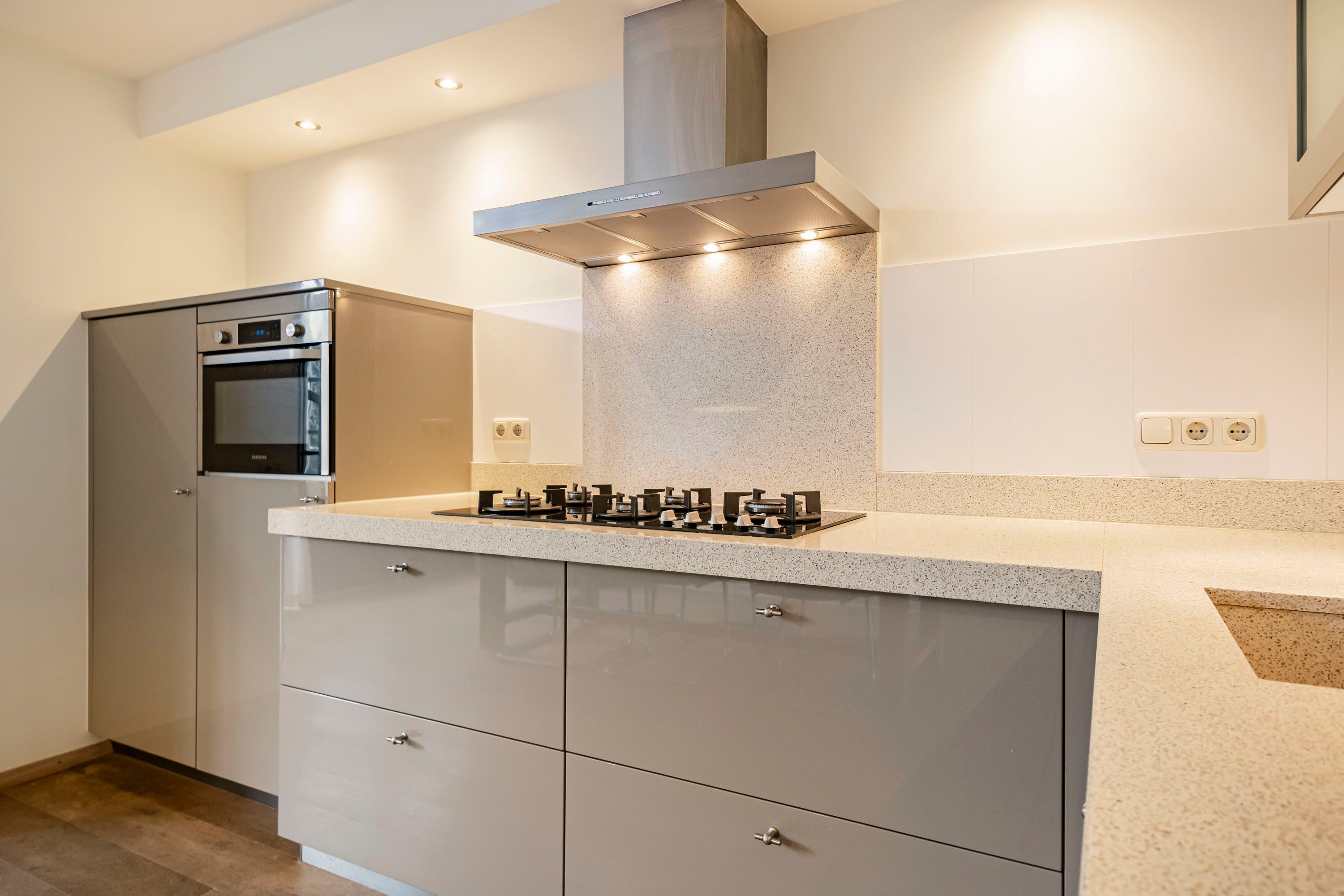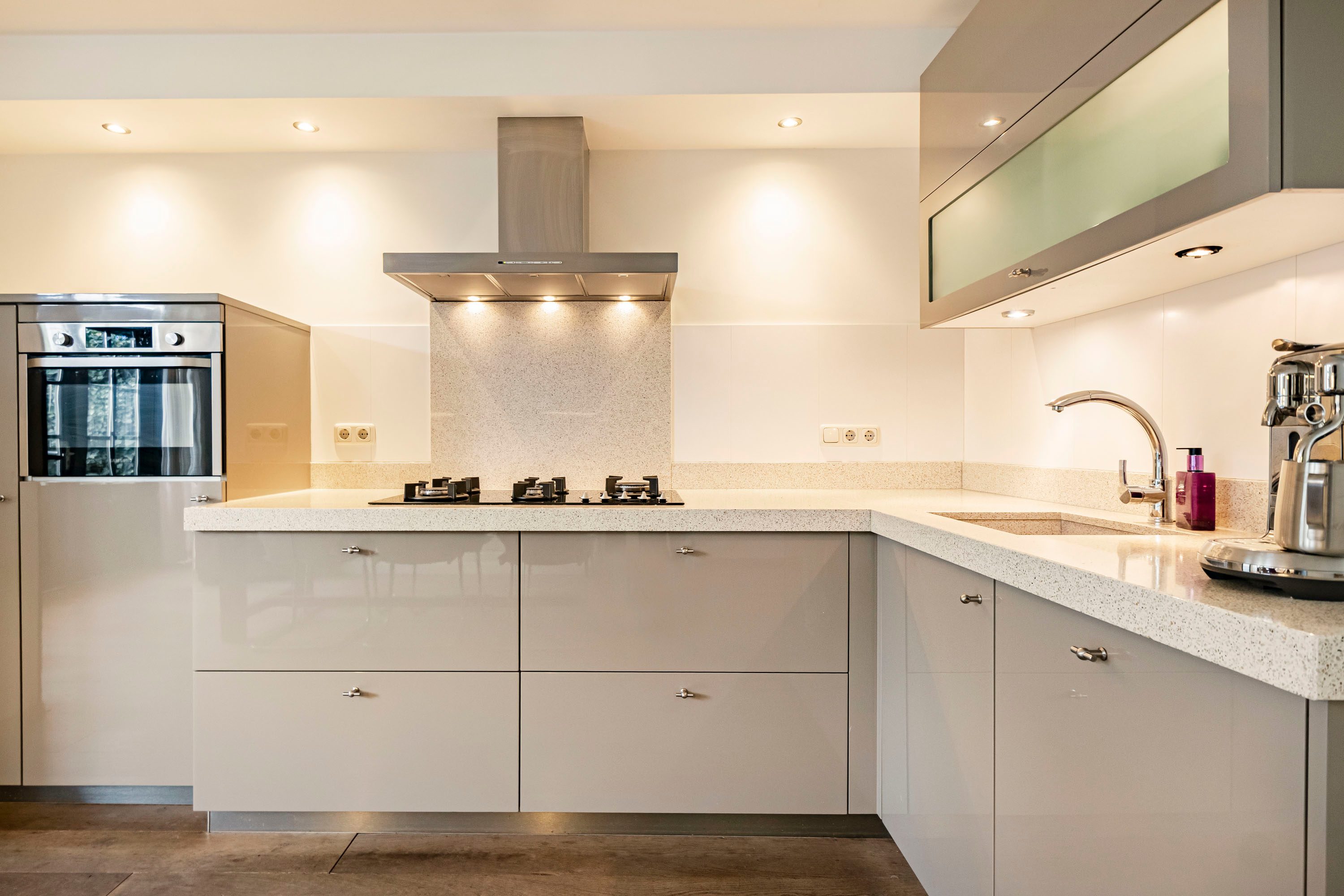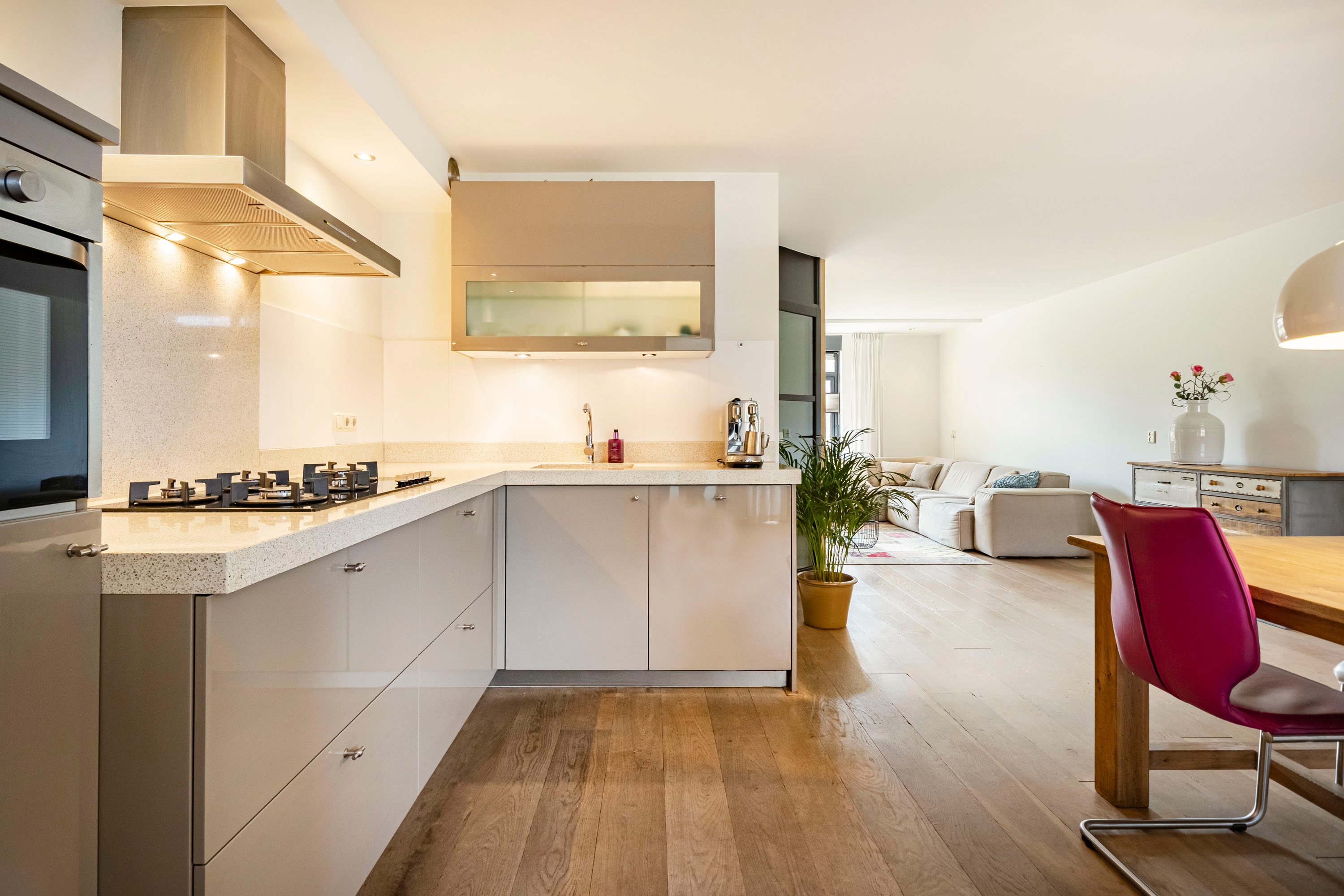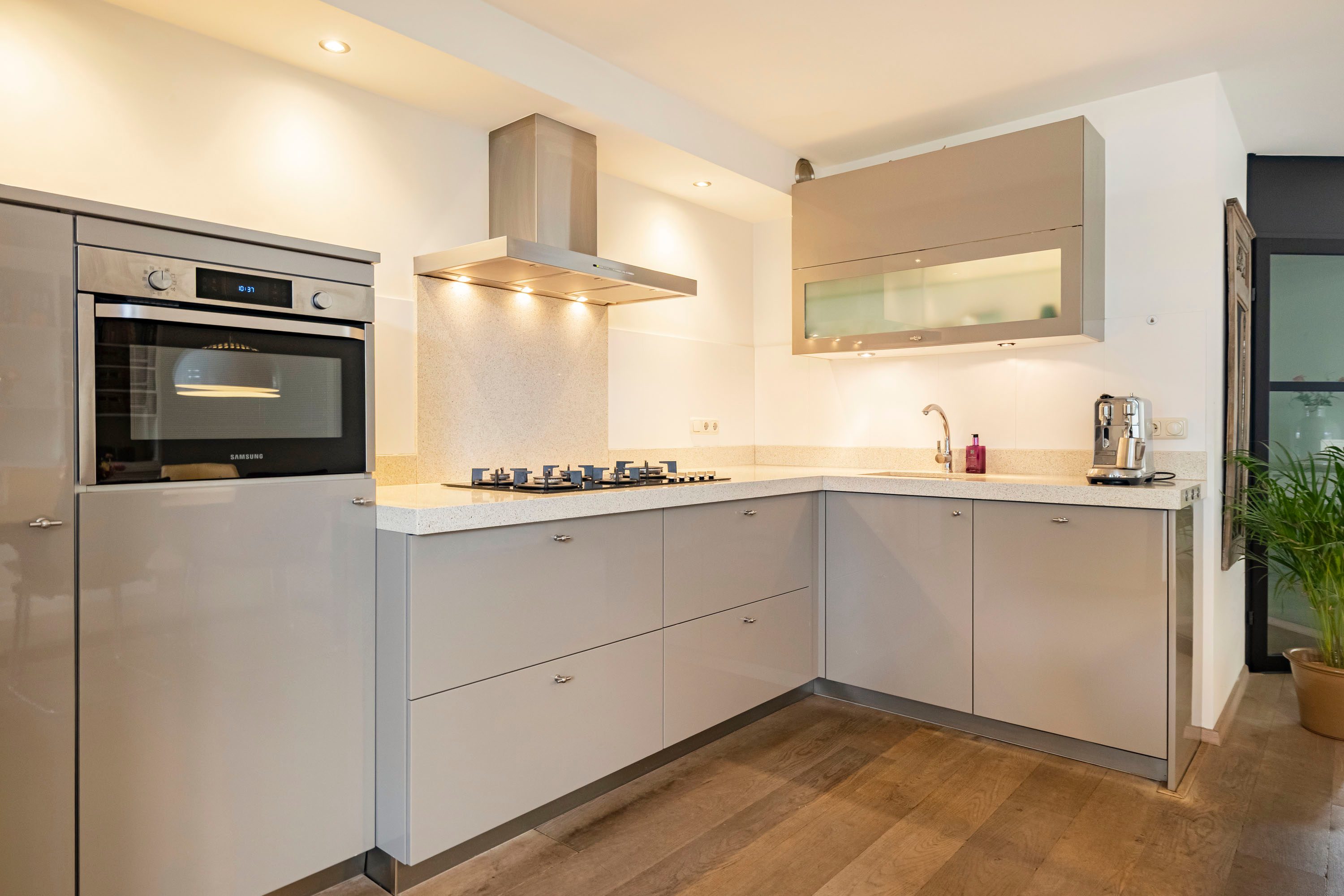 De keuken staat in open verbinding met de leefruimte en heeft een moderne uitstraling. Diverse apparatuur is de afgelopen jaren vernieuwd, waaronder de koelkast (2015), oven (2017), gaskookplaat (2025) en vaatwasser (2025). Hierdoor combineert de keuken een frisse uitstraling met praktisch gebruiksgemak.