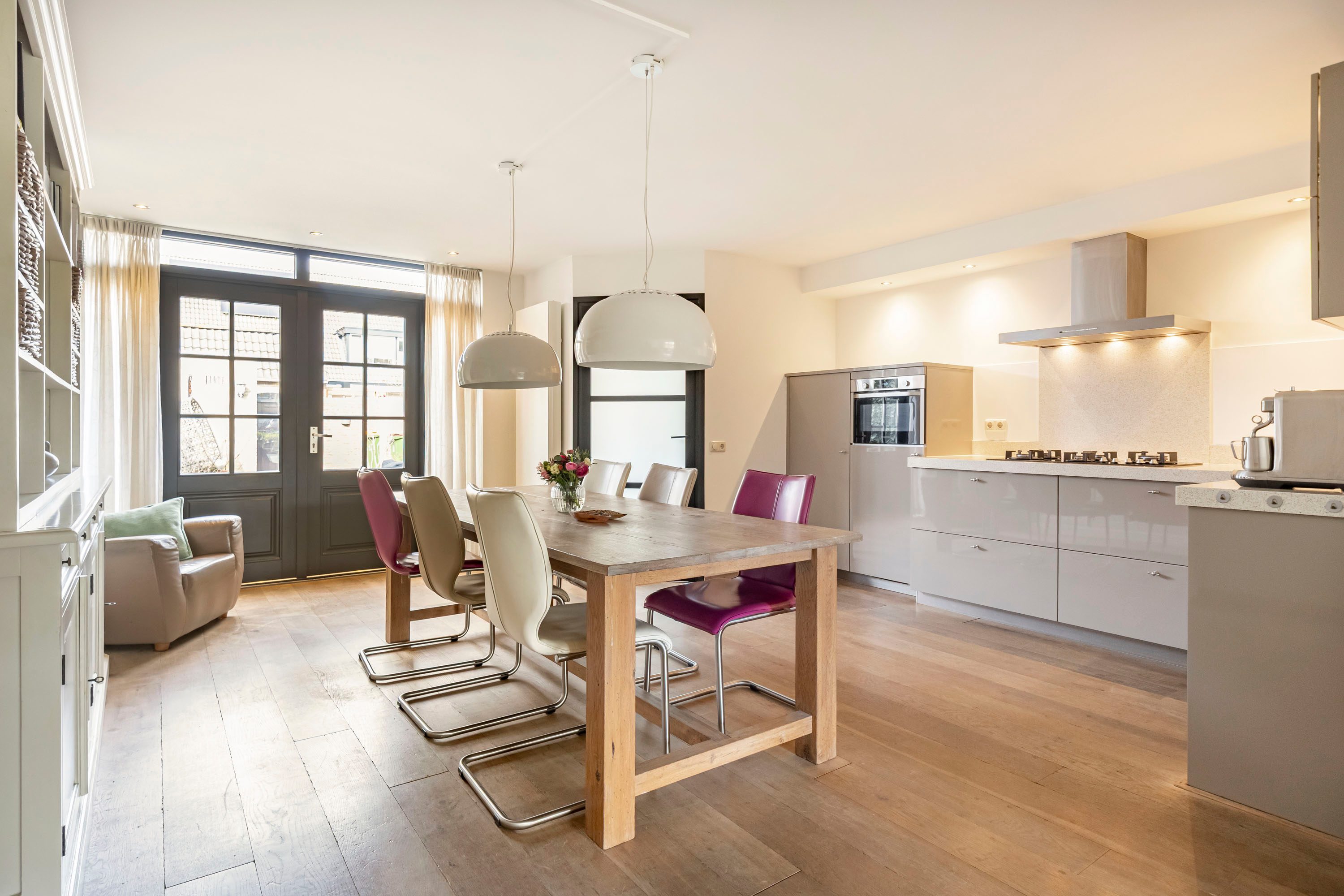 De uitgebouwde woonkamer van circa 39 m² biedt volop mogelijkheden voor een royale zithoek en een grote eettafel. De openslaande deuren zorgen voor een fijne verbinding met de tuin en laten veel daglicht binnen, wat de ruimte extra prettig maakt.