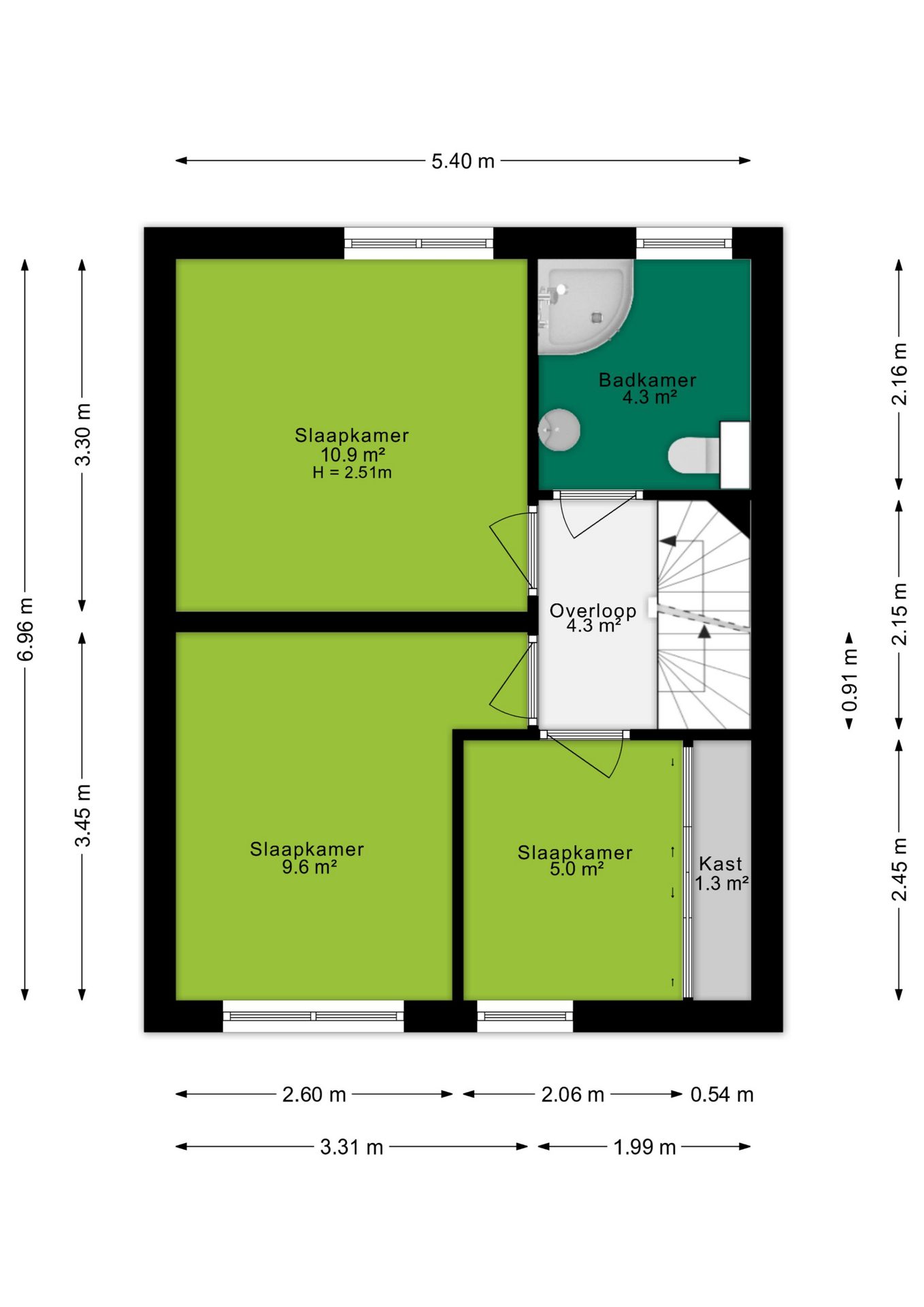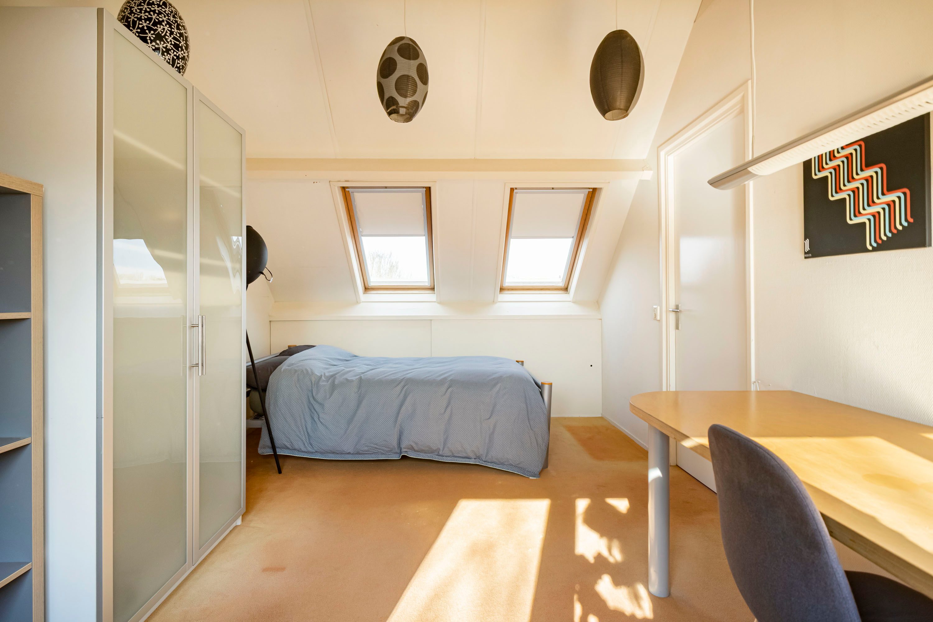 Op de eerste verdieping vind je drie slaapkamers van circa 11 m², 10 m² en 5 m². Alle kamers zijn prettig licht en praktisch in te delen, waardoor je hier moeiteloos meerdere slaapkamers, een thuiswerkplek of een combinatie daarvan realiseert. De grotere kamers bieden volop ruimte voor een comfortabel bed en kastruimte, terwijl de derde kamer perfect is als kinder-, werk- of hobbykamer. Ideaal voor gezinnen of voor wie flexibel wil wonen.
