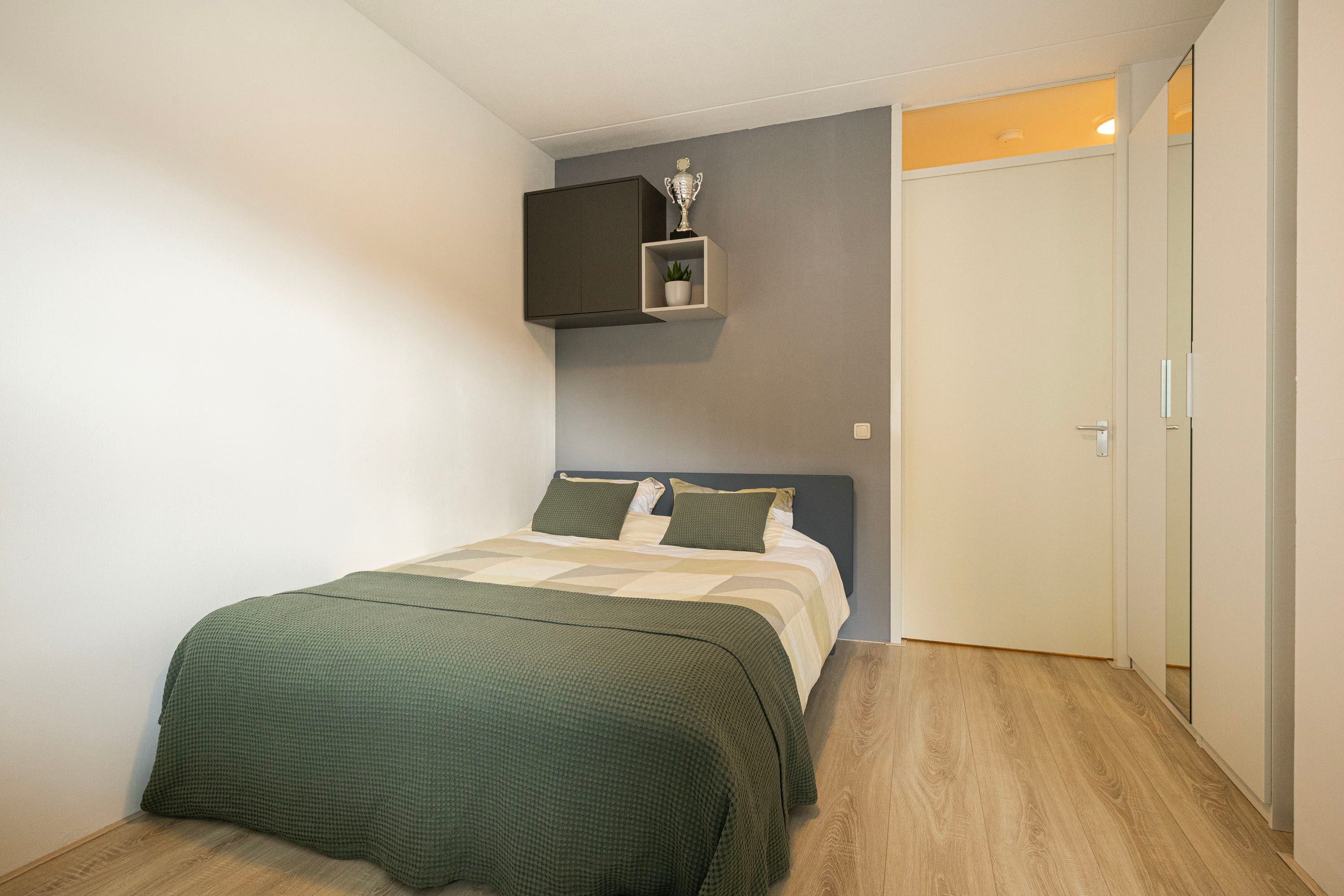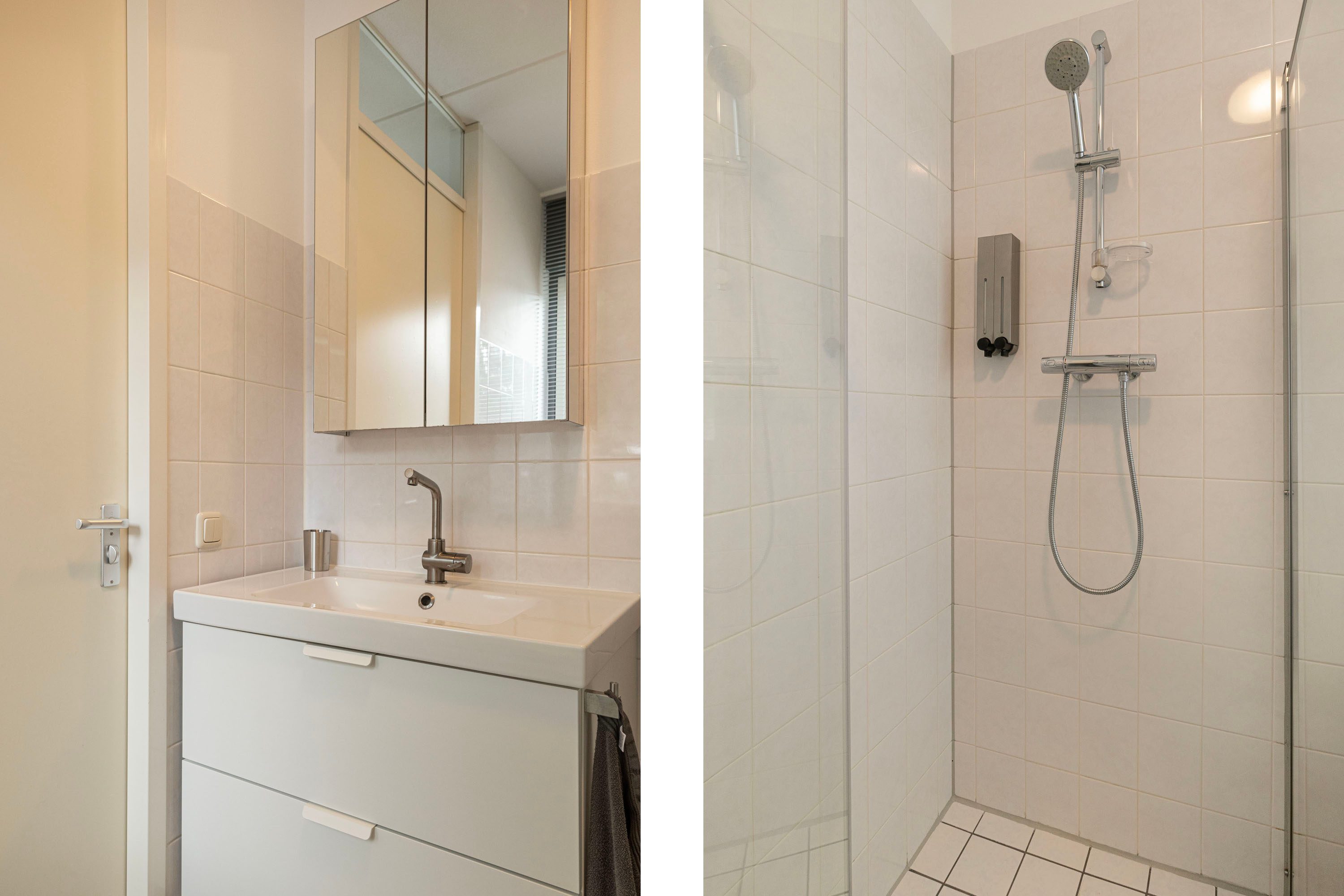 Via de vaste trap bereik je de eerste verdieping, waar je een fijne slaapkamer van ongeveer 12m² treft. Vanuit de slaapkamer heb je toegang tot de badkamer. Deze is compleet uitgerust met een wastafel met meubel, een inloopdouche én een wasmachineaansluiting.