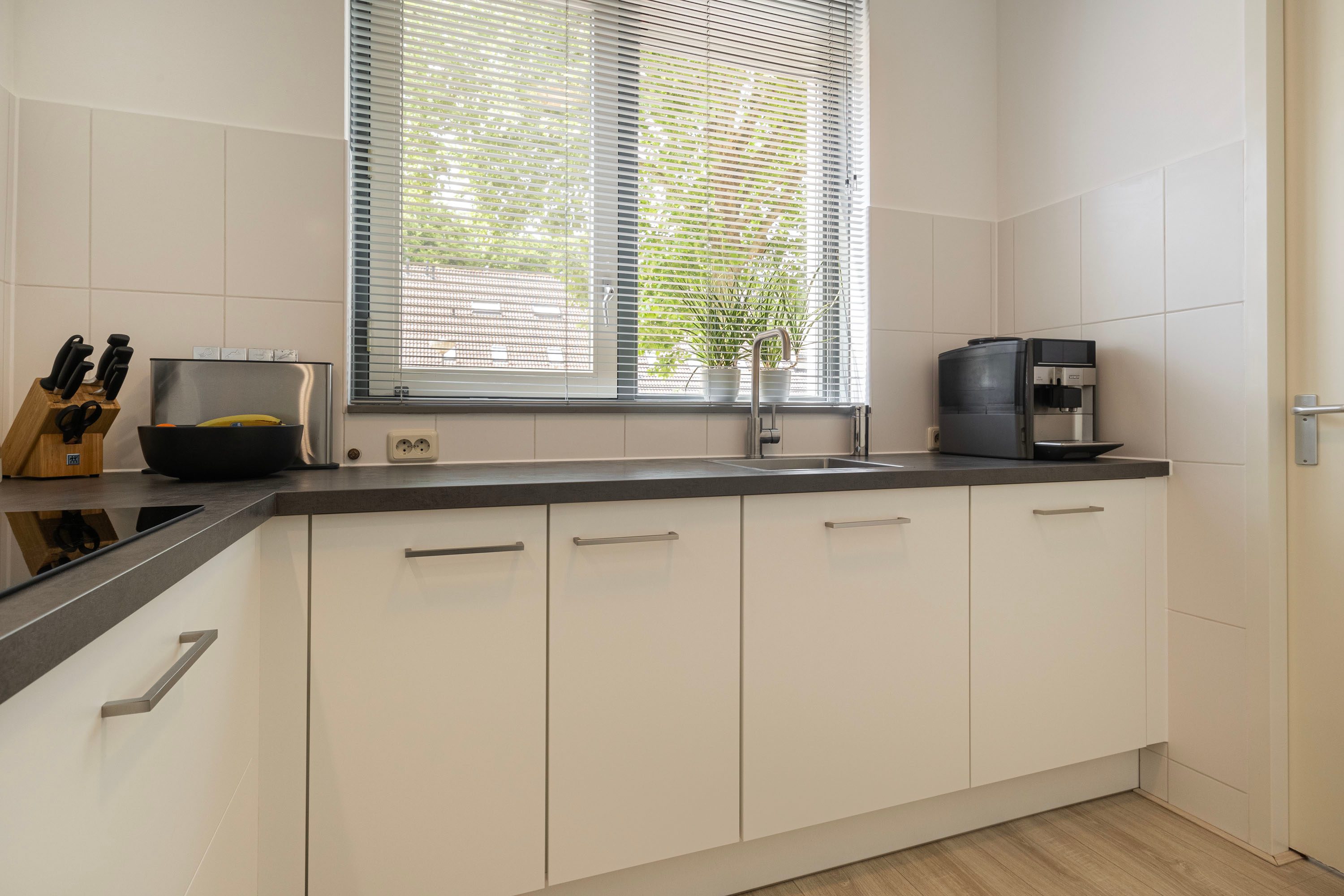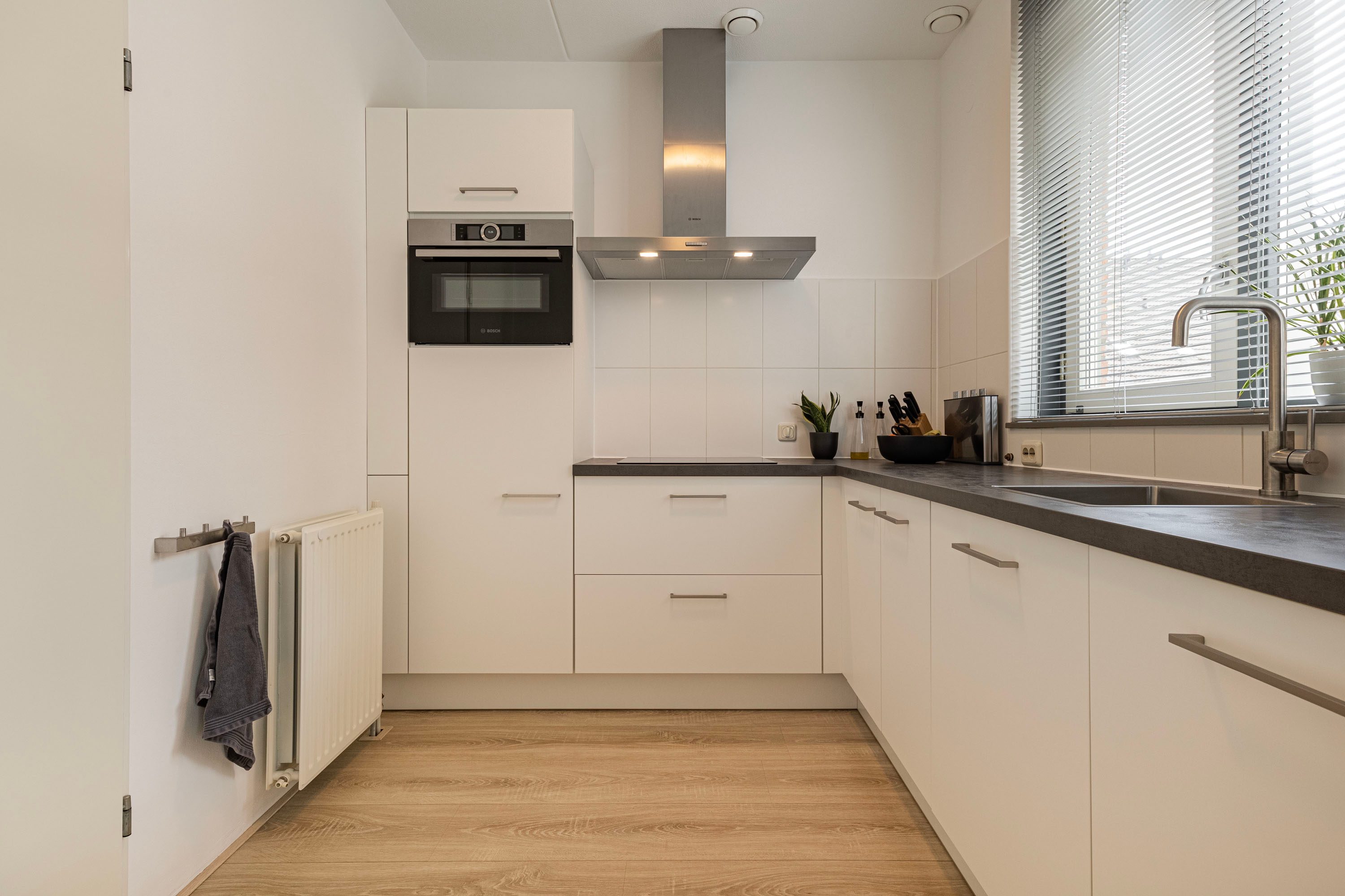 Aan de voorzijde van de woning vind je de stijlvolle keuken in een praktische L-opstelling met moderne apparatuur, waaronder een inductieplaat, vaatwasser, combi-oven en een koelkast.